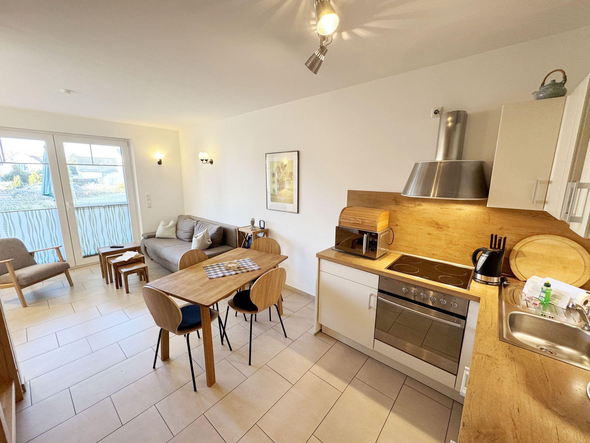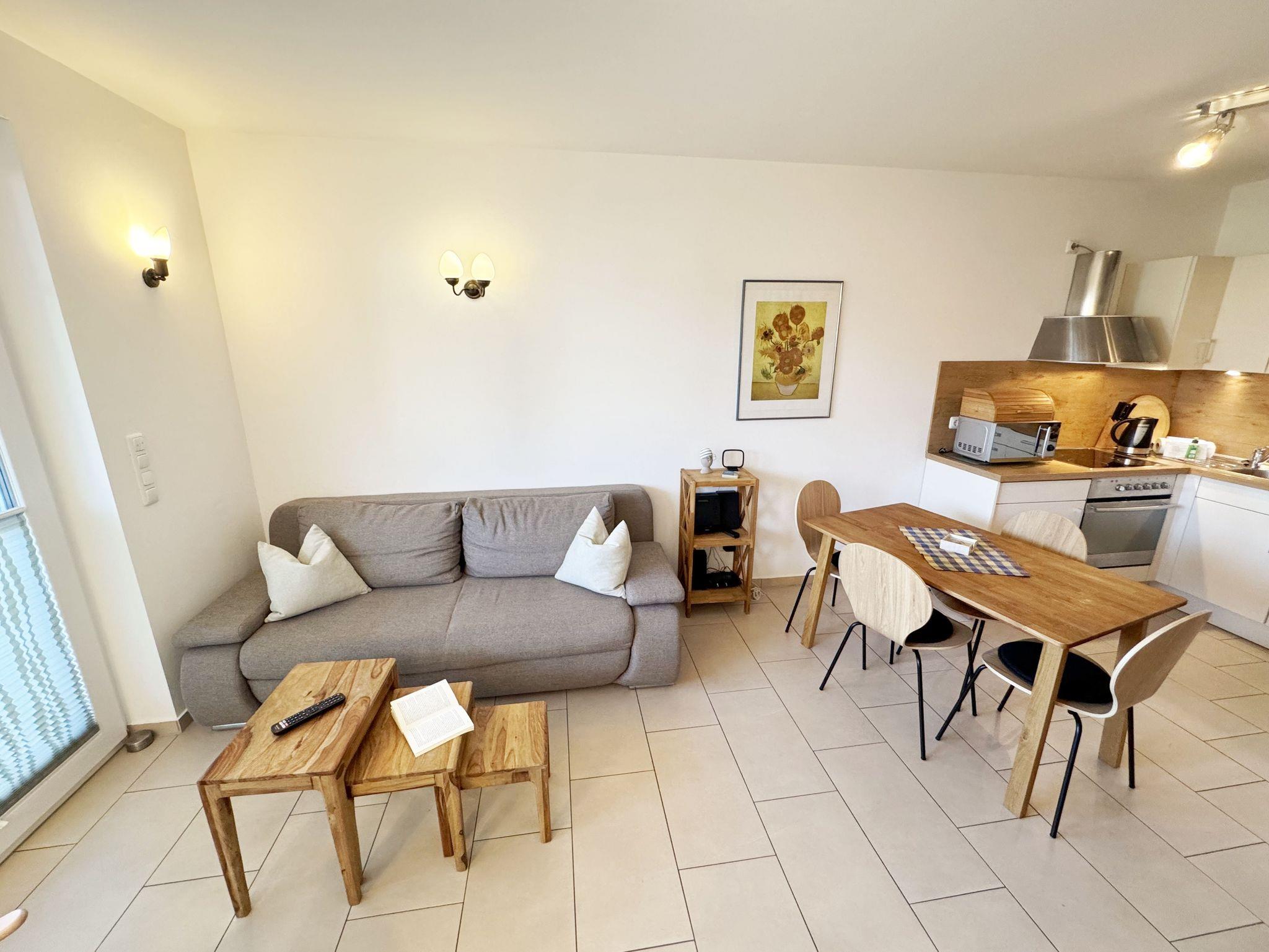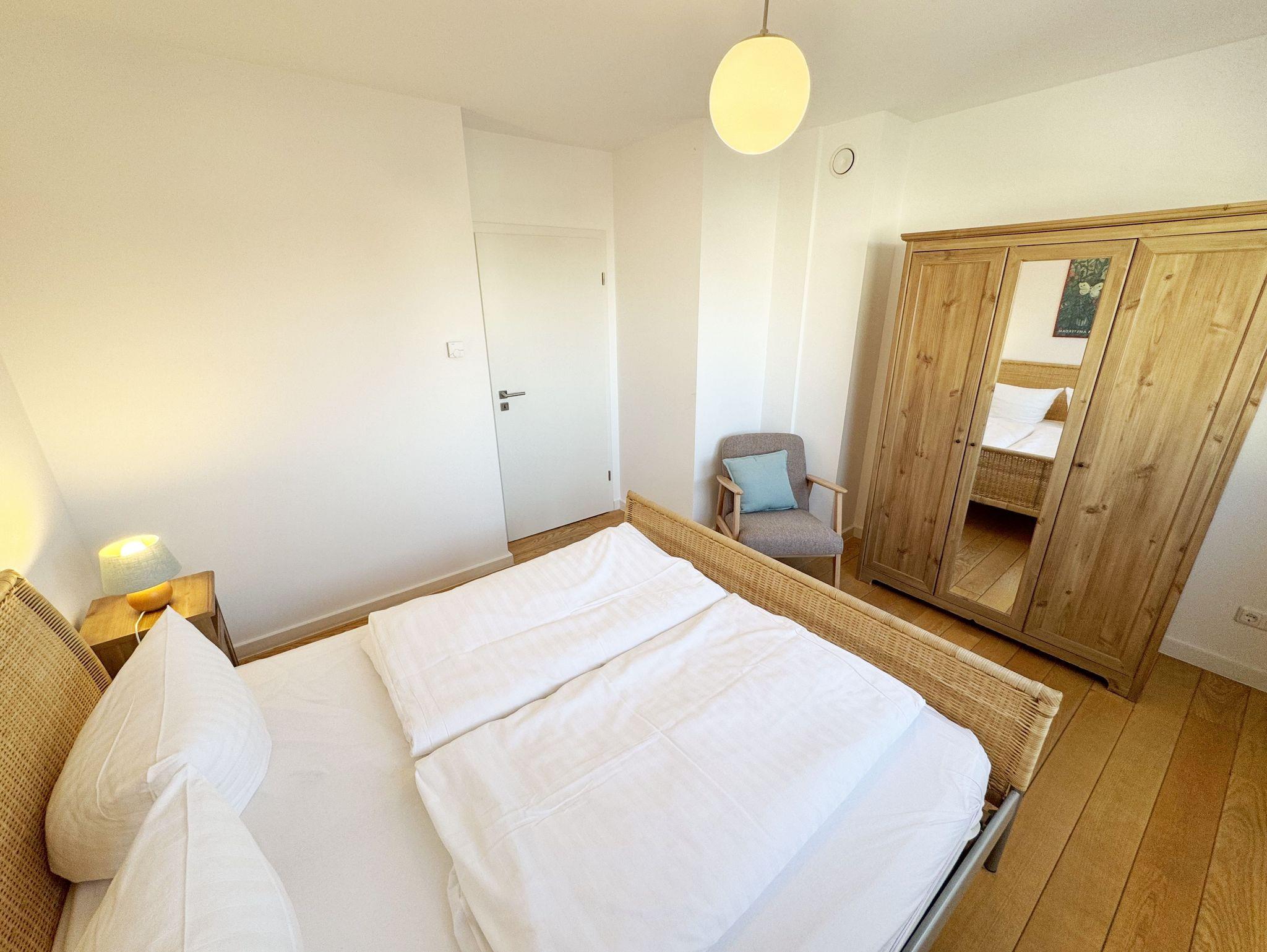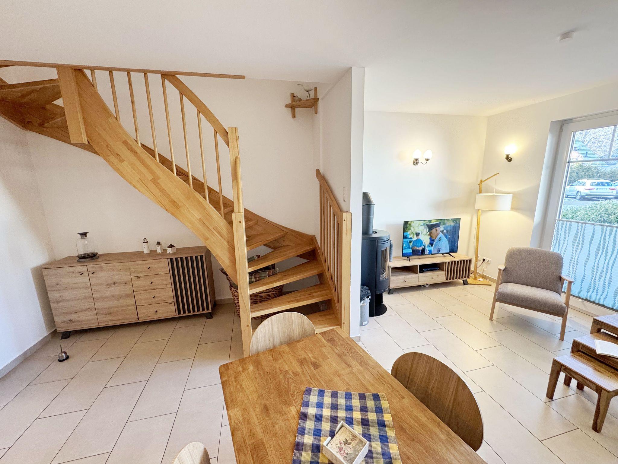Im Haus „Möwe“ befindet sich die helle und gemütliche Zweizimmerwohnung (Nichtraucher) im Erdgeschoss und ist vom Privatparkplatz bequem zu erreichen. Die Maisonette Wohnung Nr. 02 verfügt auf 56 qm über allen Komfort, den man von zuhause gewöhnt ist und ist für 2 bis 4 Personen ausgerichtet. Von einem kleinen Flur mit Garderobe gelangt man in den hellen unteren Bereich der Wohnung. Sogleich fällt der Blick auf die geräumige Terrasse (westliche Ausrichtung), die mit einer Sitzgruppe + Sonnenliege für vier Personen und einem Sonnenschirm zum ruhigen Verweilen einlädt. Die gesamte untere Etage ist gefliest und mit einer Fußbodenheizung ausgestattet. Der untere Wohnbereich verfügt über eine bequeme Couch (1,50m x 2,00m), die auch als zusätzliche Schlafgelegenheit genutzt werden kann. Ein bequemer Sessel mit Leselampe vervollständigt das Ensemble. Kleine Beistelltische bieten immer eine Ablage, sodass man bei einem Kaffee oder einem Glas Wein eine entspannte Unterhaltung führen kann. Für die kälteren Tage ist ein Kaminofen vorhanden, der durch ein Sichtfeld das Kaminfeuer betrachten lässt. Je nach Bedarf kann man eine Stereoanlage nutzen, die neben Radio und CD-Laufwerk auch die Möglichkeit bietet, die eigene Musik vom iPod oder einem USB-Stick abzuspielen. Mit dem TV-Flat Screen mit DVD-Player kann man ruhig mal einen kleinen Filmabend gestalten. Um die Sache abzurunden, befindet sich in der Holzkommode eine reichhaltige DVD-Sammlung mit bekannten Filmen, die für Jung und Alt sicherlich etwas zu bieten hat. Auch im Urlaub brauchen Sie auf einen Internetanschluss (WLAN) nicht verzichten. Dieser ist für Sie inklusive. Die Küchenzeile lässt keine Wünsche offen. Neben einem Kühlschrank mit Gefrierfach und einem Kochherd mit Ceranfeld und Backofen sind alle Dinge vorhanden (Kaffeemaschine, Wasserkocher, Toaster, Mikrowelle) die man zur Zubereitung eines leckeren Mahls nach dem Strandaufenthalt benötigt. Damit man sich nicht dem Leid des Abwaschens im Urlaub hingeben muss, kann man den eingebauten Geschirrspüler nutzen, der für einen die Arbeit leise und unaufdringlich erledigt. Der Essbereich ist mit einem Tisch ausgestattet, an dem bis zu vier Personen Platz finden. Über eine Holztreppe gelangt man in die erste Etage. Dort befindet sich das innenliegende Bad mit Dusche und WC, Spiegelschrank und Fön. Um auf den Balkon zu kommen, durchschreitet man das Schlafzimmer. Der Raum ist wie das gesamte Stockwerk mit einem hellen Holzfußboden ausgelegt und eine Fußbodenheizung sorgt zu jeder Jahreszeit für ein angenehmes Klima. Für die persönlichen Sachen steht ein Kleiderschrank zur Verfügung. Jeweils an den Seiten des großen Doppelbettes (einzelne Matratzen á 0,90 m) für zwei Personen befinden sich Nachttischkonsolen mit Nachttischlampen. Sollten Sie ihre Urlaubslektüre vergessen haben, sind einige Angebote in der Wohnung zu finden. Durch die elektrischen Rollos, die sich im unteren und im oberen Stockwerk befinden, genügt ein Knopfdruck, um eine ungestörte Nacht zu verbringen, bzw. am Morgen die Sonne ins Zimmer zu lassen. Fahrräder kann man in einem abschließbaren Schuppen Nr.02, der sich in unmittelbarer Nähe des Hauses befindet, unterstellen. Ein PKW-Stellplatz Nr. 02 befindet sich direkt am Haus. Gegen eine Gebühr haben wir keine Probleme mit 1 Haustier, wenn dies gut erzogen ist! Die Erstausstattung eines Wäschepaketes (komplette Bettwäsche, 1 Duschhandtuch, 2 kleine Handtücher) können Sie bis 14 Tage vor Anreise gegen einen Aufpreis dazu buchen oder durch eigene ergänzen. Ab 2 gebuchten Paketen erhalten Sie einmalig 1 Geschirrhandtuch und 1 Duschvorleger hinzu.