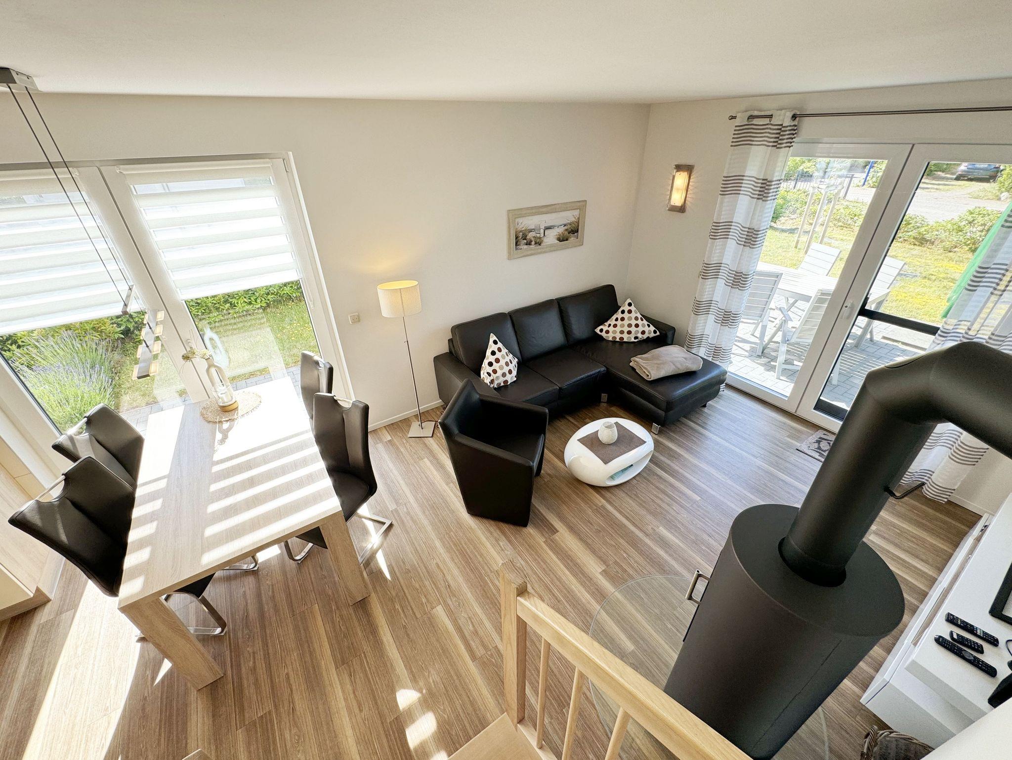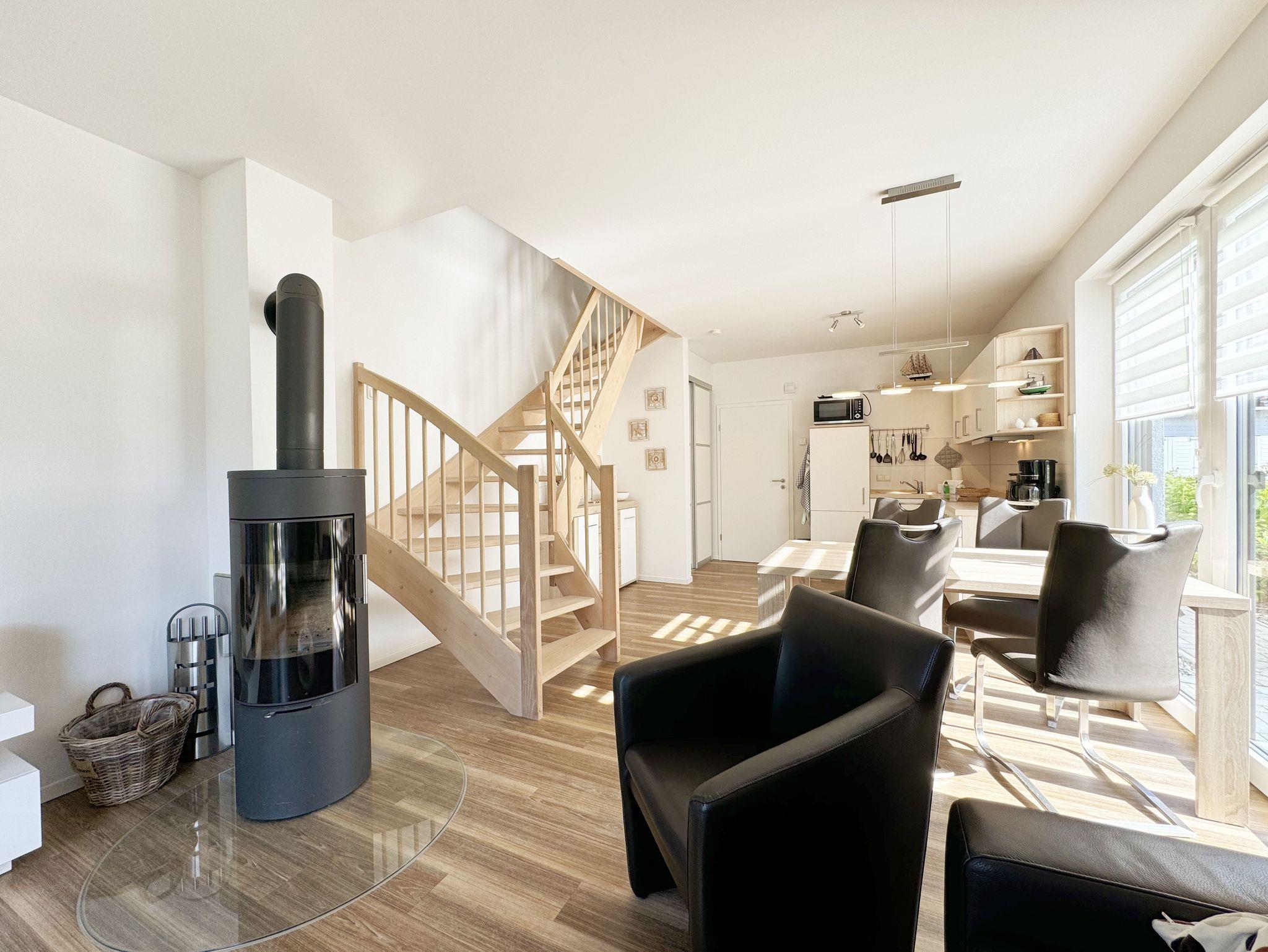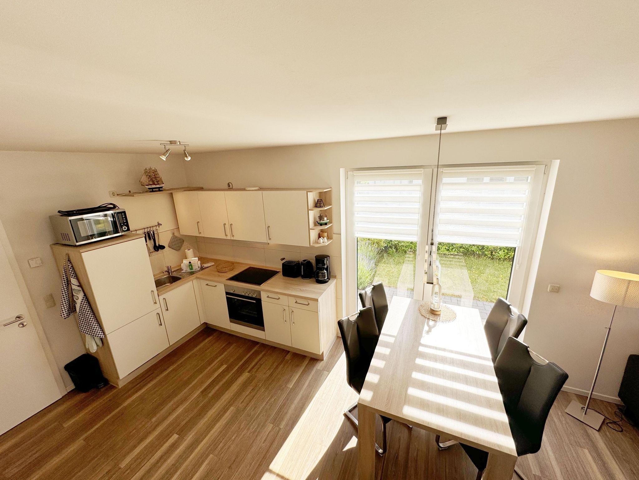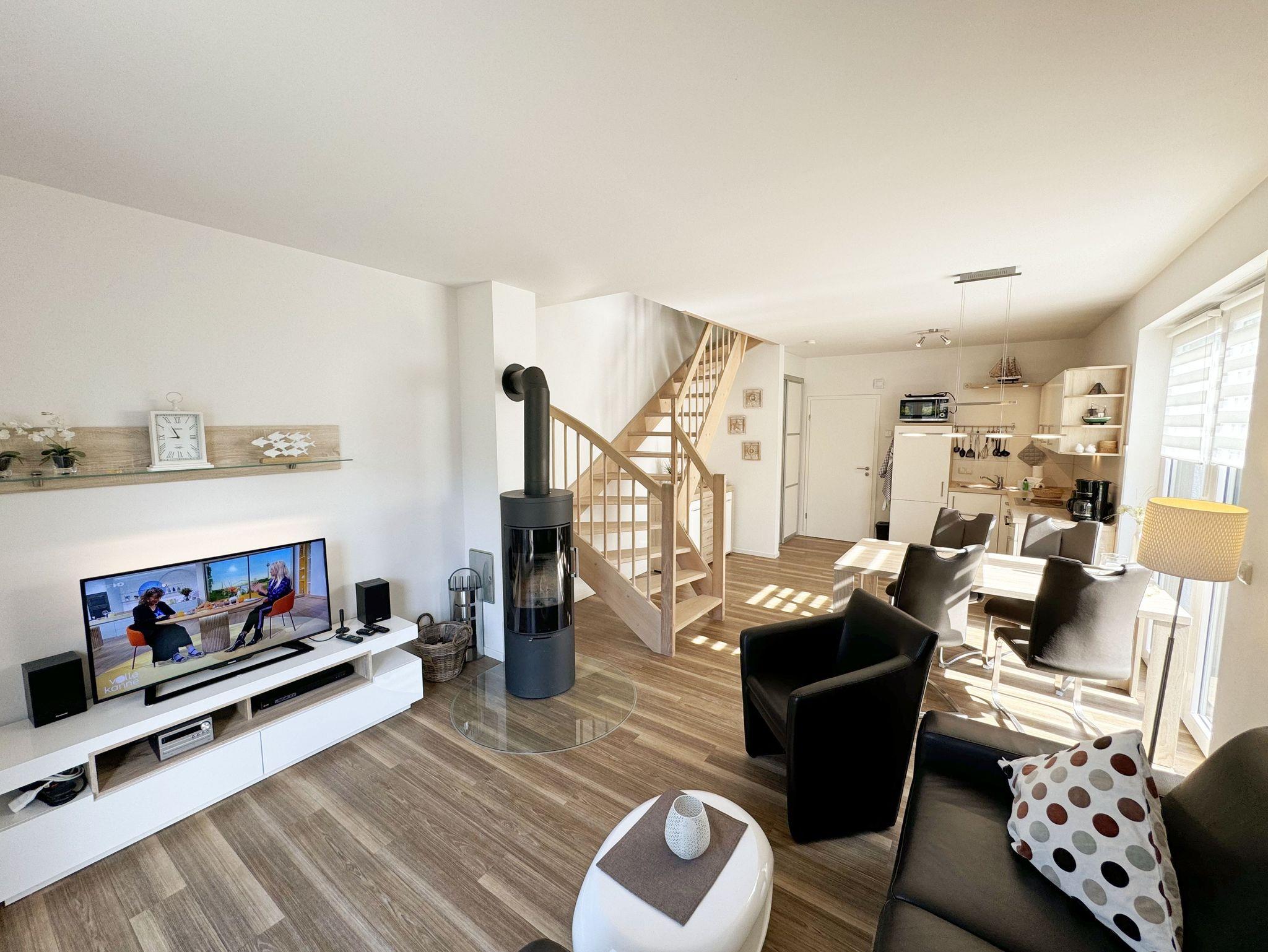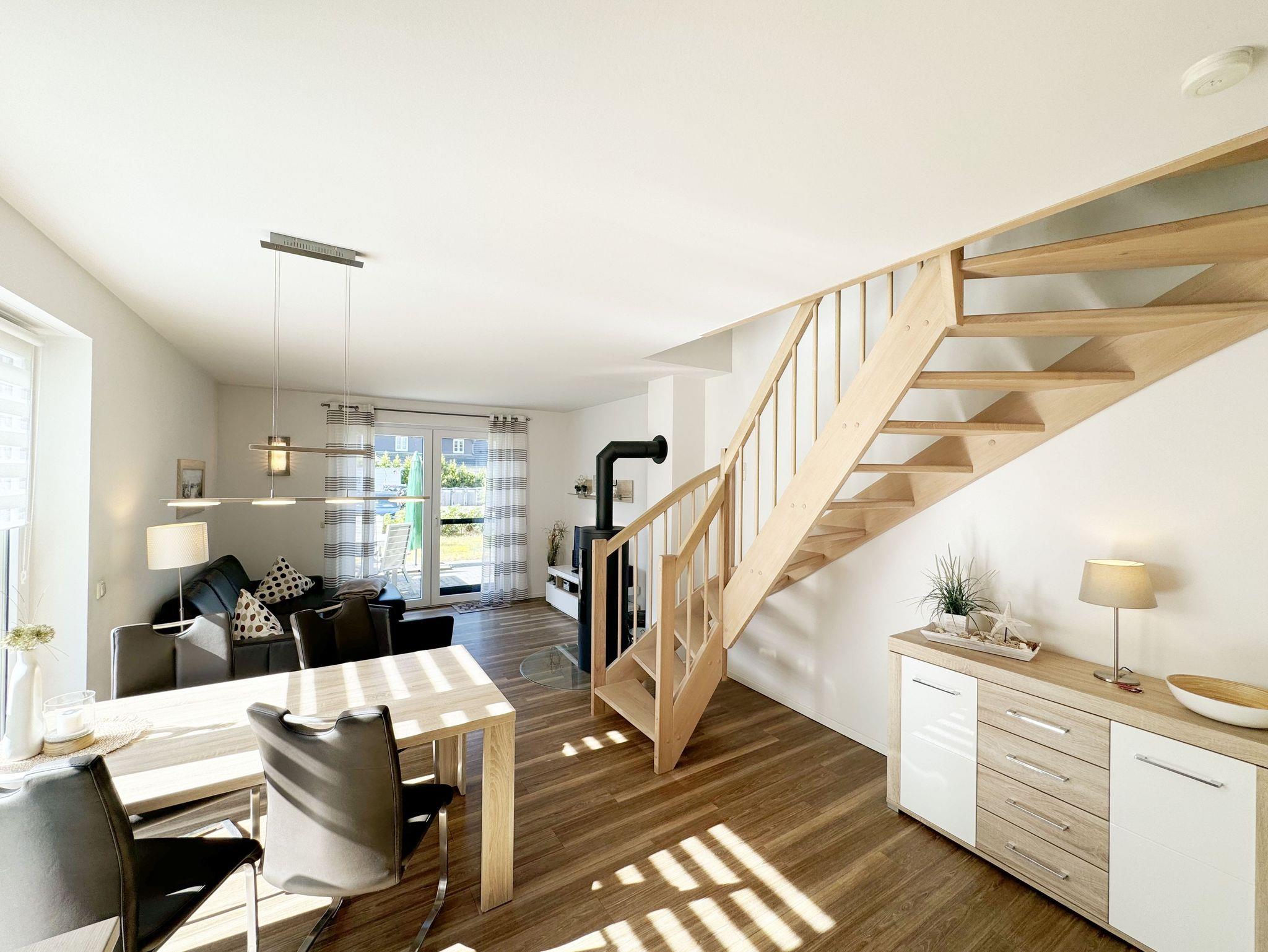Die modern und liebevoll eingerichtete, helle Nichtraucher-Ferienwohnung im Stil einer Maisonettwohnung mit separatem Eingang für max. 4 Erwachsene und 1 Kleinkind im Kinderreisebett bis 3 Jahre, besitzt eine Grundfläche von ca. 62 m², aufgeteilt in einen Wohn-/Essbereich im Erdgeschoss und 2 Schlafzimmern im Dachgeschoss. Im Wohn- und Essbereich laden ein großer Esstisch mit 5 Stühlen und ein Leder-Ecksofa und eine Leselampe zum Verweilen ein. Genießen Sie an kühleren Tagen die wohlige Wärme des Kaminofens. Zur technischen Ausstattung gehört ein 42-Zoll Flachbildfernseher, Blu-Ray-/DVD-Player und eine Musikanlage mit DAB-Radio. Ein WLAN-Zugang zur kostenlosen Nutzung ist selbstverständlich vorhanden. In der komplett ausgestatteten Küche finden Sie ein Cerankochfeld, Backofen, Mikrowelle mit Grillfunktion, einen Geschirrspüler, Kühlschrank mit Eisfach, Toaster, Kaffeemaschine, Mixer, Wasserkocher, Waffeleisen und weitere praktische Helfer. Staubsauger, Waschmaschine, Bügeleisen, Bügelbrett und ein Wäscheständer machen die Ausstattung komplett. Im Obergeschoss finden Sie zwei Schlafzimmer, davon eines mit Doppelbett (2 x 0,90 m x 2,00 m) und eines mit zwei Einzelbetten (jeweils 0,90 m x 2,00 m). Das Schlafzimmer mit Doppelbett ist zusätzlich mit einem 32 Zoll Flachbildfernseher ausgestattet. Nachtischablagen, Kleiderschränke und Verdunklungsplissees runden die Ausstattung der Schlafzimmer ab. Im Dachgeschoss befindet sich ferner ein Tageslichtbad mit ebenerdiger Dusche, Kosmetikspiegel, Waschbecken, WC, Fön und beheizbarem Handtuchhalter. Ein weiteres Gäste-WC befindet sich im Erdgeschoss. Sämtliche Fenster im Erdgeschoss sind mit Rollläden ausgestattet, im Wohn-/Essbereich elektrisch. Die Fenster der Schlafräume verfügen über je ein Fenster mit Plissee und Rollladen und je ein kleines Fenster mit Plissee. Alle Räume sind mit einer Fußbodenheizung versehen und zum Teil auch mit Insektenschutzgitter. Eine Abstellmöglichkeit für mitgebrachte Surfbretter und Fahrräder im abschließbaren Schuppen ist vorhanden. Eine Waschmaschine steht Ihnen inklusive zur Verfügung. Freuen Sie sich auf sonnige Urlaubstage und sommerliche Abende auf der 28 qm großen Südterrasse mit Terrassenmöbeln, kleinem Grill und Sonnenschirm. Eine kleine Rasenfläche zur eigenen Nutzung und ein PKW-Stellplatz Nr. 01 befinden sich direkt vor dem Haus. Für die kleinen Gäste sind 1x Kinderreisebett (110 x 63 cm) und 1x Hochstuhl inklusive vorhanden. Haustiere sind nicht erlaubt. Die Erstausstattung eines Wäschepaketes (komplette Bettwäsche, 1 Duschhandtuch, 2 kleine Handtücher) können Sie bis 14 Tage vor Anreise gegen einen Aufpreis dazu buchen oder durch eigene ergänzen. Ab 2 gebuchten Paketen erhalten Sie einmalig 1 Geschirrhandtuch und 1 Duschvorleger hinzu.