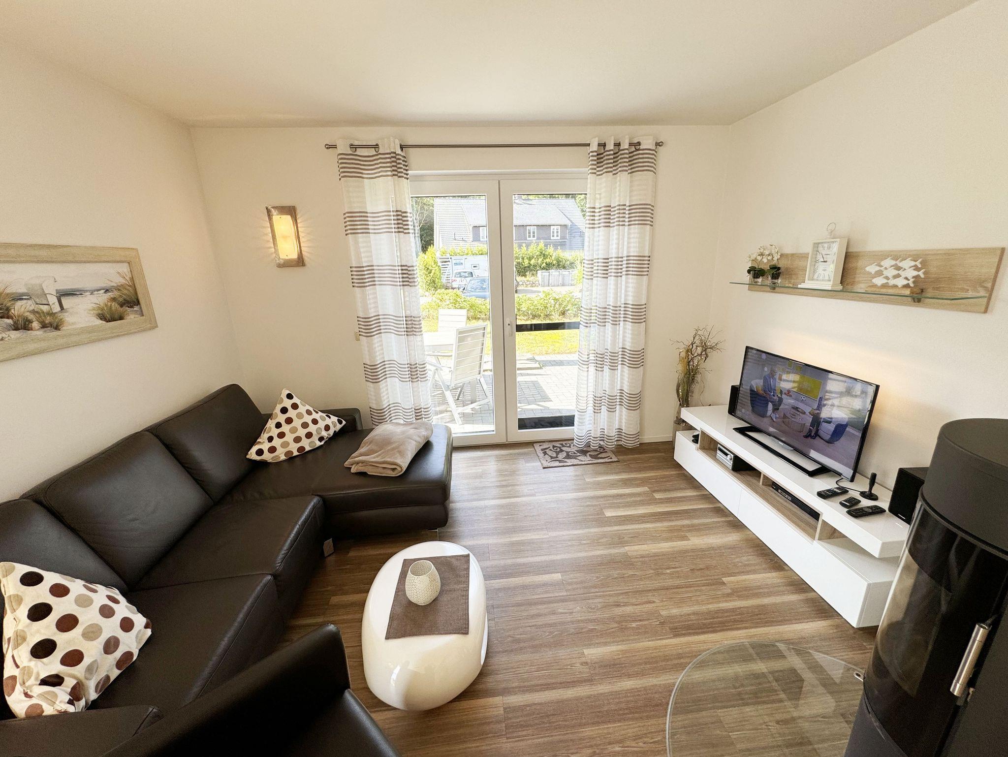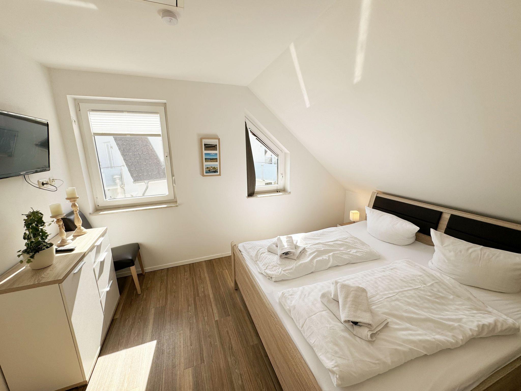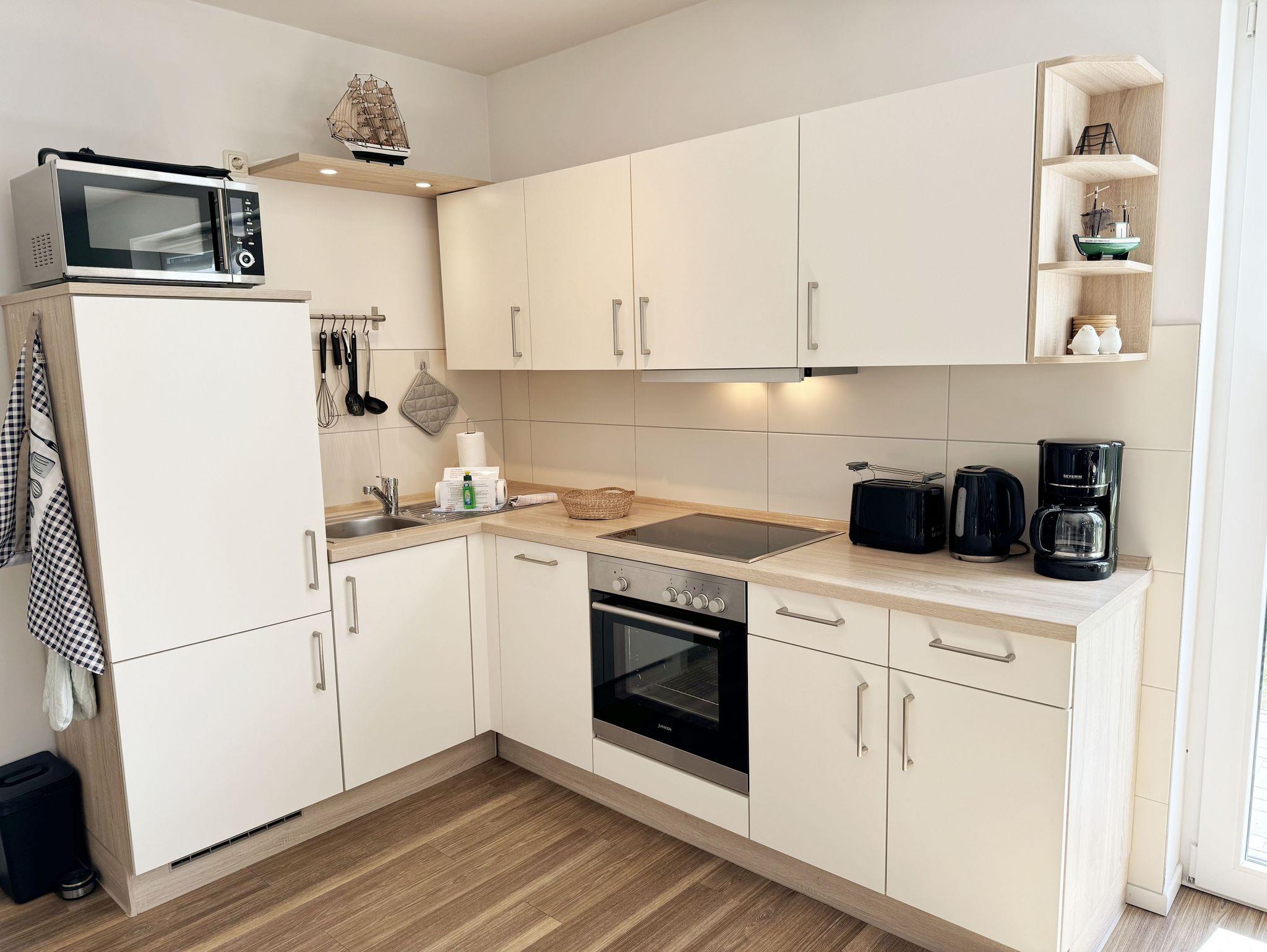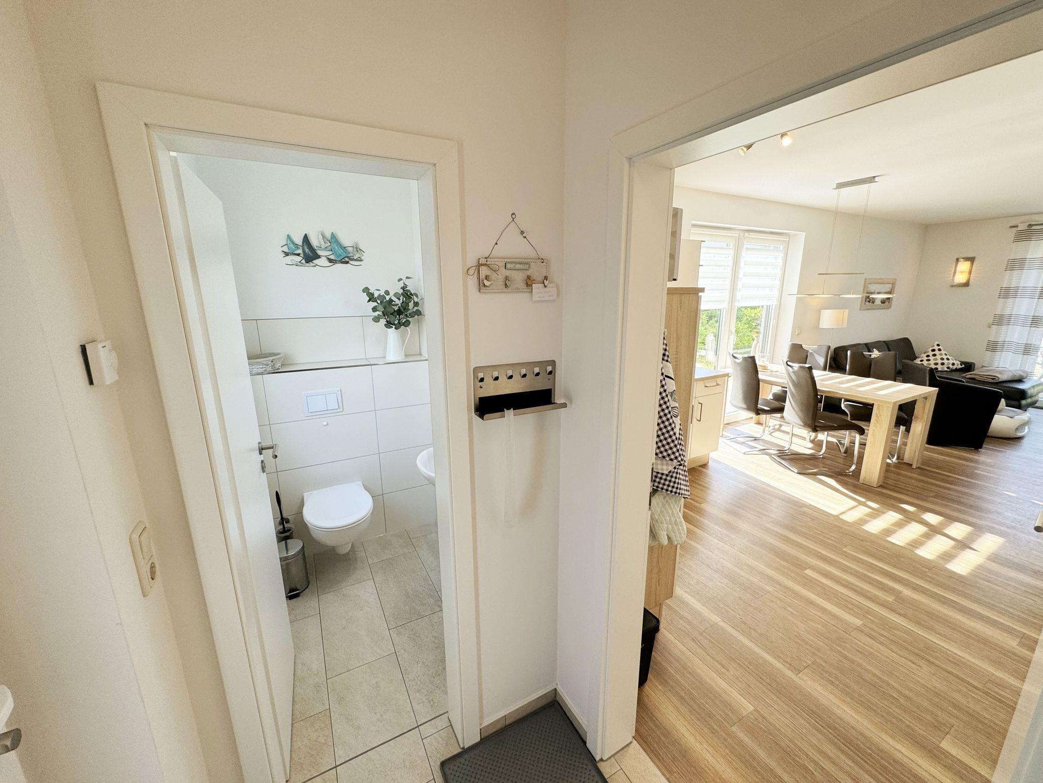 Die modern und liebevoll eingerichtete, helle Nichtraucher-Ferienwohnung im Stil einer Maisonettwohnung mit separatem Eingang für max. 4 Erwachsene und 1 Kleinkind im Kinderreisebett bis 3 Jahre, besitzt eine Grundfläche von ca. 62 m², aufgeteilt in einen Wohn-/Essbereich im Erdgeschoss und 2 Schlafzimmern im Dachgeschoss. Im Wohn- und Essbereich laden ein großer Esstisch mit 5 Stühlen und ein Leder-Ecksofa und eine Leselampe zum Verweilen ein. Genießen Sie an kühleren Tagen die wohlige Wärme des Kaminofens. Zur technischen Ausstattung gehört ein 42-Zoll Flachbildfernseher, Blu-Ray-/DVD-Player und eine Musikanlage mit DAB-Radio. Ein WLAN-Zugang zur kostenlosen Nutzung ist selbstverständlich vorhanden. In der komplett ausgestatteten Küche finden Sie ein Cerankochfeld, Backofen, Mikrowelle mit Grillfunktion, einen Geschirrspüler, Kühlschrank mit Eisfach, Toaster, Kaffeemaschine, Mixer, Wasserkocher, Waffeleisen und weitere praktische Helfer. Staubsauger, Waschmaschine, Bügeleisen, Bügelbrett und ein Wäscheständer machen die Ausstattung komplett. Im Obergeschoss finden Sie zwei Schlafzimmer, davon eines mit Doppelbett (2 x 0,90 m x 2,00 m) und eines mit zwei Einzelbetten (jeweils 0,90 m x 2,00 m). Das Schlafzimmer mit Doppelbett ist zusätzlich mit einem 32 Zoll Flachbildfernseher ausgestattet. Nachtischablagen, Kleiderschränke und Verdunklungsplissees runden die Ausstattung der Schlafzimmer ab. Im Dachgeschoss befindet sich ferner ein Tageslichtbad mit ebenerdiger Dusche, Kosmetikspiegel, Waschbecken, WC, Fön und beheizbarem Handtuchhalter. Ein weiteres Gäste-WC befindet sich im Erdgeschoss. Sämtliche Fenster im Erdgeschoss sind mit Rollläden ausgestattet, im Wohn-/Essbereich elektrisch. Die Fenster der Schlafräume verfügen über je ein Fenster mit Plissee und Rollladen und je ein kleines Fenster mit Plissee. Alle Räume sind mit einer Fußbodenheizung versehen und zum Teil auch mit Insektenschutzgitter. Eine Abstellmöglichkeit für mitgebrachte Surfbretter und Fahrräder im abschließbaren Schuppen ist vorhanden. Eine Waschmaschine steht Ihnen inklusive zur Verfügung. Freuen Sie sich auf sonnige Urlaubstage und sommerliche Abende auf der 28 qm großen Südterrasse mit Terrassenmöbeln, kleinem Grill und Sonnenschirm. Eine kleine Rasenfläche zur eigenen Nutzung und ein PKW-Stellplatz Nr. 01 befinden sich direkt vor dem Haus. Für die kleinen Gäste sind 1x Kinderreisebett (110 x 63 cm) und 1x Hochstuhl inklusive vorhanden. Haustiere sind nicht erlaubt. Die Erstausstattung eines Wäschepaketes (komplette Bettwäsche, 1 Duschhandtuch, 2 kleine Handtücher) können Sie bis 14 Tage vor Anreise gegen einen Aufpreis dazu buchen oder durch eigene ergänzen. Ab 2 gebuchten Paketen erhalten Sie einmalig 1 Geschirrhandtuch und 1 Duschvorleger hinzu.