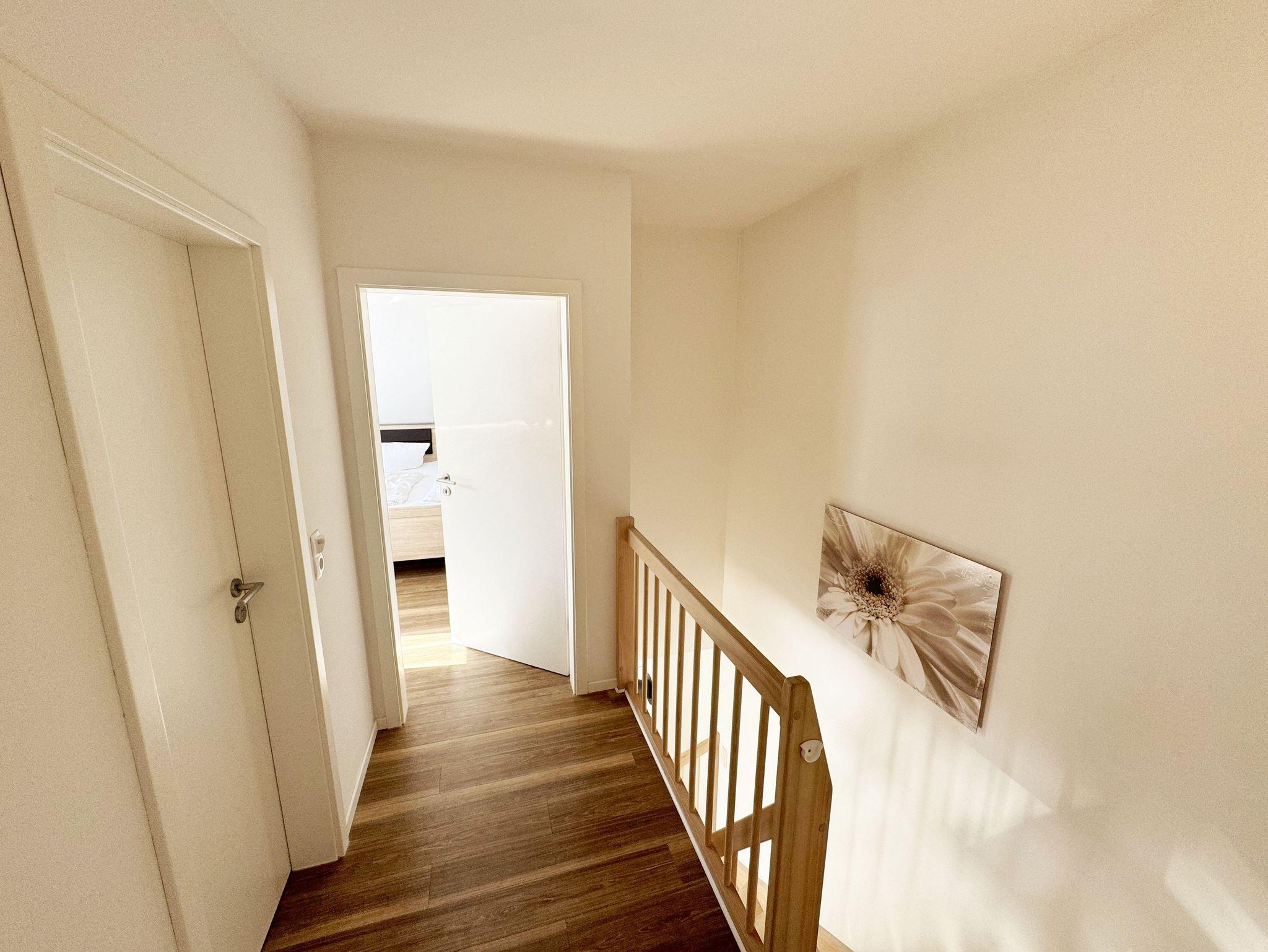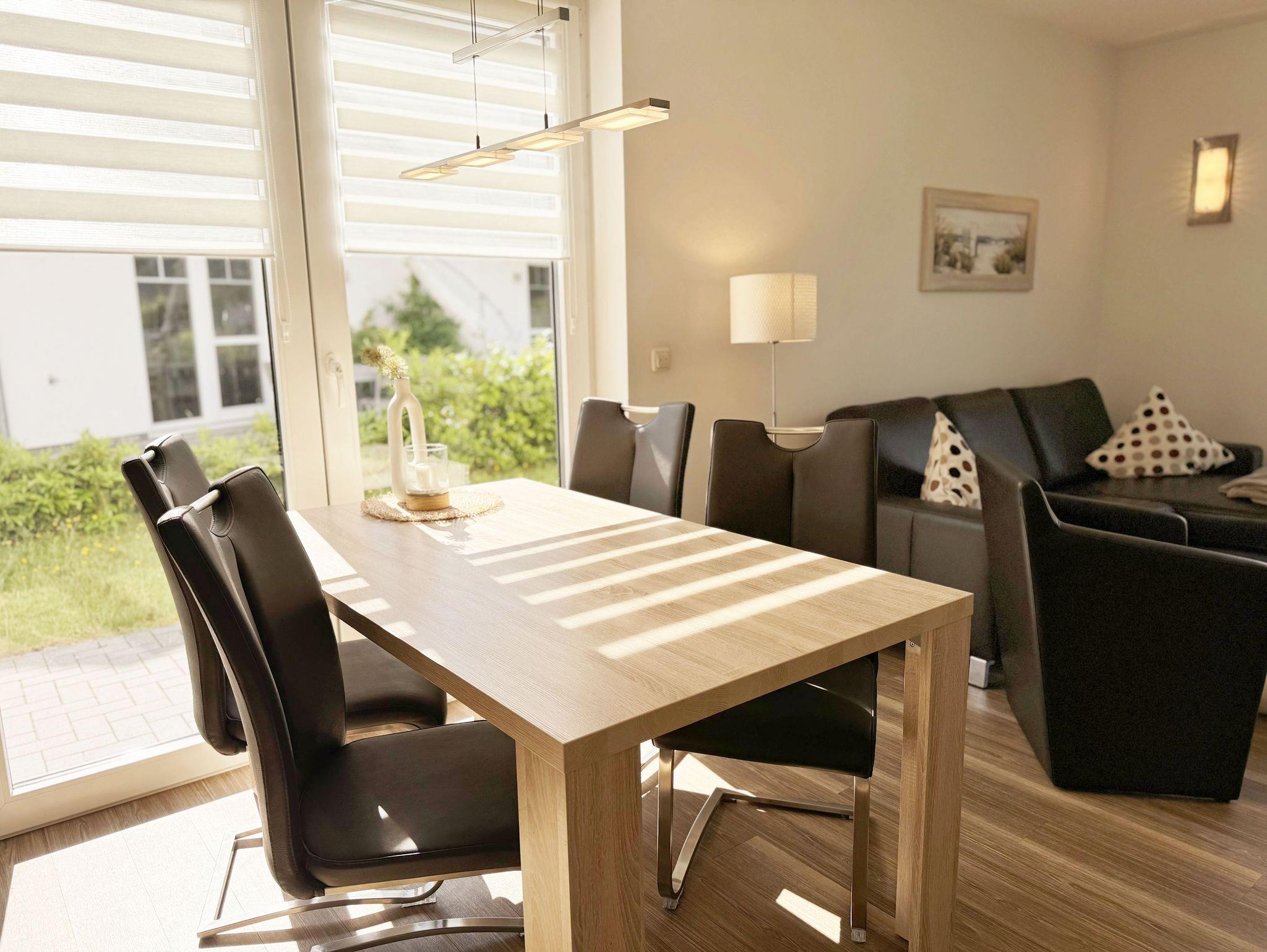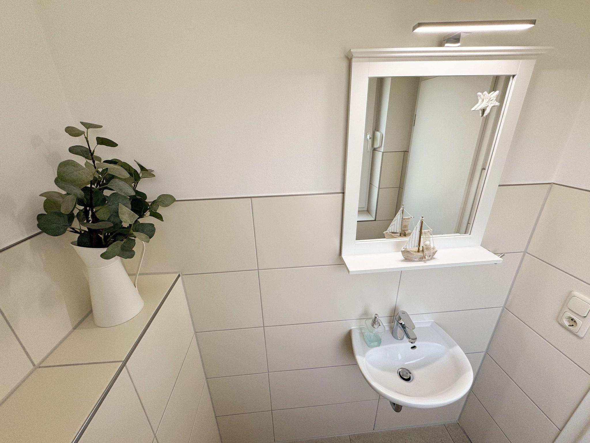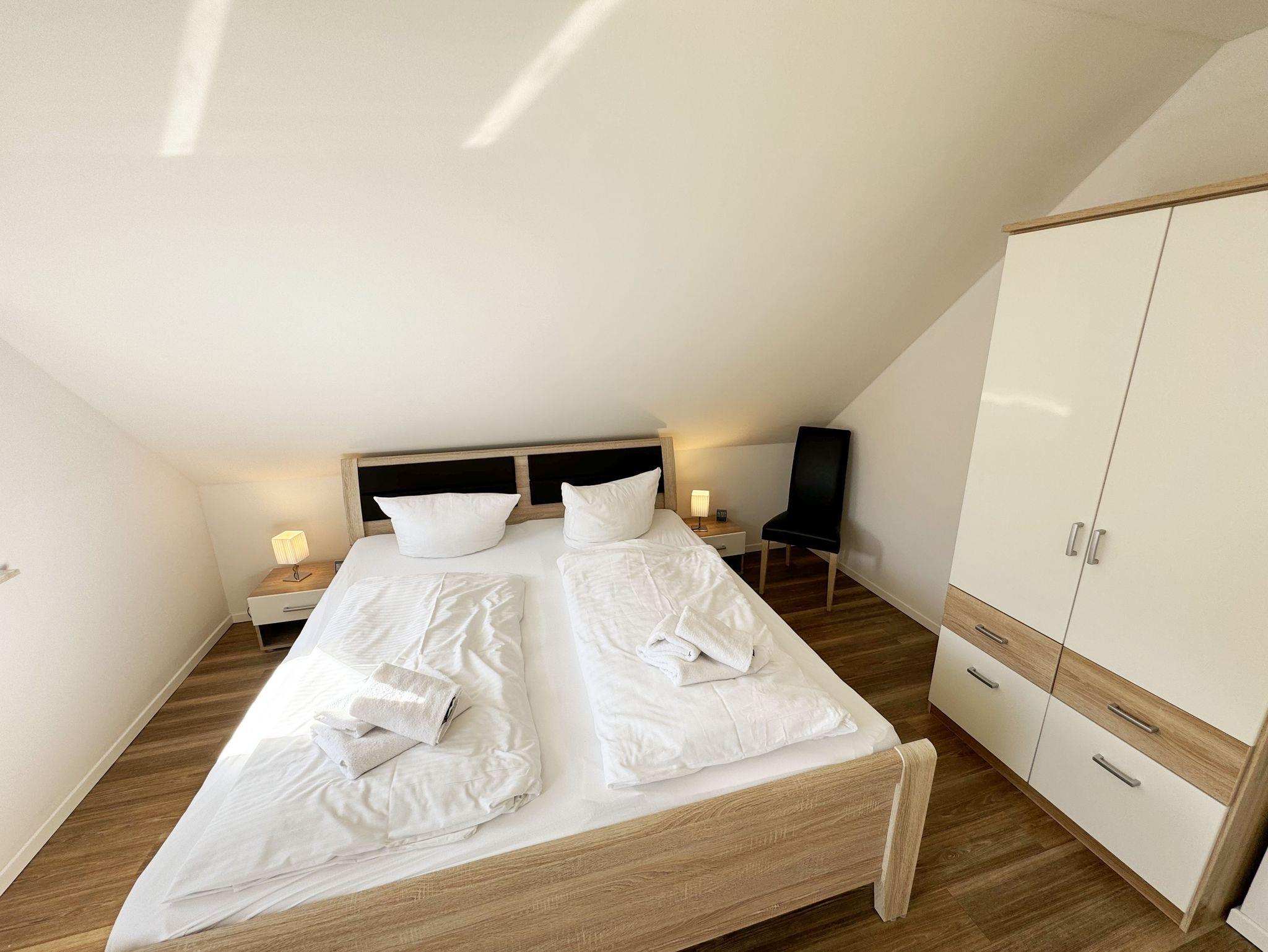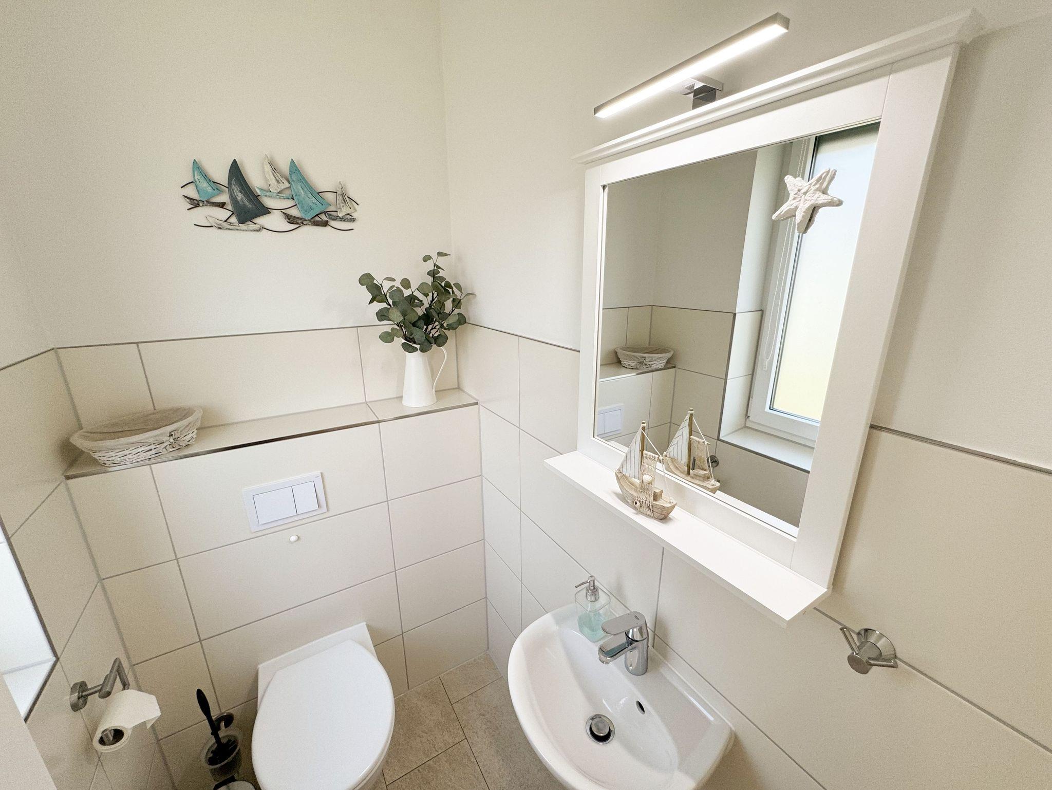 Die modern und liebevoll eingerichtete, helle Nichtraucher-Ferienwohnung im Stil einer Maisonettwohnung mit separatem Eingang für max. 4 Erwachsene und 1 Kleinkind im Kinderreisebett bis 3 Jahre, besitzt eine Grundfläche von ca. 62 m², aufgeteilt in einen Wohn-/Essbereich im Erdgeschoss und 2 Schlafzimmern im Dachgeschoss. Im Wohn- und Essbereich laden ein großer Esstisch mit 5 Stühlen und ein Leder-Ecksofa und eine Leselampe zum Verweilen ein. Genießen Sie an kühleren Tagen die wohlige Wärme des Kaminofens. Zur technischen Ausstattung gehört ein 42-Zoll Flachbildfernseher, Blu-Ray-/DVD-Player und eine Musikanlage mit DAB-Radio. Ein WLAN-Zugang zur kostenlosen Nutzung ist selbstverständlich vorhanden. In der komplett ausgestatteten Küche finden Sie ein Cerankochfeld, Backofen, Mikrowelle mit Grillfunktion, einen Geschirrspüler, Kühlschrank mit Eisfach, Toaster, Kaffeemaschine, Mixer, Wasserkocher, Waffeleisen und weitere praktische Helfer. Staubsauger, Waschmaschine, Bügeleisen, Bügelbrett und ein Wäscheständer machen die Ausstattung komplett. Im Obergeschoss finden Sie zwei Schlafzimmer, davon eines mit Doppelbett (2 x 0,90 m x 2,00 m) und eines mit zwei Einzelbetten (jeweils 0,90 m x 2,00 m). Das Schlafzimmer mit Doppelbett ist zusätzlich mit einem 32 Zoll Flachbildfernseher ausgestattet. Nachtischablagen, Kleiderschränke und Verdunklungsplissees runden die Ausstattung der Schlafzimmer ab. Im Dachgeschoss befindet sich ferner ein Tageslichtbad mit ebenerdiger Dusche, Kosmetikspiegel, Waschbecken, WC, Fön und beheizbarem Handtuchhalter. Ein weiteres Gäste-WC befindet sich im Erdgeschoss. Sämtliche Fenster im Erdgeschoss sind mit Rollläden ausgestattet, im Wohn-/Essbereich elektrisch. Die Fenster der Schlafräume verfügen über je ein Fenster mit Plissee und Rollladen und je ein kleines Fenster mit Plissee. Alle Räume sind mit einer Fußbodenheizung versehen und zum Teil auch mit Insektenschutzgitter. Eine Abstellmöglichkeit für mitgebrachte Surfbretter und Fahrräder im abschließbaren Schuppen ist vorhanden. Eine Waschmaschine steht Ihnen inklusive zur Verfügung. Freuen Sie sich auf sonnige Urlaubstage und sommerliche Abende auf der 28 qm großen Südterrasse mit Terrassenmöbeln, kleinem Grill und Sonnenschirm. Eine kleine Rasenfläche zur eigenen Nutzung und ein PKW-Stellplatz Nr. 01 befinden sich direkt vor dem Haus. Für die kleinen Gäste sind 1x Kinderreisebett (110 x 63 cm) und 1x Hochstuhl inklusive vorhanden. Haustiere sind nicht erlaubt. Die Erstausstattung eines Wäschepaketes (komplette Bettwäsche, 1 Duschhandtuch, 2 kleine Handtücher) können Sie bis 14 Tage vor Anreise gegen einen Aufpreis dazu buchen oder durch eigene ergänzen. Ab 2 gebuchten Paketen erhalten Sie einmalig 1 Geschirrhandtuch und 1 Duschvorleger hinzu.