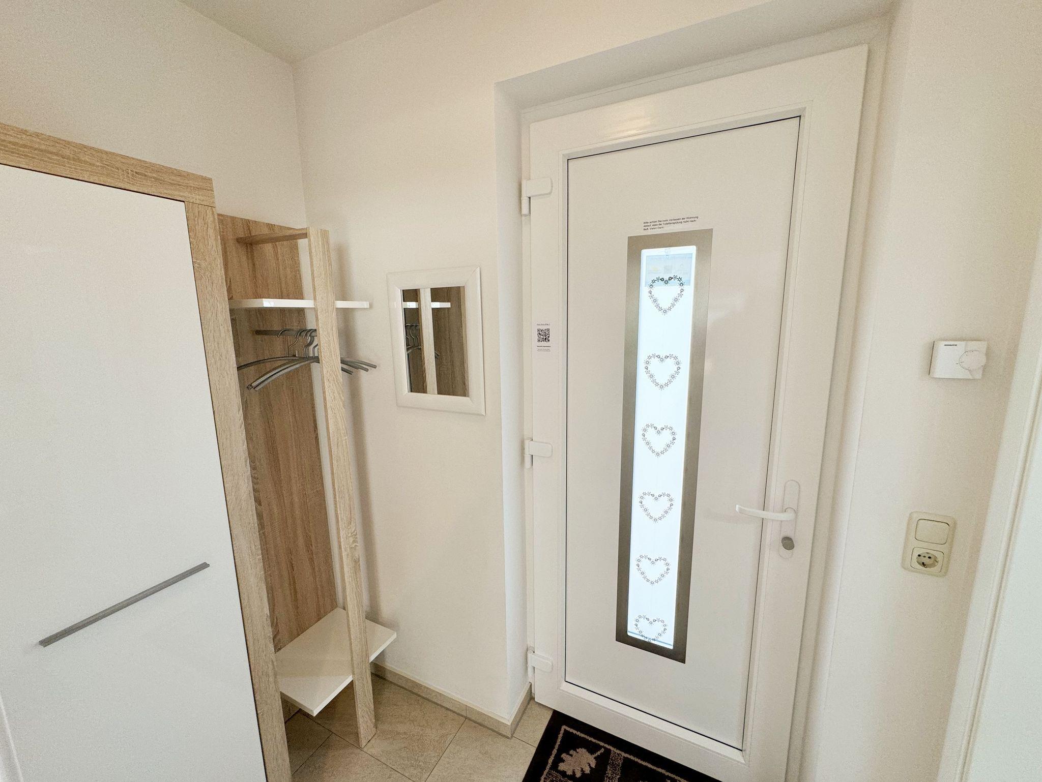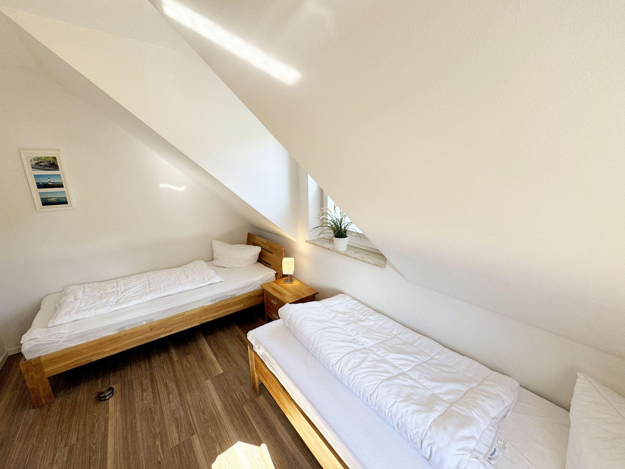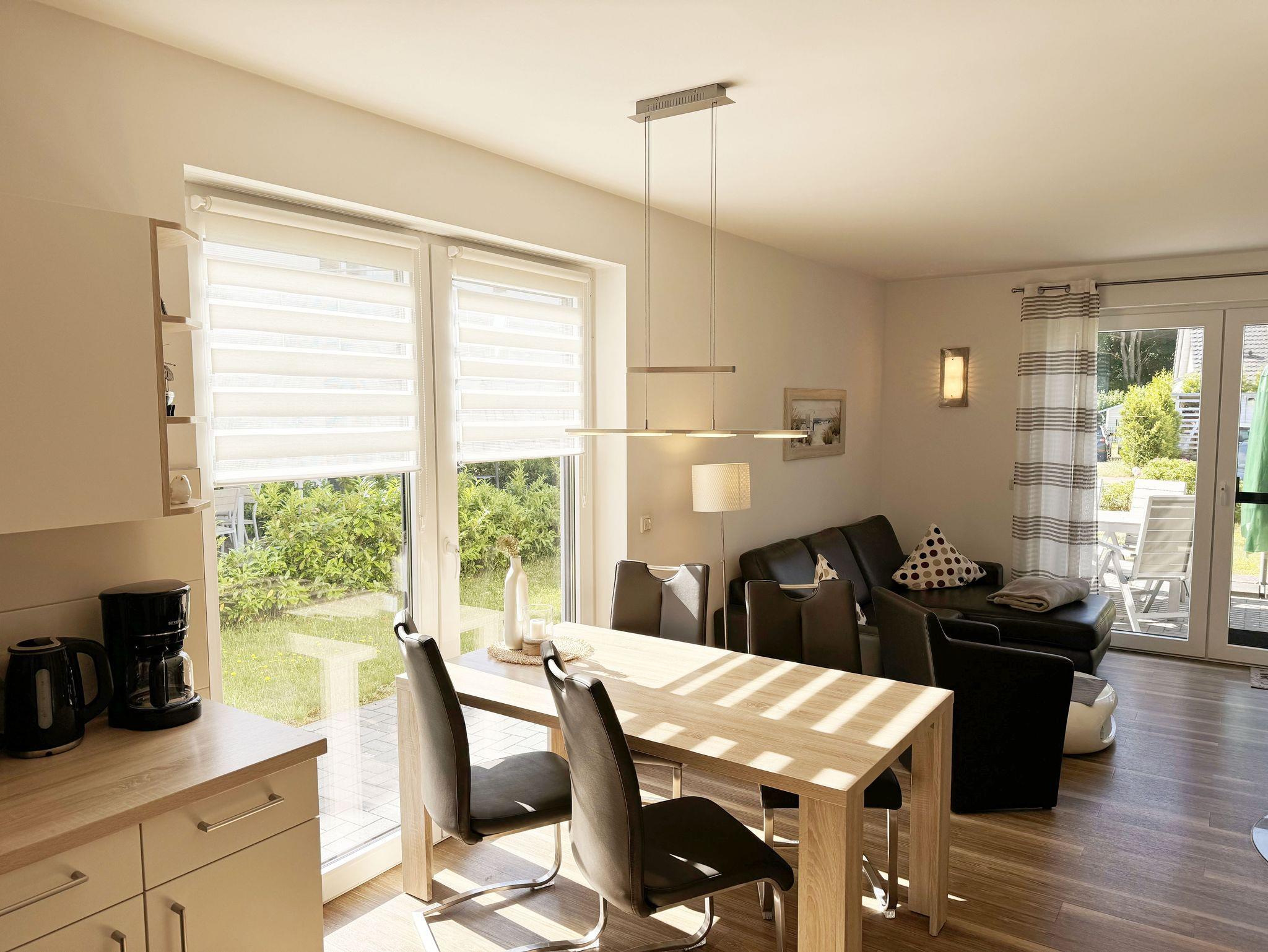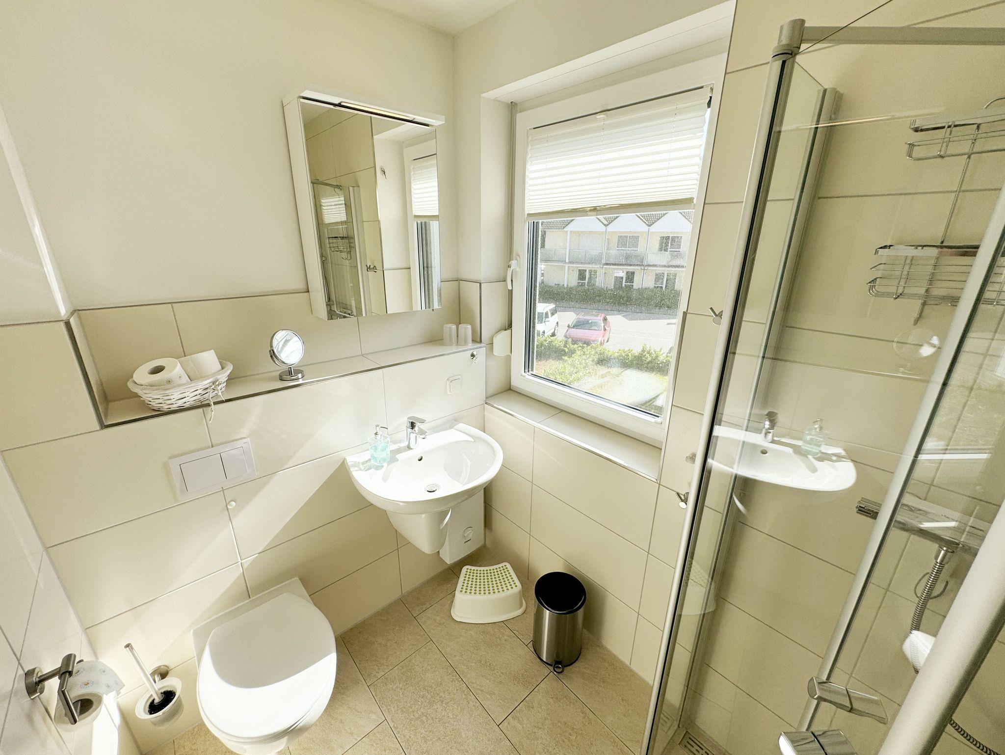 Die modern und liebevoll eingerichtete, helle Nichtraucher-Ferienwohnung im Stil einer Maisonettwohnung mit separatem Eingang für max. 4 Erwachsene und 1 Kleinkind im Kinderreisebett bis 3 Jahre, besitzt eine Grundfläche von ca. 62 m², aufgeteilt in einen Wohn-/Essbereich im Erdgeschoss und 2 Schlafzimmern im Dachgeschoss. Im Wohn- und Essbereich laden ein großer Esstisch mit 5 Stühlen und ein Leder-Ecksofa und eine Leselampe zum Verweilen ein. Genießen Sie an kühleren Tagen die wohlige Wärme des Kaminofens. Zur technischen Ausstattung gehört ein 42-Zoll Flachbildfernseher, Blu-Ray-/DVD-Player und eine Musikanlage mit DAB-Radio. Ein WLAN-Zugang zur kostenlosen Nutzung ist selbstverständlich vorhanden. In der komplett ausgestatteten Küche finden Sie ein Cerankochfeld, Backofen, Mikrowelle mit Grillfunktion, einen Geschirrspüler, Kühlschrank mit Eisfach, Toaster, Kaffeemaschine, Mixer, Wasserkocher, Waffeleisen und weitere praktische Helfer. Staubsauger, Waschmaschine, Bügeleisen, Bügelbrett und ein Wäscheständer machen die Ausstattung komplett. Im Obergeschoss finden Sie zwei Schlafzimmer, davon eines mit Doppelbett (2 x 0,90 m x 2,00 m) und eines mit zwei Einzelbetten (jeweils 0,90 m x 2,00 m). Das Schlafzimmer mit Doppelbett ist zusätzlich mit einem 32 Zoll Flachbildfernseher ausgestattet. Nachtischablagen, Kleiderschränke und Verdunklungsplissees runden die Ausstattung der Schlafzimmer ab. Im Dachgeschoss befindet sich ferner ein Tageslichtbad mit ebenerdiger Dusche, Kosmetikspiegel, Waschbecken, WC, Fön und beheizbarem Handtuchhalter. Ein weiteres Gäste-WC befindet sich im Erdgeschoss. Sämtliche Fenster im Erdgeschoss sind mit Rollläden ausgestattet, im Wohn-/Essbereich elektrisch. Die Fenster der Schlafräume verfügen über je ein Fenster mit Plissee und Rollladen und je ein kleines Fenster mit Plissee. Alle Räume sind mit einer Fußbodenheizung versehen und zum Teil auch mit Insektenschutzgitter. Eine Abstellmöglichkeit für mitgebrachte Surfbretter und Fahrräder im abschließbaren Schuppen ist vorhanden. Eine Waschmaschine steht Ihnen inklusive zur Verfügung. Freuen Sie sich auf sonnige Urlaubstage und sommerliche Abende auf der 28 qm großen Südterrasse mit Terrassenmöbeln, kleinem Grill und Sonnenschirm. Eine kleine Rasenfläche zur eigenen Nutzung und ein PKW-Stellplatz Nr. 01 befinden sich direkt vor dem Haus. Für die kleinen Gäste sind 1x Kinderreisebett (110 x 63 cm) und 1x Hochstuhl inklusive vorhanden. Haustiere sind nicht erlaubt. Die Erstausstattung eines Wäschepaketes (komplette Bettwäsche, 1 Duschhandtuch, 2 kleine Handtücher) können Sie bis 14 Tage vor Anreise gegen einen Aufpreis dazu buchen oder durch eigene ergänzen. Ab 2 gebuchten Paketen erhalten Sie einmalig 1 Geschirrhandtuch und 1 Duschvorleger hinzu.