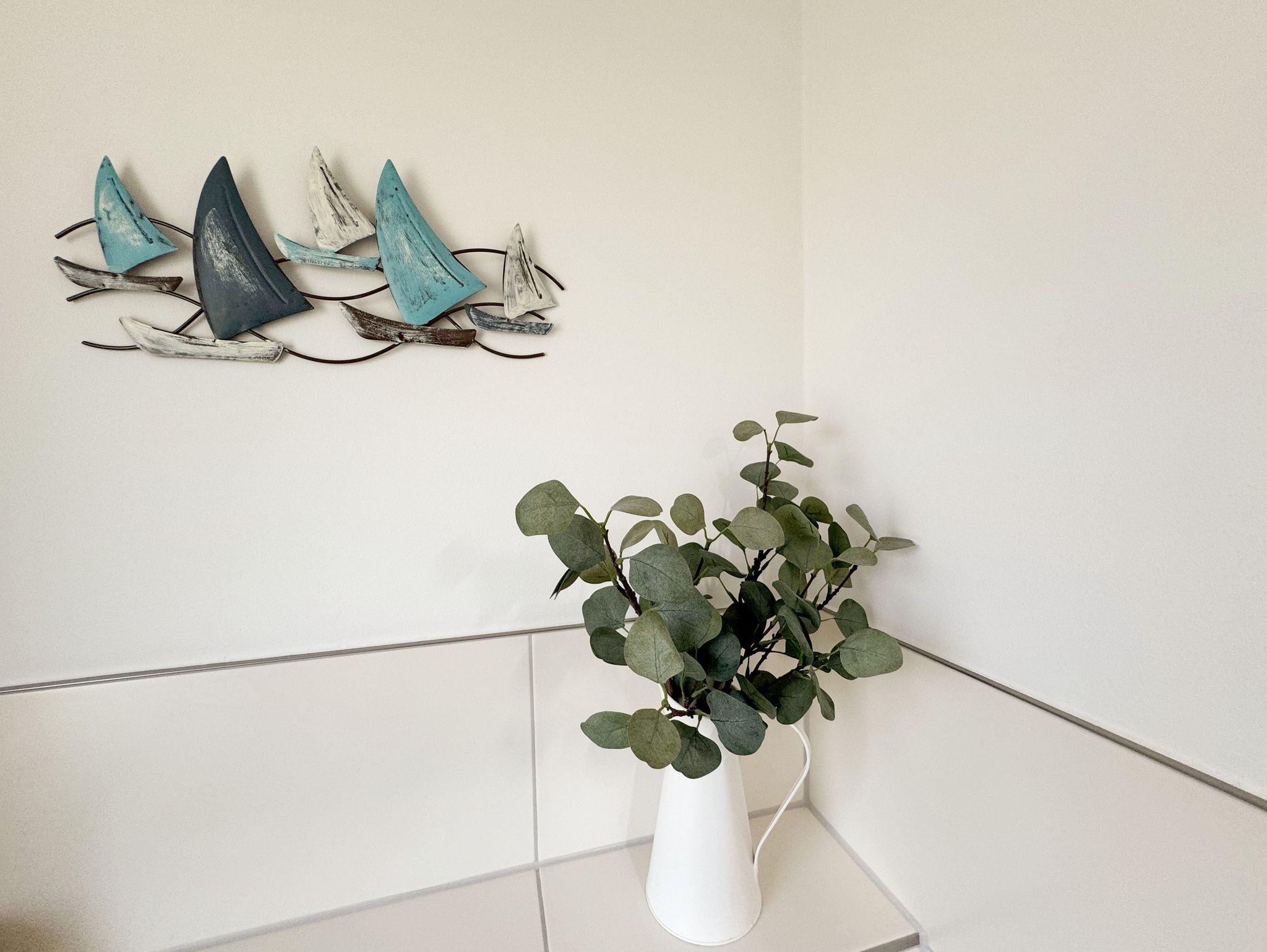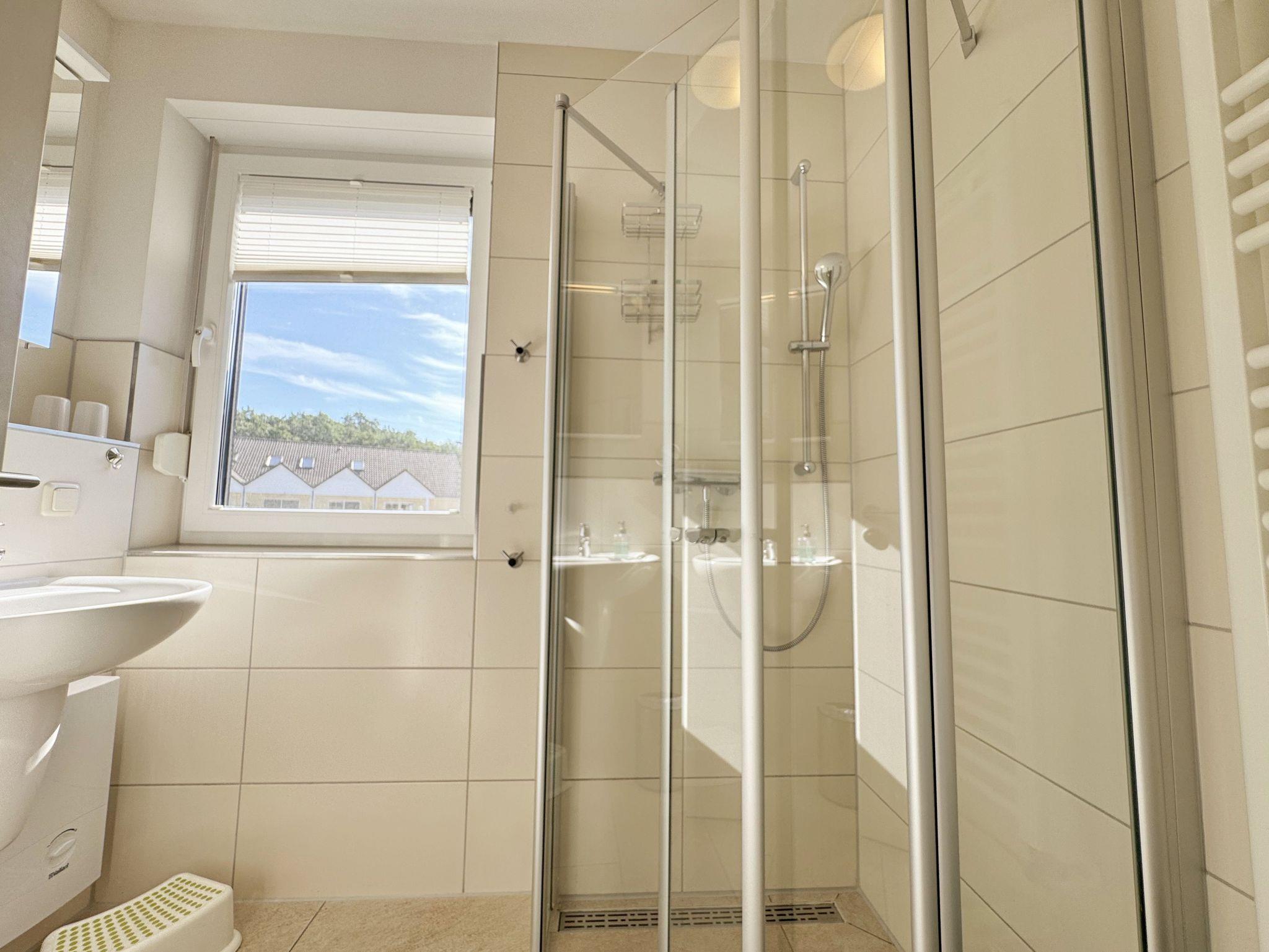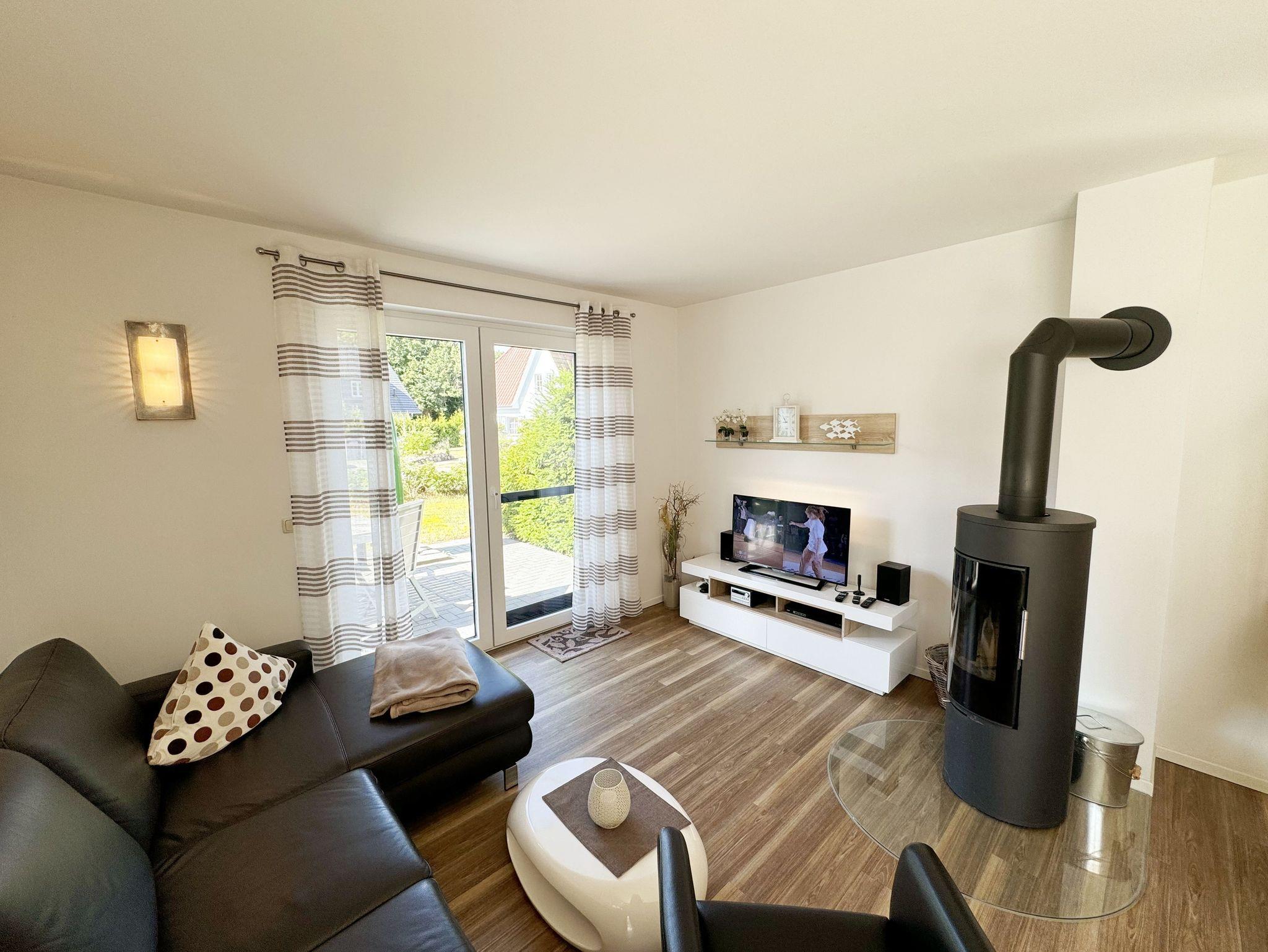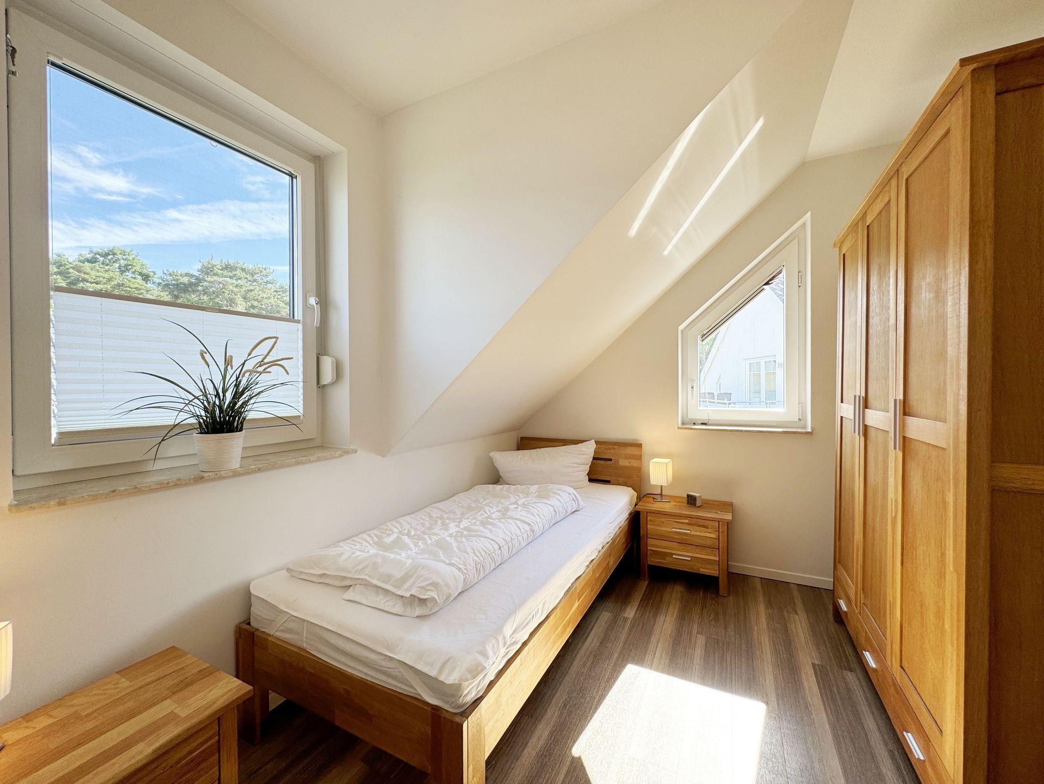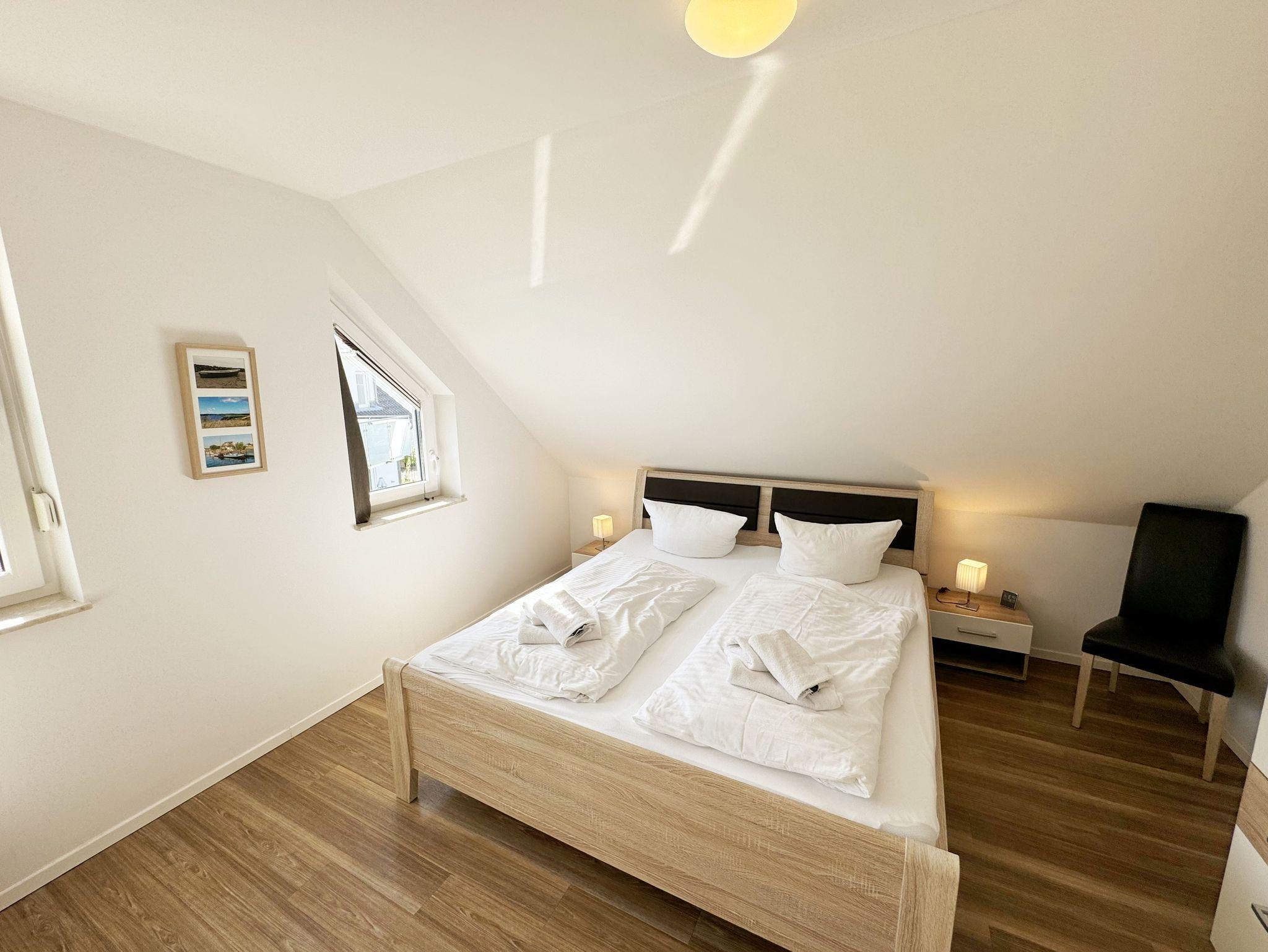 Die modern und liebevoll eingerichtete, helle Nichtraucher-Ferienwohnung im Stil einer Maisonettwohnung mit separatem Eingang für max. 4 Erwachsene und 1 Kleinkind im Kinderreisebett bis 3 Jahre, besitzt eine Grundfläche von ca. 62 m², aufgeteilt in einen Wohn-/Essbereich im Erdgeschoss und 2 Schlafzimmern im Dachgeschoss. Im Wohn- und Essbereich laden ein großer Esstisch mit 5 Stühlen und ein Leder-Ecksofa und eine Leselampe zum Verweilen ein. Genießen Sie an kühleren Tagen die wohlige Wärme des Kaminofens. Zur technischen Ausstattung gehört ein 42-Zoll Flachbildfernseher, Blu-Ray-/DVD-Player und eine Musikanlage mit DAB-Radio. Ein WLAN-Zugang zur kostenlosen Nutzung ist selbstverständlich vorhanden. In der komplett ausgestatteten Küche finden Sie ein Cerankochfeld, Backofen, Mikrowelle mit Grillfunktion, einen Geschirrspüler, Kühlschrank mit Eisfach, Toaster, Kaffeemaschine, Mixer, Wasserkocher, Waffeleisen und weitere praktische Helfer. Staubsauger, Waschmaschine, Bügeleisen, Bügelbrett und ein Wäscheständer machen die Ausstattung komplett. Im Obergeschoss finden Sie zwei Schlafzimmer, davon eines mit Doppelbett (2 x 0,90 m x 2,00 m) und eines mit zwei Einzelbetten (jeweils 0,90 m x 2,00 m). Das Schlafzimmer mit Doppelbett ist zusätzlich mit einem 32 Zoll Flachbildfernseher ausgestattet. Nachtischablagen, Kleiderschränke und Verdunklungsplissees runden die Ausstattung der Schlafzimmer ab. Im Dachgeschoss befindet sich ferner ein Tageslichtbad mit ebenerdiger Dusche, Kosmetikspiegel, Waschbecken, WC, Fön und beheizbarem Handtuchhalter. Ein weiteres Gäste-WC befindet sich im Erdgeschoss. Sämtliche Fenster im Erdgeschoss sind mit Rollläden ausgestattet, im Wohn-/Essbereich elektrisch. Die Fenster der Schlafräume verfügen über je ein Fenster mit Plissee und Rollladen und je ein kleines Fenster mit Plissee. Alle Räume sind mit einer Fußbodenheizung versehen und zum Teil auch mit Insektenschutzgitter. Eine Abstellmöglichkeit für mitgebrachte Surfbretter und Fahrräder im abschließbaren Schuppen ist vorhanden. Eine Waschmaschine steht Ihnen inklusive zur Verfügung. Freuen Sie sich auf sonnige Urlaubstage und sommerliche Abende auf der 28 qm großen Südterrasse mit Terrassenmöbeln, kleinem Grill und Sonnenschirm. Eine kleine Rasenfläche zur eigenen Nutzung und ein PKW-Stellplatz Nr. 01 befinden sich direkt vor dem Haus. Für die kleinen Gäste sind 1x Kinderreisebett (110 x 63 cm) und 1x Hochstuhl inklusive vorhanden. Haustiere sind nicht erlaubt. Die Erstausstattung eines Wäschepaketes (komplette Bettwäsche, 1 Duschhandtuch, 2 kleine Handtücher) können Sie bis 14 Tage vor Anreise gegen einen Aufpreis dazu buchen oder durch eigene ergänzen. Ab 2 gebuchten Paketen erhalten Sie einmalig 1 Geschirrhandtuch und 1 Duschvorleger hinzu.