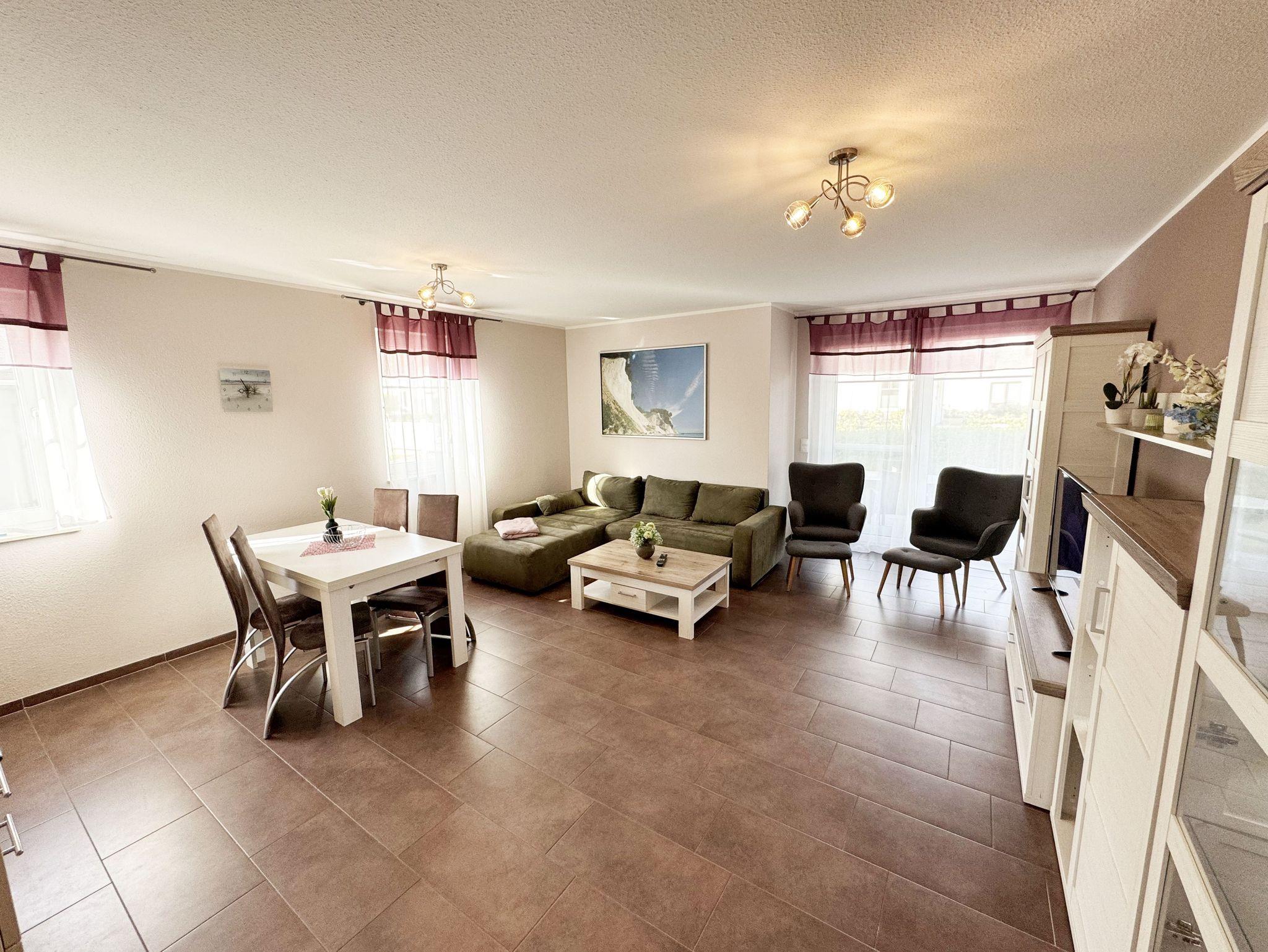 Die Nichtraucherferienwohnung Nr. 03 befindet sich im Erdgeschoss des Hauses und verfügt über eine Wohnfläche von ca. 56 qm. Die Ferienwohnung ist für 2 bis 4 Personen ausgelegt. Der Flur/Eingangsbereich verfügt über eine Garderobe und ist Zugang zu allen Räumlichkeiten. Von hier aus gelangen Sie in den kombinierten Wohn- und Essbereich mit integrierter Küchenzeile. Die komplett ausgestattete Küchenzeile verfügt über ein Cerankochfeld, Backofen, Dunstabzugshaube, Kühlschrank mit Gefrierfach, Spülmaschine, Kaffeemaschine, Mikrowelle, Wasserkocher, Toaster und weitere diverse Küchenutensilien. Der Esstisch mit Bestuhlung ist für 4 Personen geeignet. Vom Wohnbereich aus gelangen Sie durch die Terrassentür auf die bestuhlte Terrasse. Das im Wohnbereich integrierte Schlafsofa verfügt über eine Ausziehfunktion (1,60m x 2,00m) und kann von 2 Personen gut genutzt werden. Ein kleiner Couchtisch, Leselampe, TV-Board mit Flachbild-TV, Receiver, DVD-Player und Ministereoanlage runden den Wohnbereich ab. Auch im Urlaub brauchen Sie auf einen Internetanschluss (WLAN) nicht verzichten. Dieser ist für Sie inklusive. Das im Schlafbereich vorhandene Doppelbett hat eine Maße von 1,80m x 2,00m. Nachttischablagen, einen Schiebeschrank mit großem Spiegel runden den Schlafbereich ab. Das Bad rundet mit einem WC, Waschplatz, Dusche, Fön, Handtuchwärmeheizkörper und Waschmaschine die Wohnung komplett ab. In allen Räumen sorgt eine Fußbodenheizung für angenehme Wärme. Insektenschutzgitter befinden sich im Schlafzimmer sowie im Wohnbereich. Die Wohnungseigene Terrasse verfügt über einen Terrassentisch + 4 Stühlen und ist Richtung Süd/West ausgerichtet. Die Fenster haben Außenjalousien. Ein eigener PKW-Stellplatz (Nr.03) befindet sich auf dem Grundstück, mitgebrachte oder gemietete Fahrräder können im wohnungseigenen Abstellraum (Nr.03) untergestellt werden. Ein gut erzogenes Haustier ist gegen eine Gebühr ein gern gesehener Gast. Die Erstausstattung eines Wäschepaketes (komplette Bettwäsche, 1 Duschhandtuch, 2 kleine Handtücher) können Sie bis 14 Tage vor Anreise gegen einen Aufpreis dazu buchen oder durch eigene ergänzen. Ab 2 gebuchten Paketen erhalten Sie einmalig 1 Geschirrhandtuch und 1 Duschvorleger hinzu.