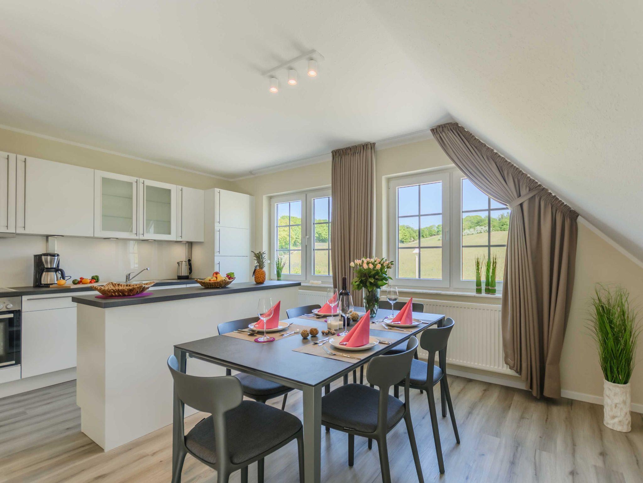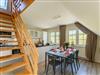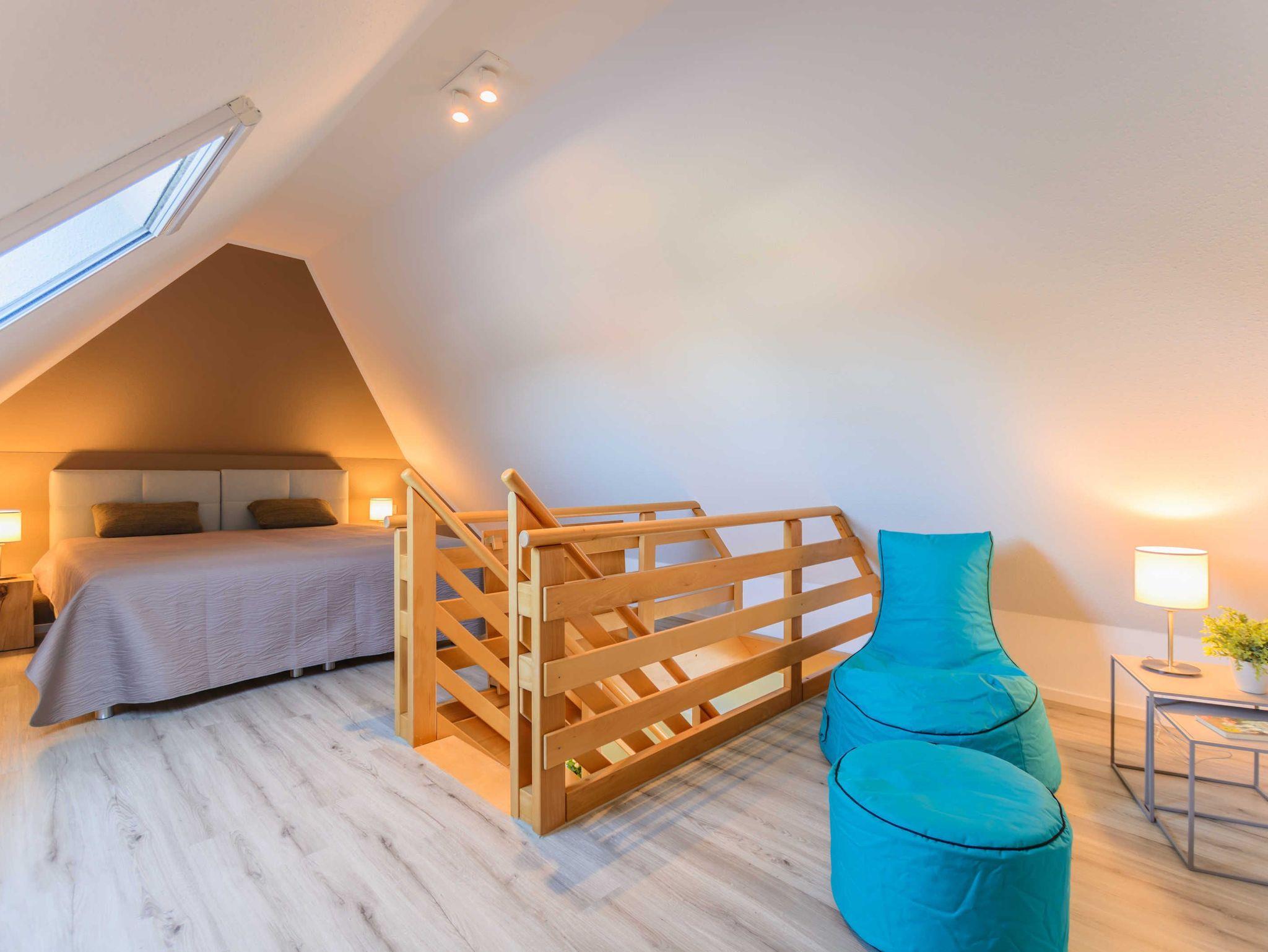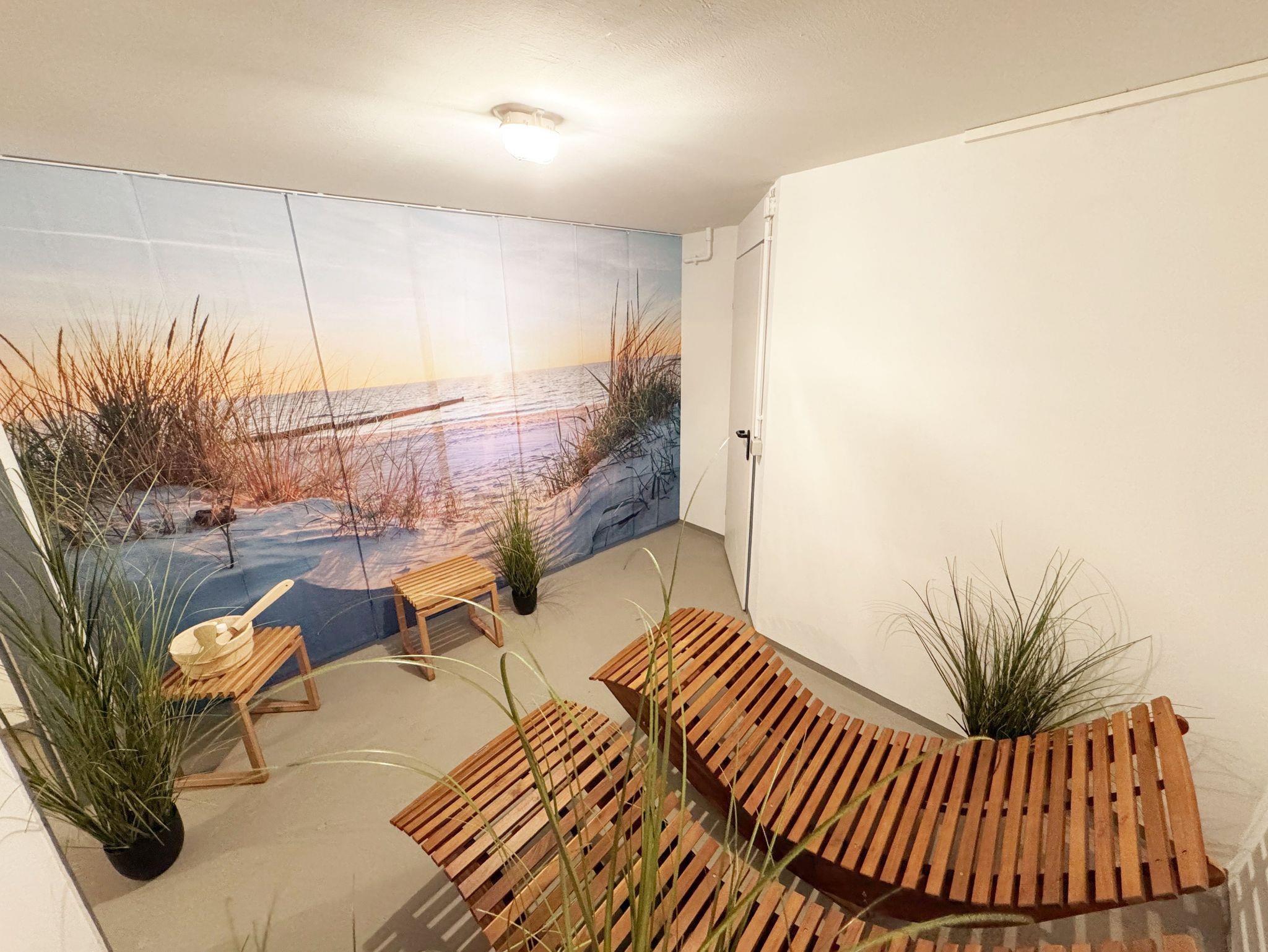 Die Nichtraucherferienwohnung befindet sich in der 1. Etage und erstreckt sich über 2 Etagen. Mit Ihren ca. 75 qm können sich max. 6 Erwachsene wohlfühlen. Der großzügige und helle Wohn- Essbereich ist mit einer modernen Küchenzeile ausgestattet. Mit einem Kühlschrank mit Eisfach, Geschirrspüler, Cerankochfeld, Backofen, Mikrowelle, Wasserkocher, Kaffeemaschine, Toaster, Mixer, Waffeleisen können Sie Ihre gemütlichen Kochabende ganz individuell gestalten. Ein passender Essbereich rundet die Gemütlichkeit ab. Im angrenzenden Wohnbereich trägt eine bequeme Couch (Aufbettungsmöglichkeit für 5./6.Person, 1,50m x 1,95m) mit Couchtisch, ein Lesesessel mit Hocker sowie ein TV-Board zu Ihrer Entspannung bei. Die technische Ausstattung umfasst einen Smart-TV, ein DAB-Bluetooth-Radio sowie einen WLAN-Anschluss. Vom Wohnbereich gelangen Sie auf Ihren bestuhlten Balkon (Süd) mit Sonnenschirm, von wo Sie aus Ihren Tag entspannt bei einem Glas Wein ausklingen lassen können. Hell und freundlich eingerichtet erwartet Sie ein gemütliches Schlafzimmer auf gleicher Ebene, mit einem komfortablen Boxspring-Bett (1,80m x 2,00m) mit 5 Zonen Tonnen-Taschenfederkern-Matratzen, Nachttischablagen, einen großzügigen Kleiderschrank sowie ein Smart-TV. Das 2. Schlafzimmer erreichen Sie durch eine Treppe, welche vom Wohnbereich aus startet. Hier befindet sich ebenfalls ein bequemes Boxspringbett (1,80m x 2,00m) mit Nachttischablagen sowie einer kleinen Leseecke oder Relax-Ecke. Beide Schlafbereiche verfügen zudem über Vorhänge/Rollos, die nahezu lichtundurchlässig sind und einen guten Sicht- und Sonnenschutz bieten. Für einen angenehmen Schlaf sorgen zusätzlich Insektenschutzgitter im Wohn- & Schlafbereich. Das Tageslicht-Badezimmer ist mit einer ebenerdigen Dusche, einem WC, einen Handtuchtrockner, einem Fön sowie einem Waschtisch ausgestattet. In der Wohnung finden Sie zusätzlich ein Staubsauger, ein Besen mit Kehrset, ein Wäscheständer sowie ein Wäschekorb. Im Nachbarhaus C können Sie eine Waschmaschine sowie einen Trockner gegen Gebühr nutzen. Hier stehen auch ein Bügelbrett und ein Bügeleisen zur Verfügung. Haustiere sind nicht erlaubt. Das Grillen auf dem ausgewiesenen Gemeinschaftsplatz lädt zu gemütlichen Abenden ein. Zur Entspannung lädt eine münzbetriebene Sauna mit kleinem Ruheraum im Untergeschoss von Haus B ein. Ihre Fahrräder können Sie begrenzt im Gemeinschaftskeller oder auf dem Grundstück abstellen. Ein PKW-Stellplatz steht Ihnen inklusive zur Verfügung. Die Erstausstattung eines Wäschepaketes (komplette Bettwäsche, 1 Duschhandtuch, 2 kleine Handtücher) können Sie bis 14 Tage vor Anreise gegen einen Aufpreis dazu buchen oder durch eigene ergänzen. Ab 2 gebuchten Paketen erhalten Sie einmalig 1 Geschirrhandtuch und 1 Duschvorleger hinzu.
