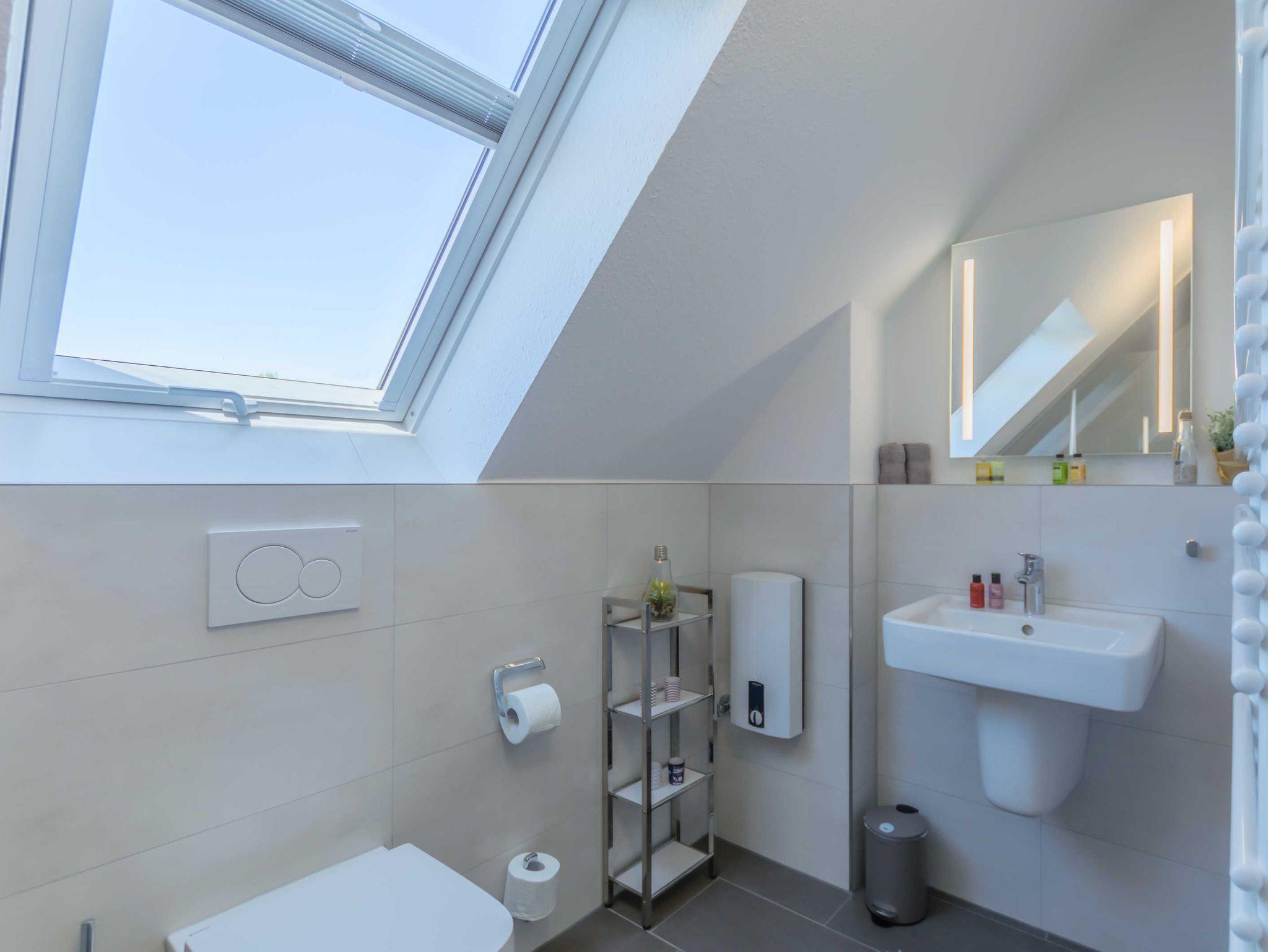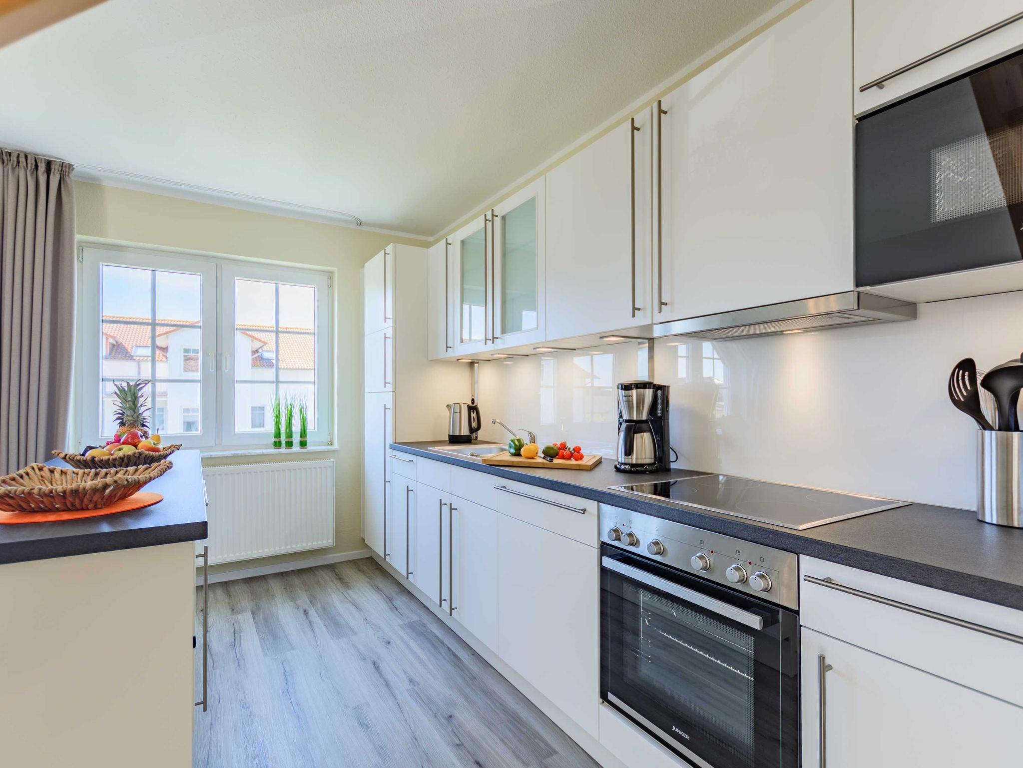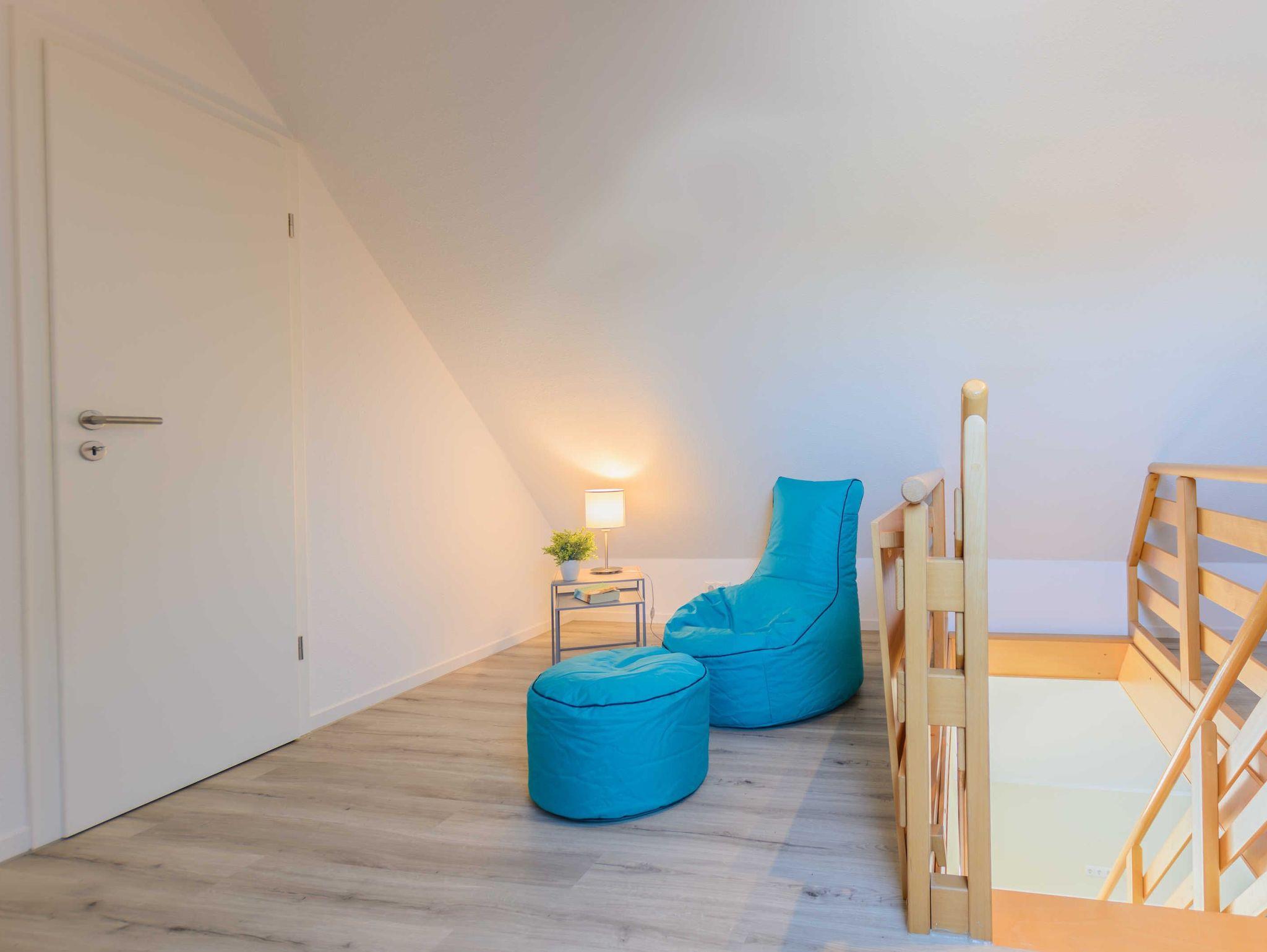 Die Nichtraucherferienwohnung befindet sich in der 1. Etage und erstreckt sich über 2 Etagen. Mit Ihren ca. 75 qm können sich max. 6 Erwachsene wohlfühlen. Der großzügige und helle Wohn- Essbereich ist mit einer modernen Küchenzeile ausgestattet. Mit einem Kühlschrank mit Eisfach, Geschirrspüler, Cerankochfeld, Backofen, Mikrowelle, Wasserkocher, Kaffeemaschine, Toaster, Mixer, Waffeleisen können Sie Ihre gemütlichen Kochabende ganz individuell gestalten. Ein passender Essbereich rundet die Gemütlichkeit ab. Im angrenzenden Wohnbereich trägt eine bequeme Couch (Aufbettungsmöglichkeit für 5./6.Person, 1,50m x 1,95m) mit Couchtisch, ein Lesesessel mit Hocker sowie ein TV-Board zu Ihrer Entspannung bei. Die technische Ausstattung umfasst einen Smart-TV, ein DAB-Bluetooth-Radio sowie einen WLAN-Anschluss. Vom Wohnbereich gelangen Sie auf Ihren bestuhlten Balkon (Süd) mit Sonnenschirm, von wo Sie aus Ihren Tag entspannt bei einem Glas Wein ausklingen lassen können. Hell und freundlich eingerichtet erwartet Sie ein gemütliches Schlafzimmer auf gleicher Ebene, mit einem komfortablen Boxspring-Bett (1,80m x 2,00m) mit 5 Zonen Tonnen-Taschenfederkern-Matratzen, Nachttischablagen, einen großzügigen Kleiderschrank sowie ein Smart-TV. Das 2. Schlafzimmer erreichen Sie durch eine Treppe, welche vom Wohnbereich aus startet. Hier befindet sich ebenfalls ein bequemes Boxspringbett (1,80m x 2,00m) mit Nachttischablagen sowie einer kleinen Leseecke oder Relax-Ecke. Beide Schlafbereiche verfügen zudem über Vorhänge/Rollos, die nahezu lichtundurchlässig sind und einen guten Sicht- und Sonnenschutz bieten. Für einen angenehmen Schlaf sorgen zusätzlich Insektenschutzgitter im Wohn- & Schlafbereich. Das Tageslicht-Badezimmer ist mit einer ebenerdigen Dusche, einem WC, einen Handtuchtrockner, einem Fön sowie einem Waschtisch ausgestattet. In der Wohnung finden Sie zusätzlich ein Staubsauger, ein Besen mit Kehrset, ein Wäscheständer sowie ein Wäschekorb. Im Nachbarhaus C können Sie eine Waschmaschine sowie einen Trockner gegen Gebühr nutzen. Hier stehen auch ein Bügelbrett und ein Bügeleisen zur Verfügung. Haustiere sind nicht erlaubt. Das Grillen auf dem ausgewiesenen Gemeinschaftsplatz lädt zu gemütlichen Abenden ein. Zur Entspannung lädt eine münzbetriebene Sauna mit kleinem Ruheraum im Untergeschoss von Haus B ein. Ihre Fahrräder können Sie begrenzt im Gemeinschaftskeller oder auf dem Grundstück abstellen. Ein PKW-Stellplatz steht Ihnen inklusive zur Verfügung. Die Erstausstattung eines Wäschepaketes (komplette Bettwäsche, 1 Duschhandtuch, 2 kleine Handtücher) können Sie bis 14 Tage vor Anreise gegen einen Aufpreis dazu buchen oder durch eigene ergänzen. Ab 2 gebuchten Paketen erhalten Sie einmalig 1 Geschirrhandtuch und 1 Duschvorleger hinzu.
