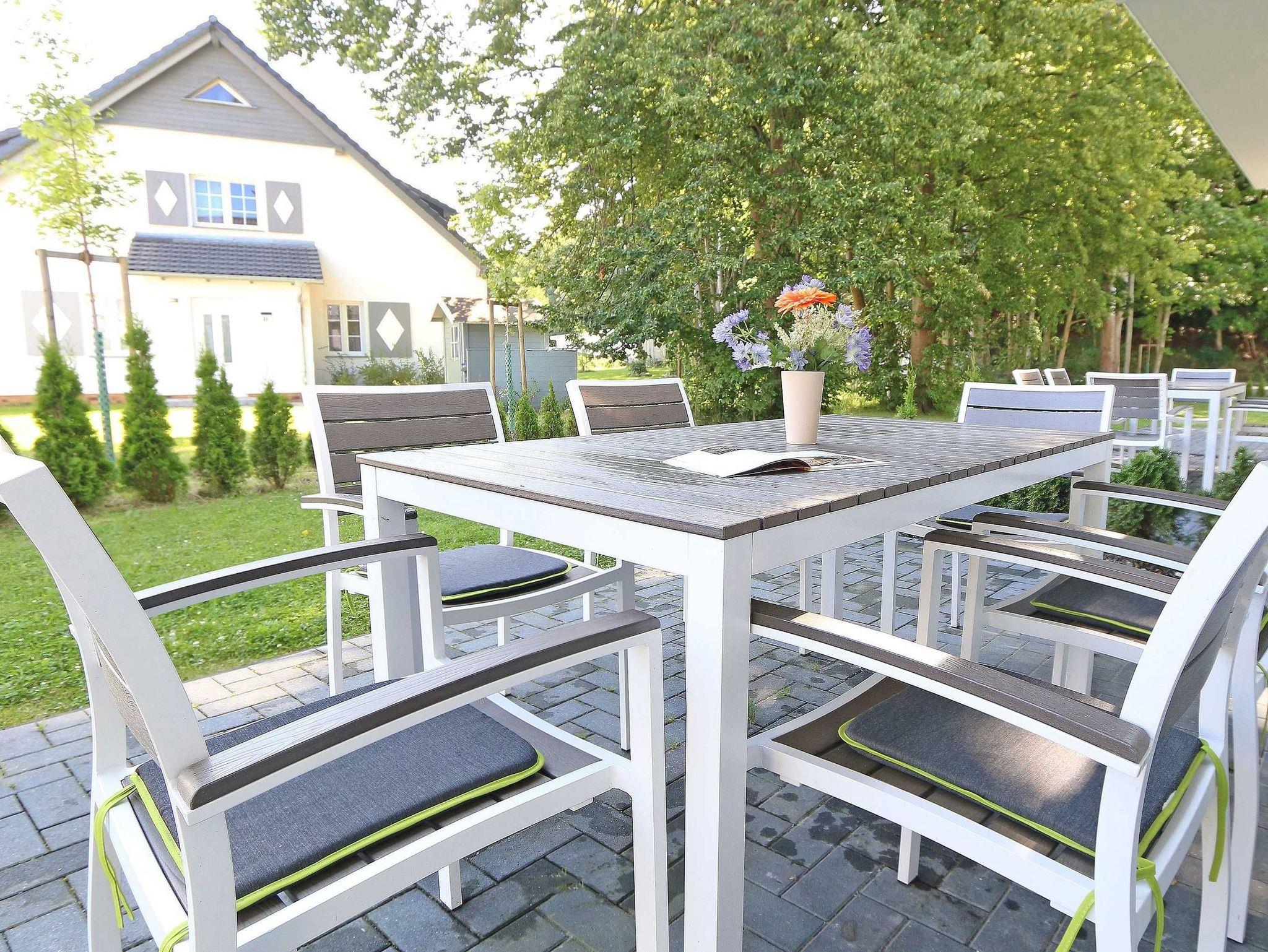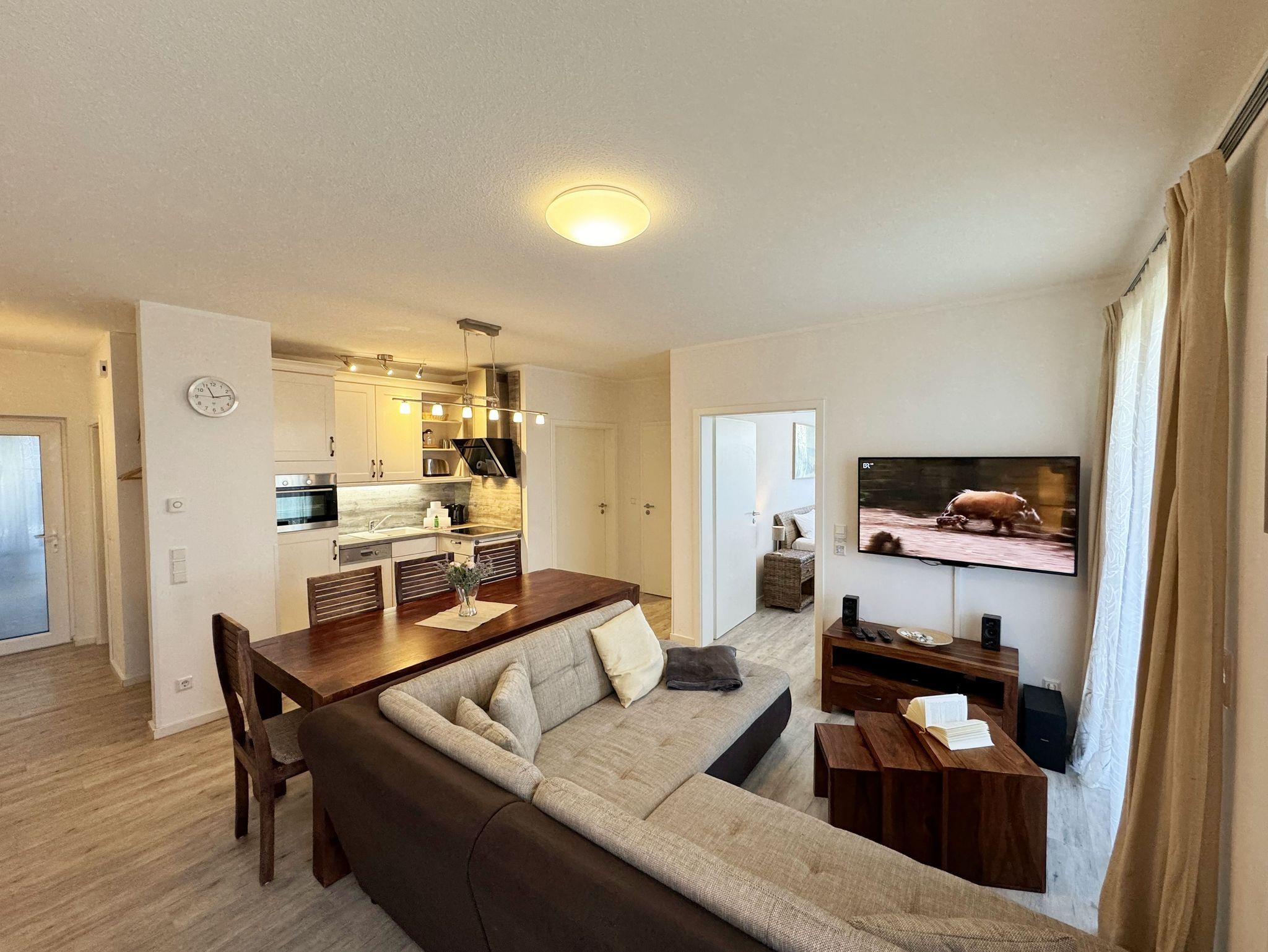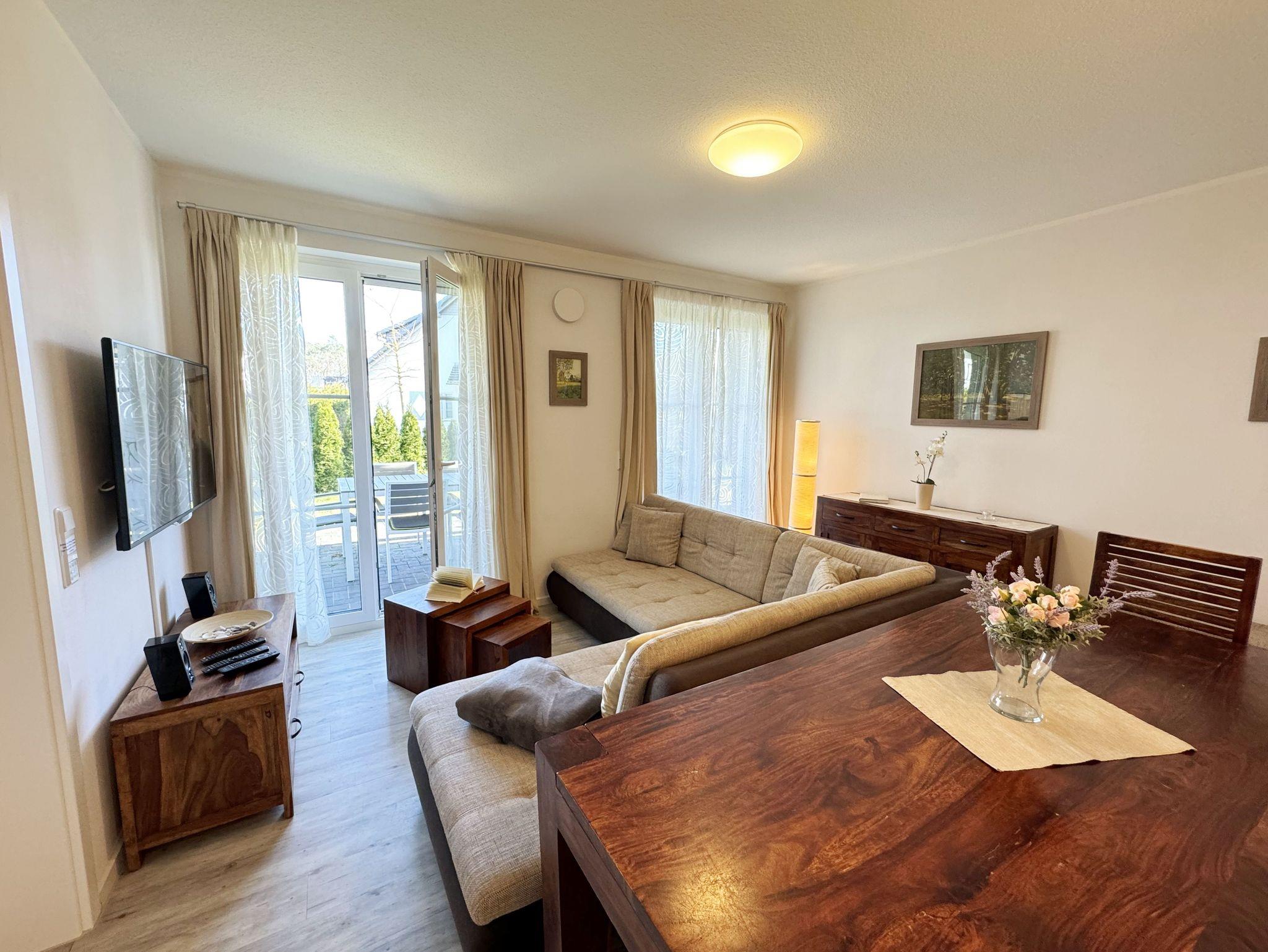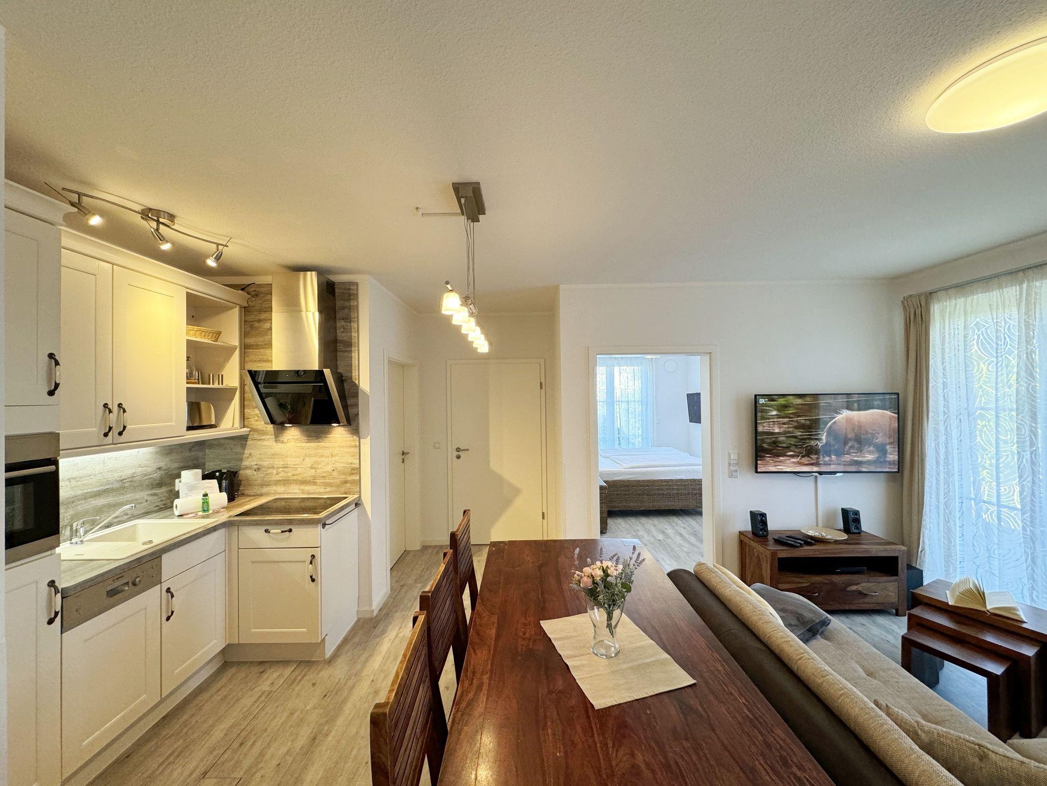 Die ca. 68m² große Erdgeschosswohnung (Nichtraucher) mit dem Namen Sandperle bietet Platz für 2 bis 6 Personen. Der offene Wohnbereich wurde mit Massivholzmöbeln, einer gemütlichen Eckcouch sowie mit einem 50 Zoll LED-Flachbildschirm mit Blu-ray-Player und einer Stereoanlage ausgestattet. Auch im Urlaub brauchen Sie auf einen Internetanschluss (WLAN) nicht verzichten. Dieser ist für Sie inklusive. Auch textiles Kinderspielzeug, eine kleine Sammlung von Büchern sowie Gesellschaftsspiele können genutzt werden. Im angrenzenden Essbereich befinden sich ein großer Esstisch mit 4 Stühlen und eine Sitzbank, wo Sie tolle Urlaubsstunden mit Freunden oder Familie verbringen können. Die integrierte Küchenzeile mit Kühlschrank + Gefrierfach, Ceranfeld, Backofen, Geschirrspüler, Wasserkocher, Toaster, Kaffeemaschine, Handmixer, Kindergeschirr + Besteck und diversen Küchenutensilien laden zum selbst kochen ein. Vom Wohnbereich hat man einen direkten Zugang zur ostseitigen und bestuhlten Terrasse mit Grill. Im ersten Schlafzimmer befindet sich ein Doppelbett (2x 0,90 m x 2,00m) in Komforthöhe (60cm) und zwei 7 -Zonenkaltschaummatratzen, Nachttischablagen sowie ein Kleiderschrank mit Ordnungssystem und großem Wandspiegel. Ein 40 Zoll LED - Flachbild TV runden das Schlafzimmer ab. Im zweiten Schlafzimmer stehen 2 Kojenbetten (0,80m x 2,00m), die mit wenigen Handgriffen auf eine Liegefläche von 1,60 m als Doppelbett vergrößert, werden können zur Verfügung. Der Kleiderschrank hat ebenfalls ein Ordnungssystem. Das Tageslicht - Bad besitzt eine bodengleiche Dusche, eine separate Lüftung, Fön, WC und Waschtisch mit Spiegelbeleuchtung. Alle Räumlichkeiten sind mit einer Fußbodenheizung, elektrische Rollläden und mit einer kontrollierten Be- & Entlüftungsanlage versehen. Im Wirtschaftsraum steht Ihnen eine Waschmaschine zur inklusiven Nutzung zur Verfügung sowie diverse Reinigungsutensilien. Für unsere kleinen Gäste sind 1x Kinderreisebett (ohne Matratze und Bettinlett), 1x Hochstuhl, eine Wickelauflage und ein Töpfchen inklusive. Ein PKW-Stellplatz Nr. 01 und ein eigener abschließbarer Fahrradschuppen sind direkt am Haus. Haustiere sind nicht erlaubt. Die Erstausstattung eines Wäschepaketes (komplette Bettwäsche, 1 Duschhandtuch, 2 kleine Handtücher) können Sie bis 14 Tage vor Anreise gegen einen Aufpreis dazu buchen oder durch eigene ergänzen. Ab 2 gebuchten Paketen erhalten Sie einmalig 1 Geschirrhandtuch und 1 Duschvorleger hinzu.