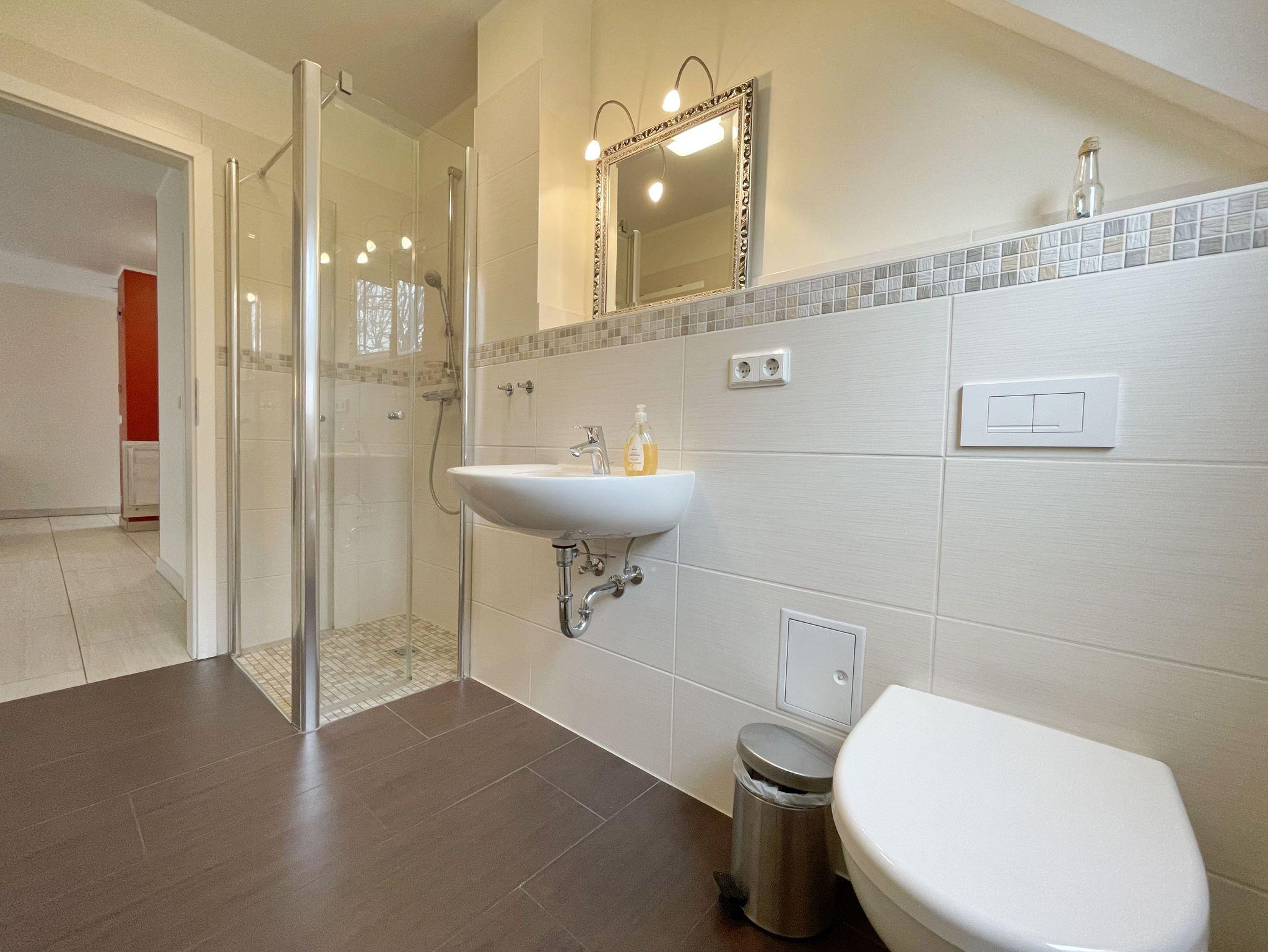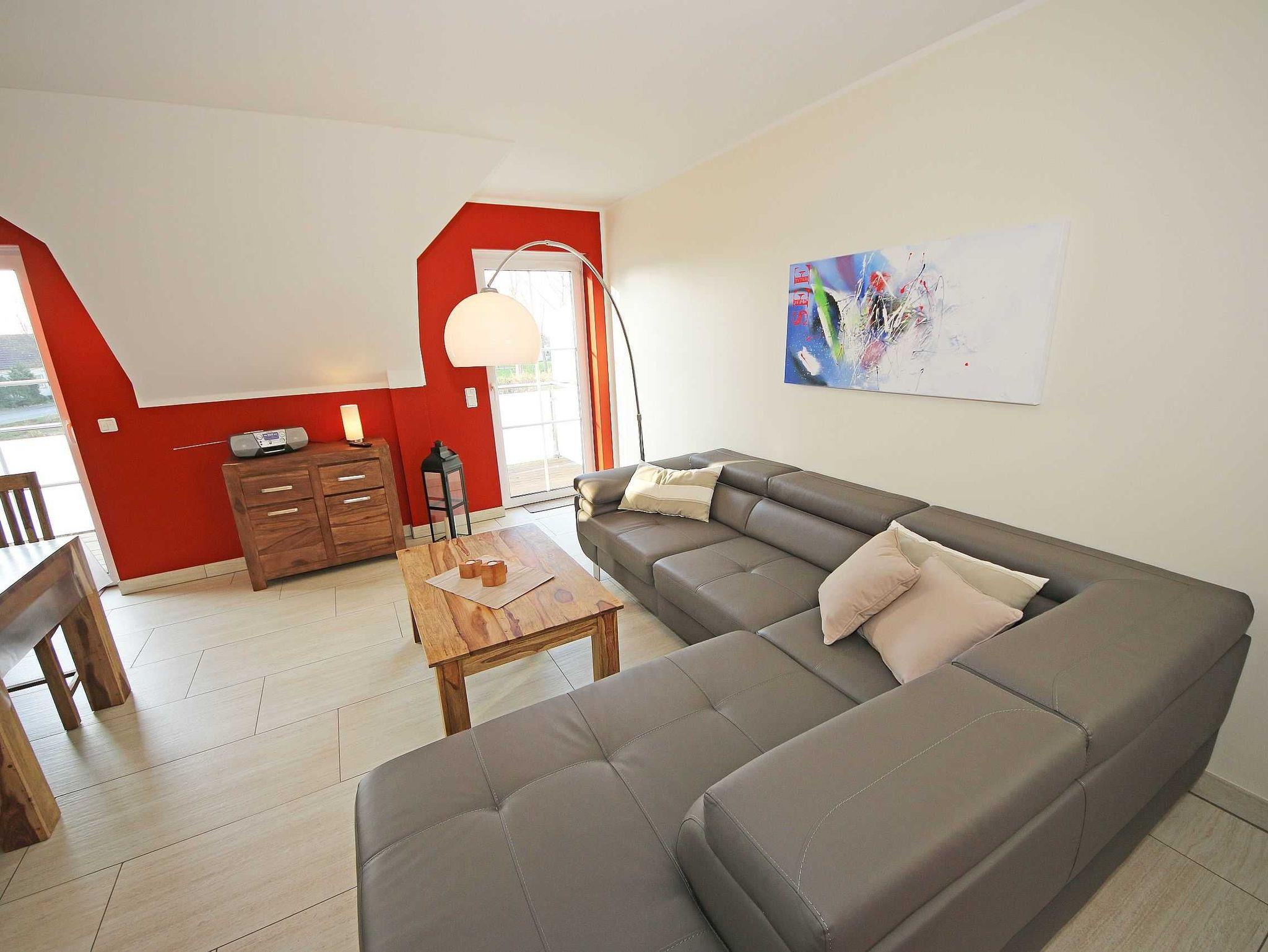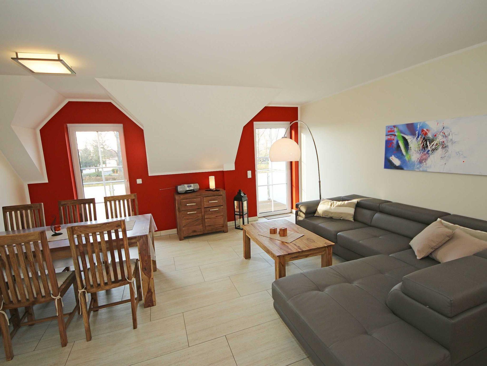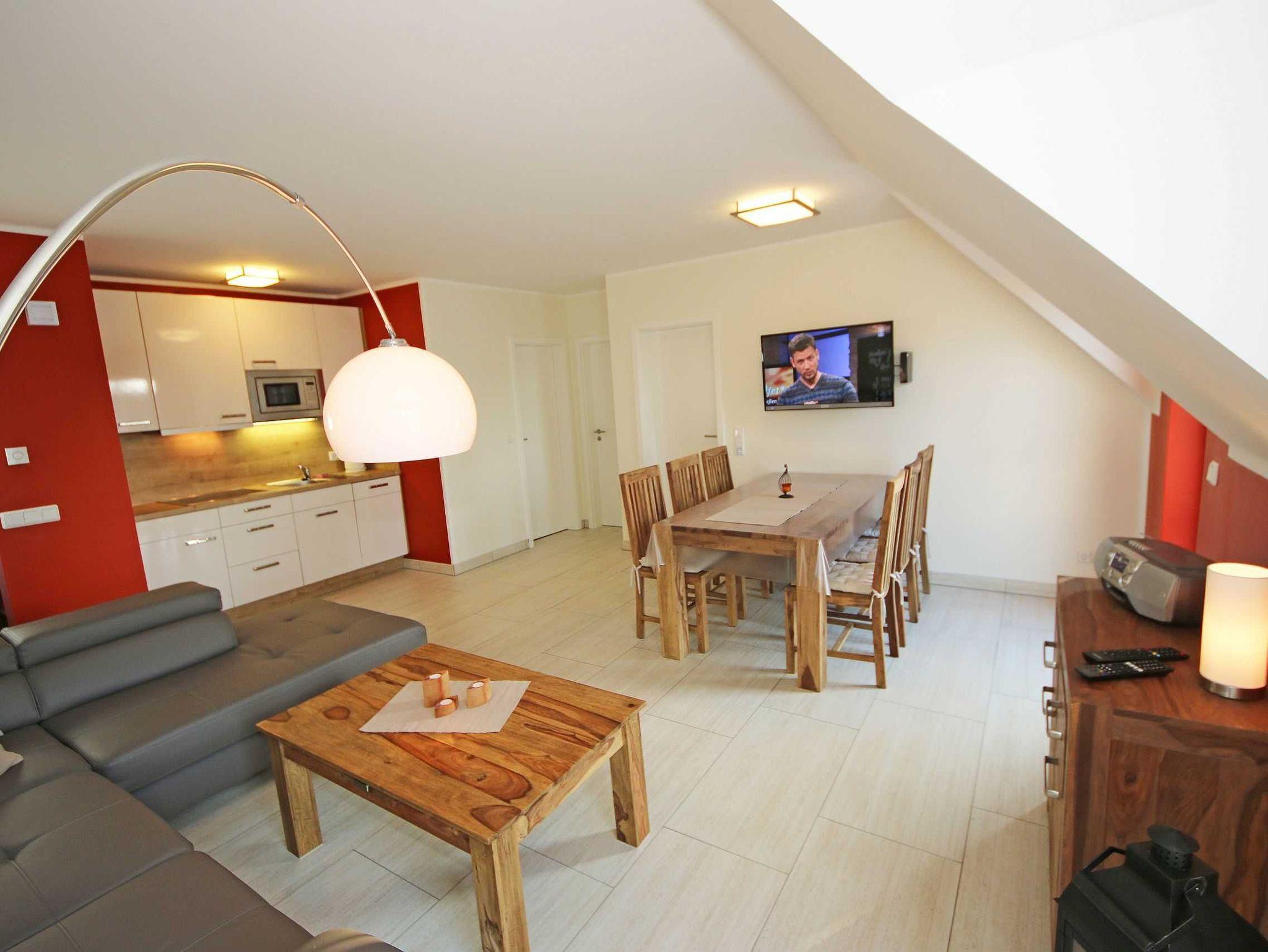 Die 64 qm große Nichtraucherferienwohnung ist für 2 bis 5 Erwachsene und 1 Kleinkind bis 3 Jahre im Kinderreisebett ausgelegt. Durch die Dachschrägen erhält die Ferienwohnung eine individuelle Note mit besonderer, wohnlicher Behaglichkeit. Für den unbeschwerten Aufenthalt steht Ihnen ein großzügiger Wohnbereich zur Verfügung, in dem eine komplett ausgestattete Küchenzeile mit Geschirrspüler, Ceran-Kochfeld, Dunstabzugshaube, Kühlschrank mit Eisfach, Spüle, Mikrowelle, Toaster, Wasserkocher, Kaffeemaschine sowie diverse Küchenutensilien und ein komfortabler Esstisch mit 6 Stühlen integriert ist. Vom Wohnbereich erreichen Sie beide Schlafzimmer. Im ersten Schlafzimmer befinden sich ein Doppelbett (2 x 0,90 m x 2,00 m), Nachttischablagen sowie ein Kleiderschrank. Das zweite Schlafzimmer verfügt ebenfalls über ein Doppelbett (2 x 0,90 m x 2,00 m), Nachttischablagen, einen Kleiderschrank sowie ein zusätzliches Einzelbett (0,90 m x 2,00 m) sowie Insektenschutzgitter. Beide Schlafzimmer sind mit Teppichboden versehen. Das Kinderreisebett kann in beiden Schlafzimmern aufgestellt werden. Der Wohnraum verfügt über eine gemütliche Couchecke mit Couchtisch, dimmbare Beleuchtung, Leselampe, großen Flachbild-TV mit TV Fire Stick, Blu-Ray-Player, Sideboard mit Gesellschaftsspielen und Radio. Auch auf einen Internetanschluss (WLAN) müssen Sie im Urlaub nicht verzichten. Dieser ist inklusive für Sie. Besonderheiten der Ferienwohnung sind die Fußbodenheizung in allen Räumen, eine kontrollierte und dezentrale Lüftungsanlage sowie Verdunklungsmöglichkeiten in den Schlafzimmern. Im Tageslichtbad profitieren Sie nicht nur von der Fußbodenheizung, sondern auch zusätzlich vom beheizbaren Handtuchtrockner und zuschaltbarer Ventilator-Lüftungseinrichtung. Eine ebenerdige Dusche, WC, Fön, Kosmetikspiegel, Insektenschutzgitter und Waschplatz runden den Sanitärbereich ab. Den bestuhlten Balkon (Süd/West-Ausrichtung) mit Sonnenschirm erreichen Sie vom Wohnbereich. Für unsere kleinen Gäste sind 1x Kinderhochstuhl und 1x Kinderreisebett (ohne Matratze und Bett Inlett) inklusive. Im kleinen Abstellraum befinden sich eine Waschmaschine, ein Staubsauger, Reinigungsutensilien sowie ein Wäscheständer. Der PKW-Stellplatz Nr. 08 befindet sich direkt am Haus. Zur Wohnung gehört auch ein abschließbarer Schuppen, wo Sie Ihre geliehenen oder mitgebrachten Fahrräder einschließen können. Haustiere sind nicht erlaubt. Die Erstausstattung eines Wäschepaketes (komplette Bettwäsche, 1 Duschhandtuch, 2 kleine Handtücher) können Sie bis 14 Tage vor Anreise gegen einen Aufpreis dazu buchen oder durch eigene ergänzen. Ab 2 gebuchten Paketen erhalten Sie einmalig 1 Geschirrhandtuch und 1 Duschvorleger dazu.