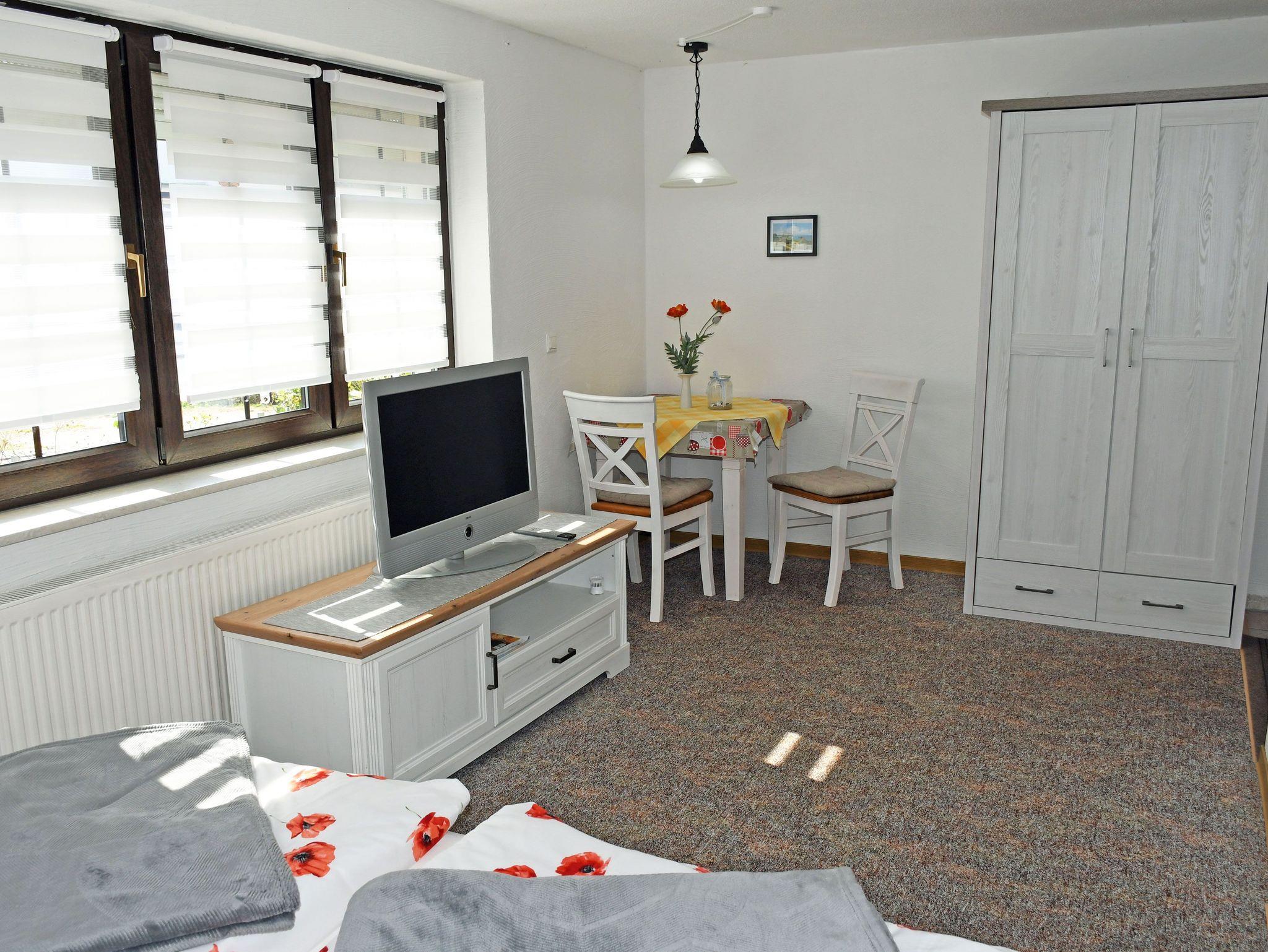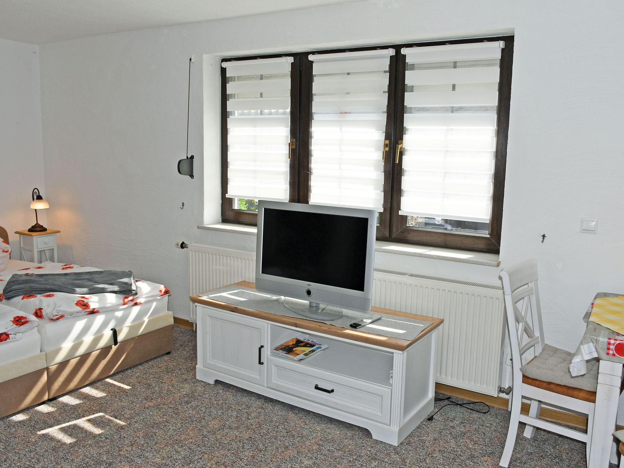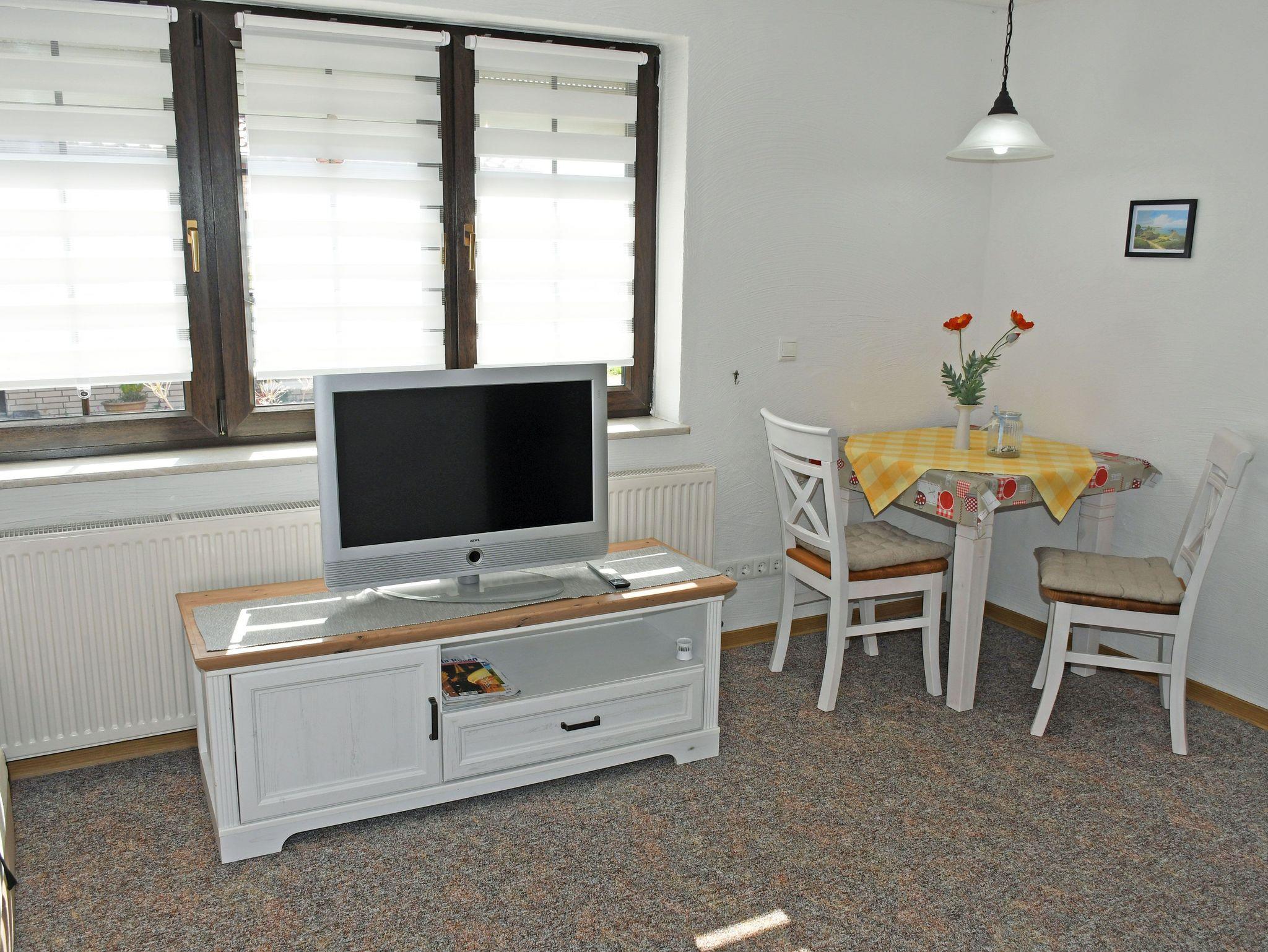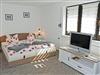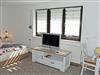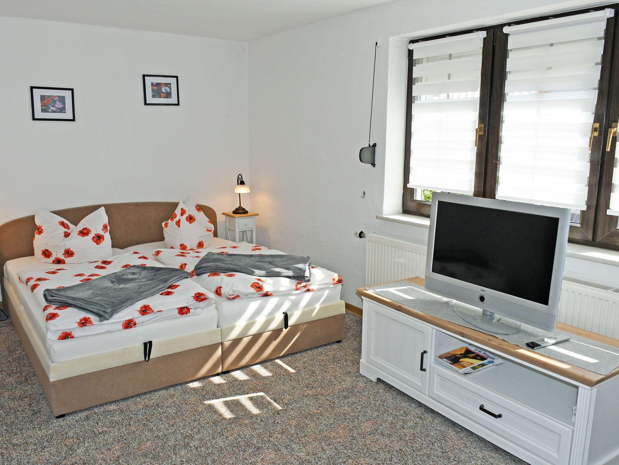Im Wohn-/Schlafraum befinden sich ein bequemes Doppelbett mit Nachtischen und Leselampen, div, Schränke zur Ablage, ein Tisch mit Stühlen und ein modernes Flachbild-TV-Gerät sowie WLAN.