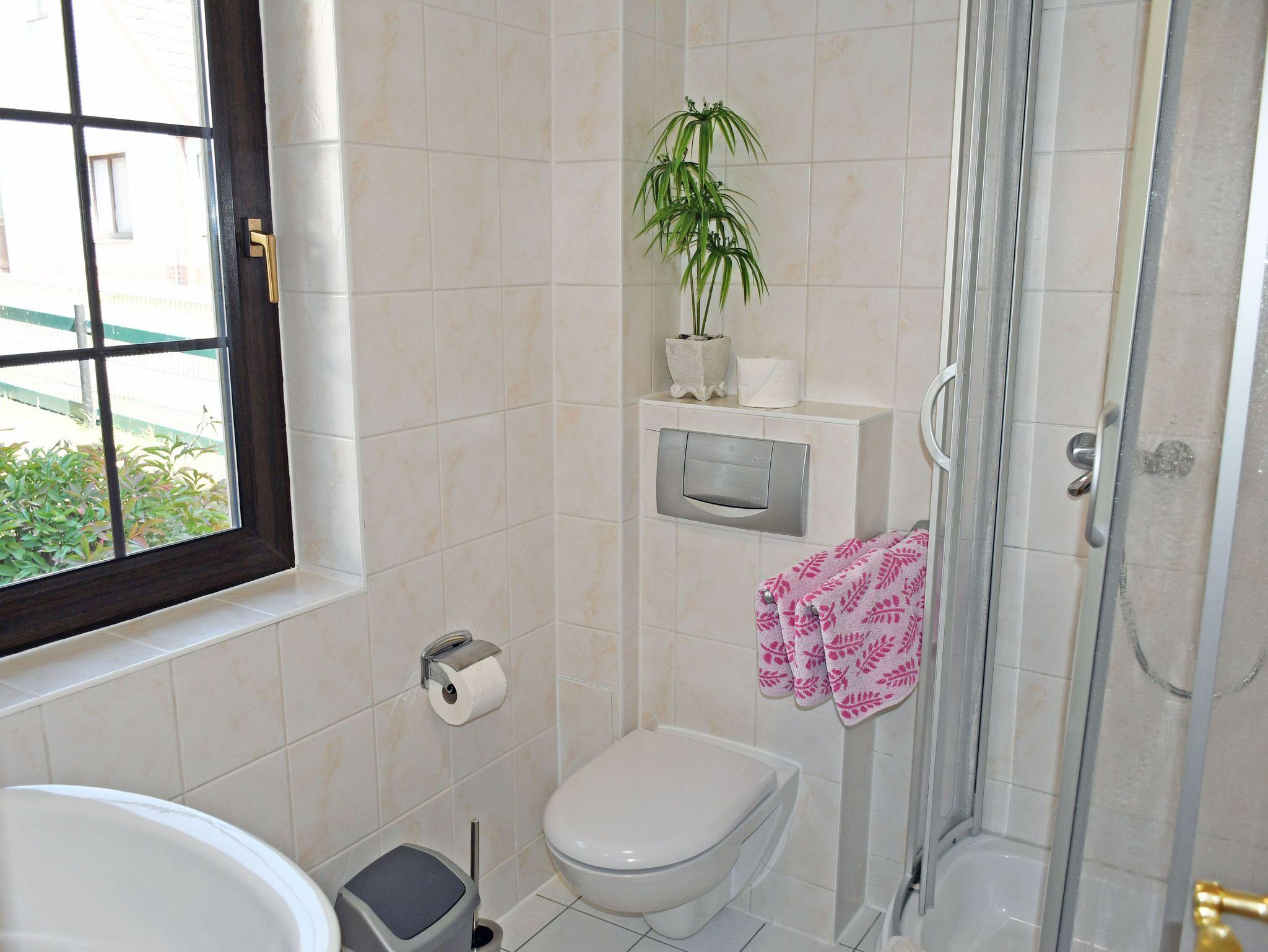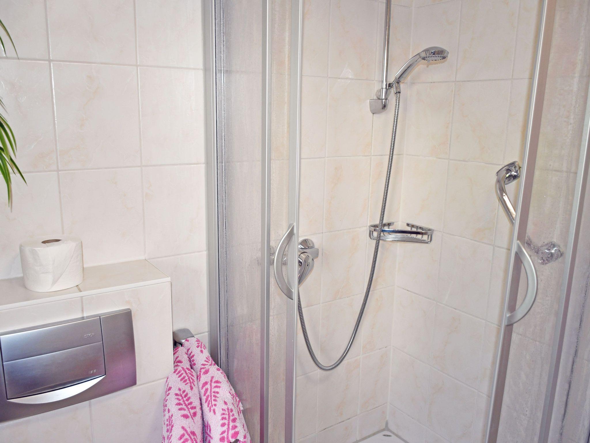 Das Bad ist mit Dusche, WC und Waschtisch ausgestattet und verfügt über Tageslicht.