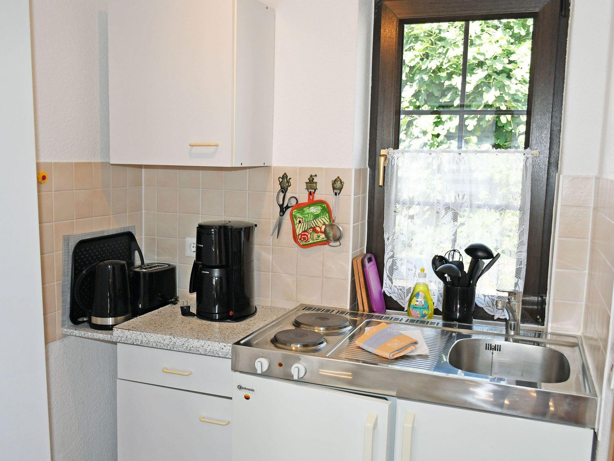 Die kleine Küchenzeile ist mit einem Herd, Wasserkocher, Kaffeemaschine, Toaster und Kühlschrank komplett ausgestattet.