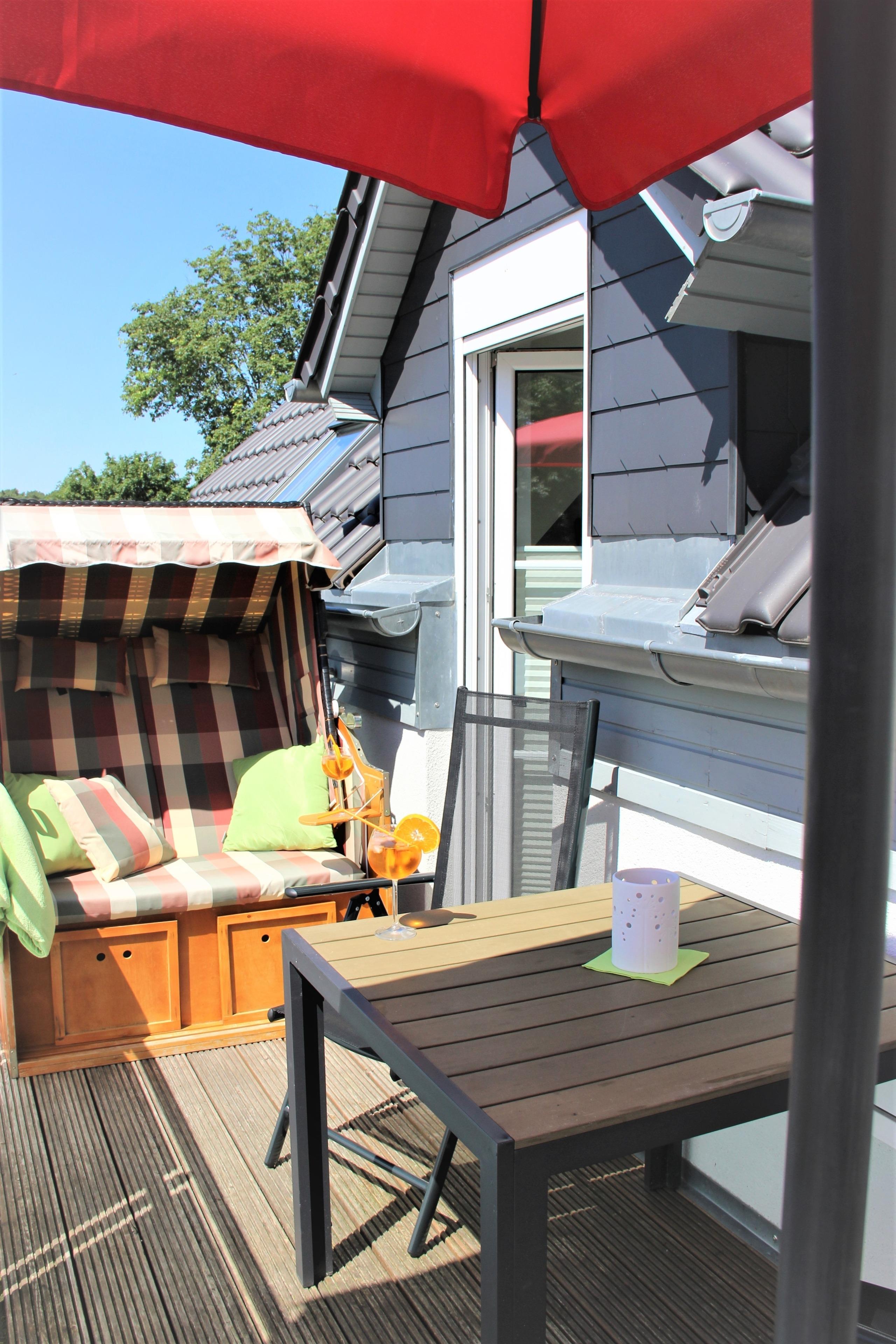 Lassen Sie den Abend nach einem erlebnisreichen Tag gemütlich im Strandkorb auf dem Balkon ausklingen.