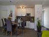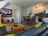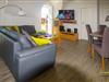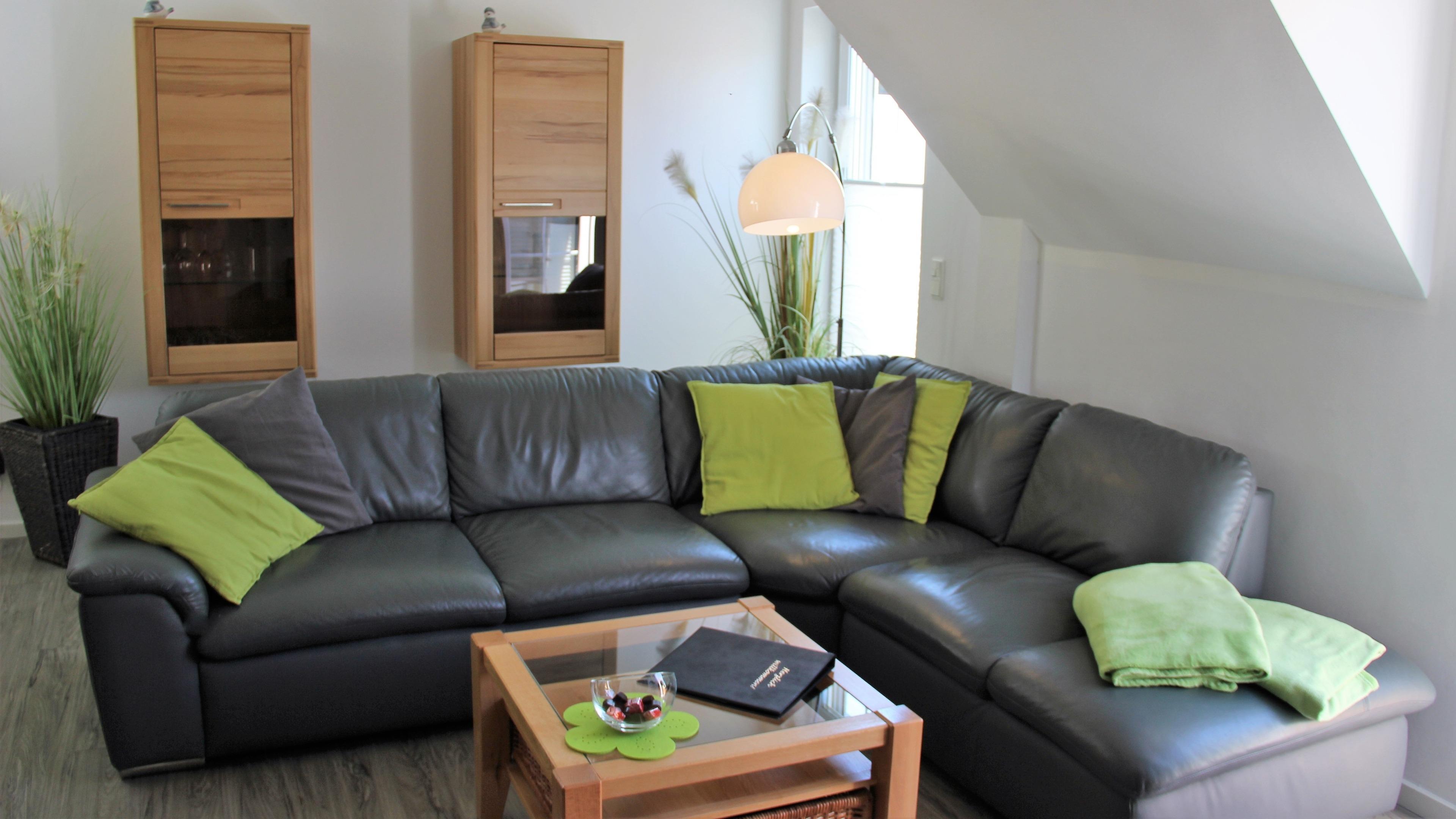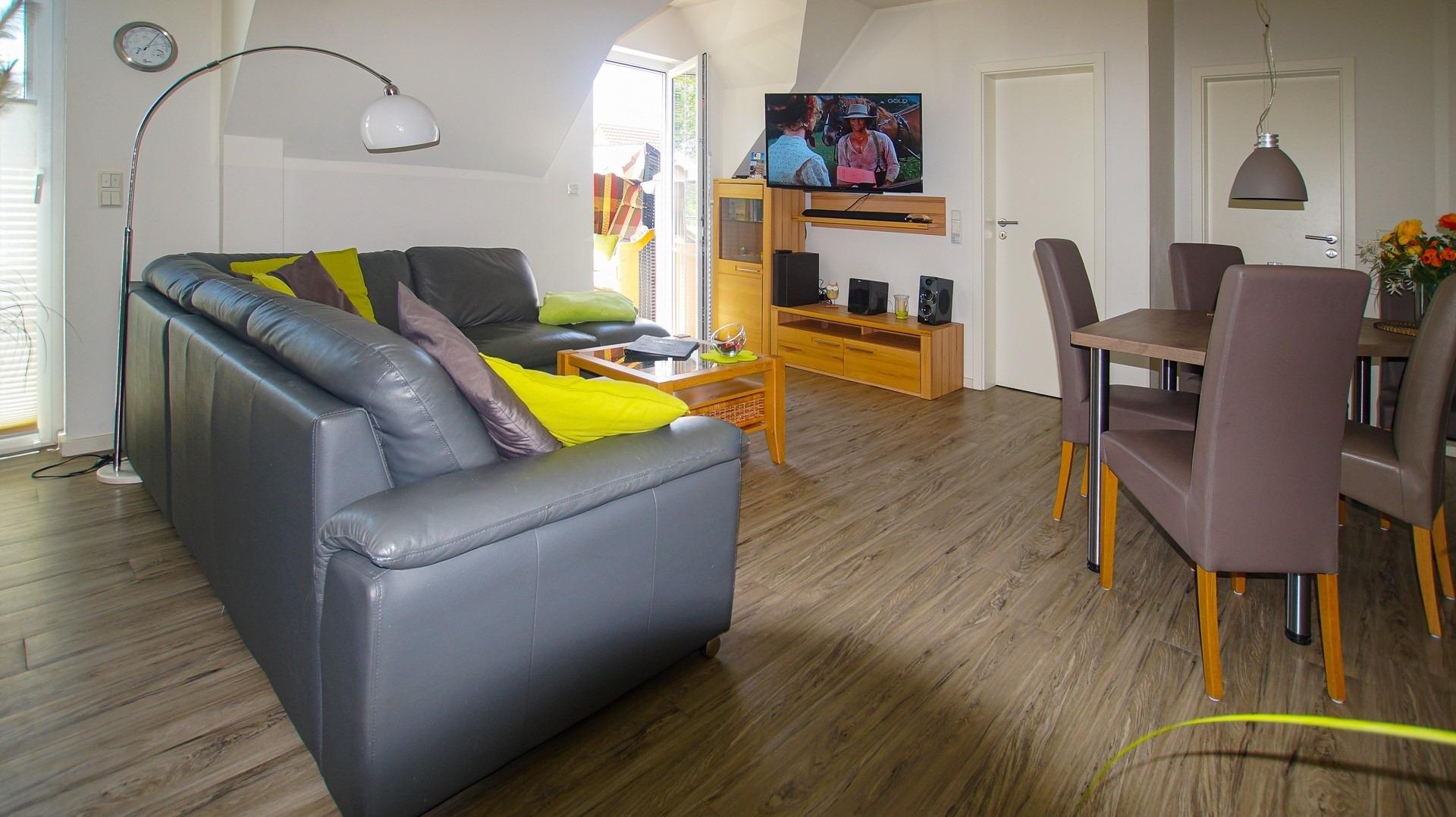 Im großzügigen Wohnbereich laden eine Ledercouch und ein Flachbildfernseher zu geselligen Abenden ein. Der Essbereich ist im Wohnbereich integriert und ein Tisch mit 5 Stühlen bietet hier ausreichend Platz zum gemeinsamen Essen.