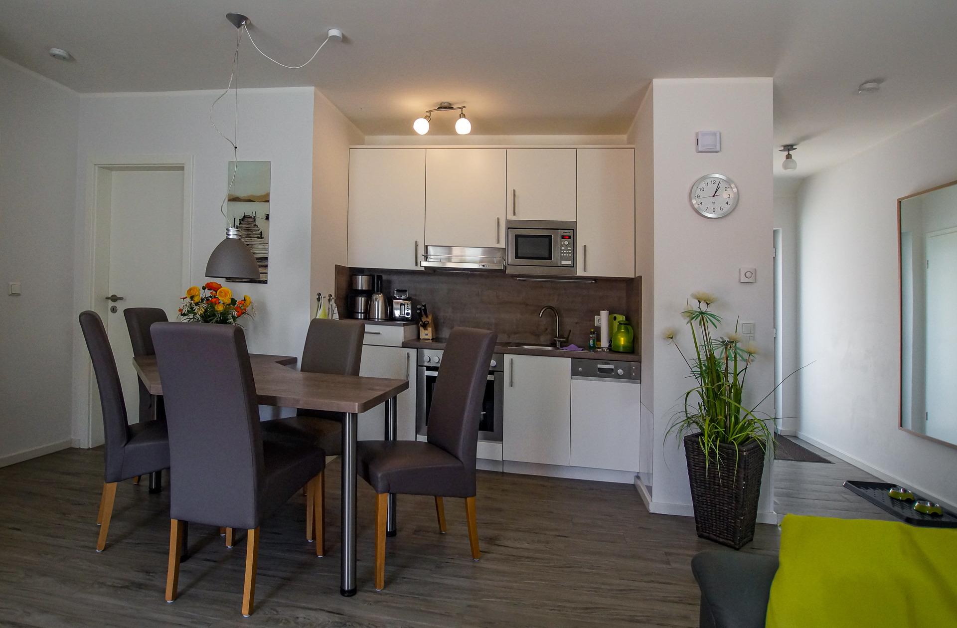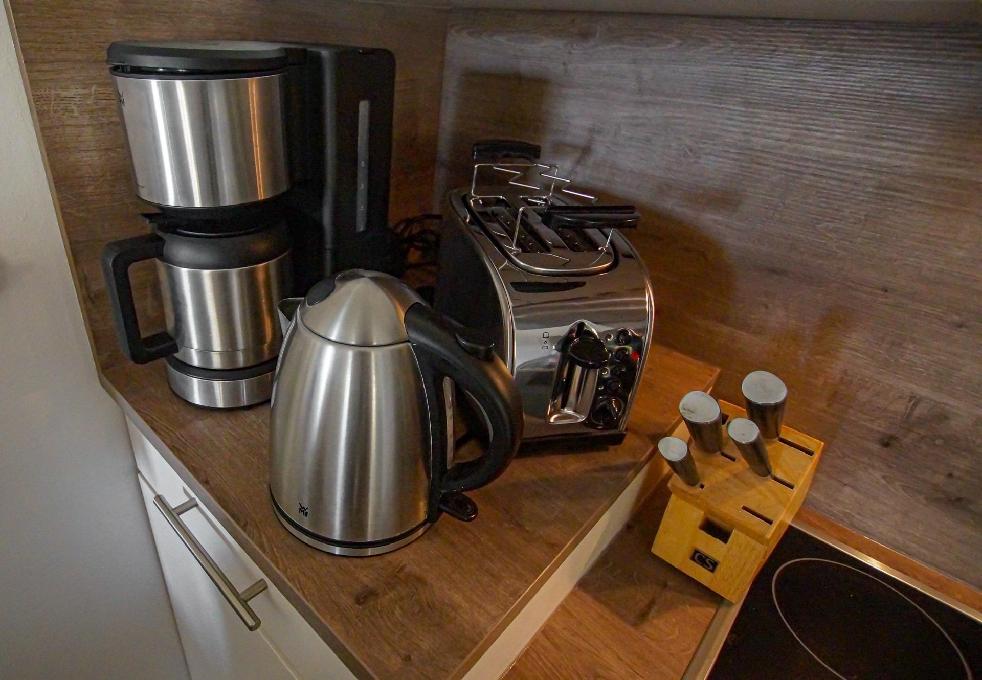 Die hier angrenzende Küchenzeile ist mit einem Kühlschrank mit Gefrierfach, einem Geschirrspüler, einem Backofen mit Cerankochfeld und einer Mikrowelle ausgestattet. Eine Kaffeemaschine, ein Toaster, ein Eierkocher und ein Wasserkocher stehen Ihnen hier selbstverständlich zur Verfügung.