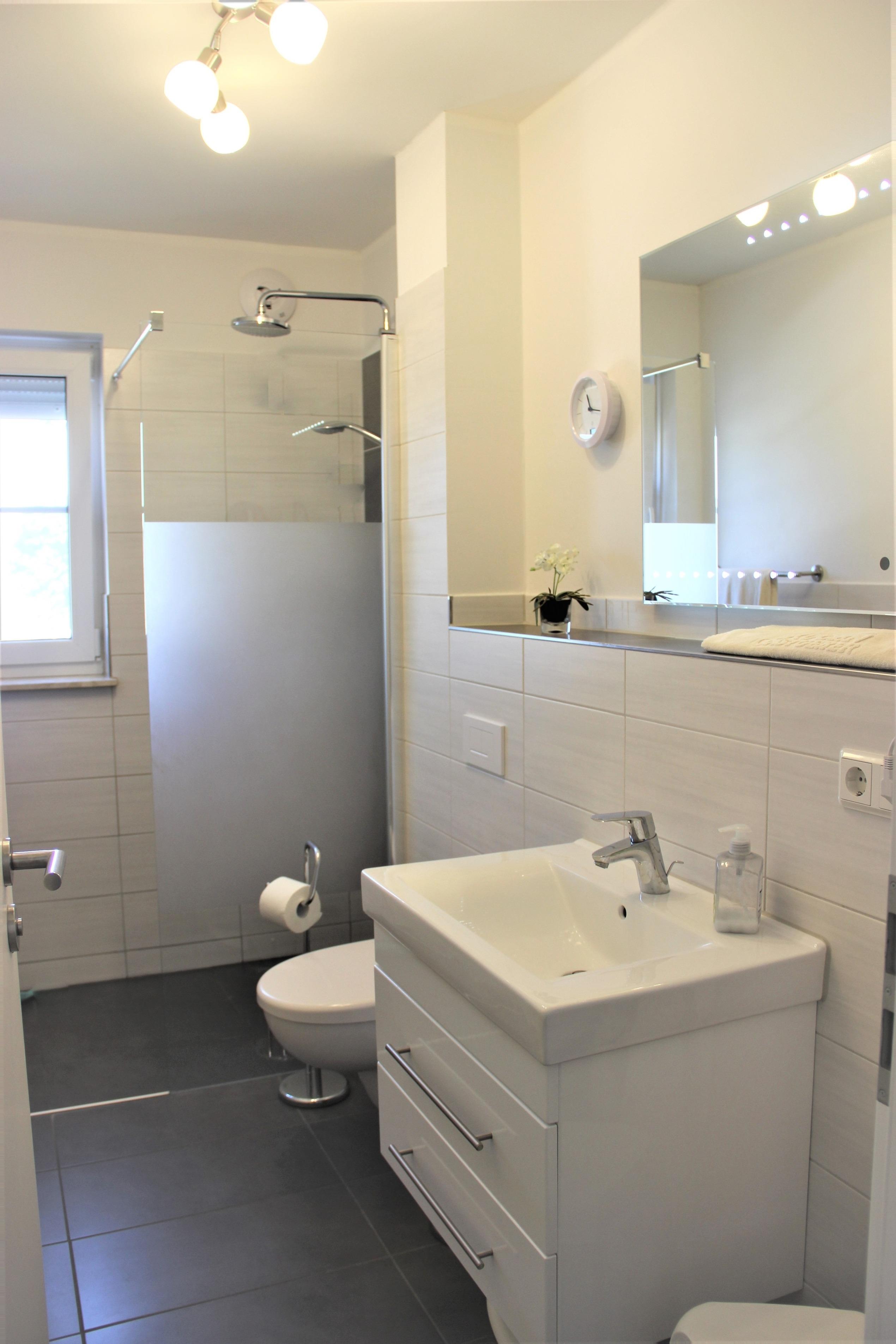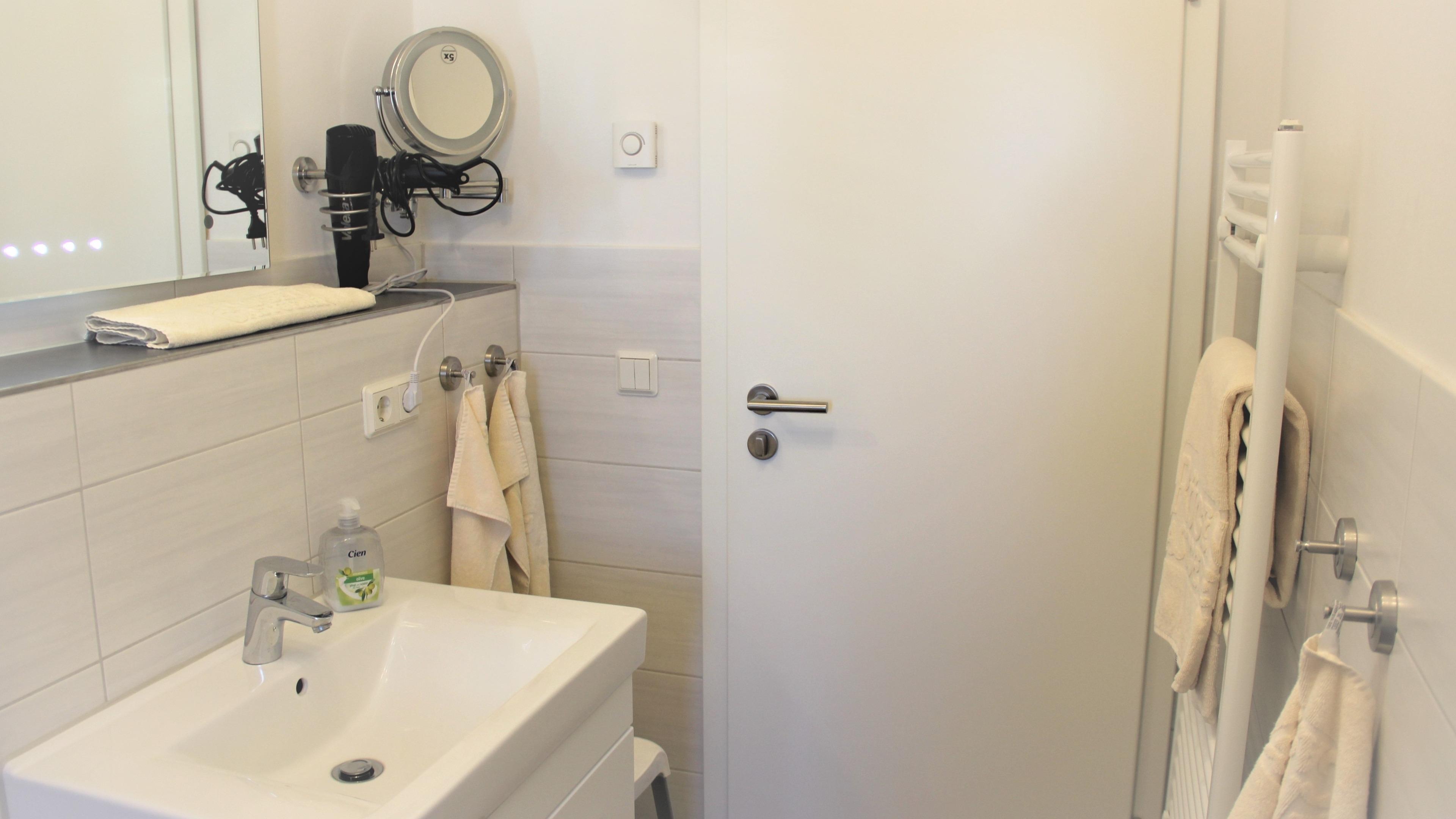 Das Badezimmer ist mit einer Regenwasserdusche und WC ausgestattet. Im Schrank haben Sie genügend Stauraum für Ihre Wasch- und Kosmetikutensilien. Ein Duschhocker und Föhn ist ebenfalls vorhanden.