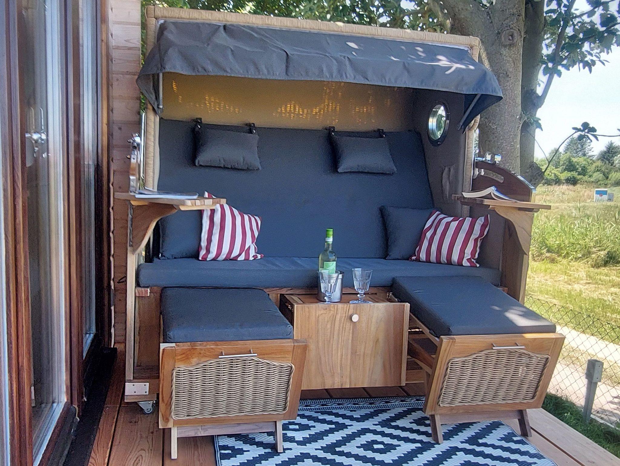 Man betritt das Haus über eine Terrasse mit einer hübsche Bank, hinter dem Haus ist zu Deich eine große Terrasse mit einem 3sitzer Strandkorb von dem aus man die Segel über das Haff gleiten sieht.