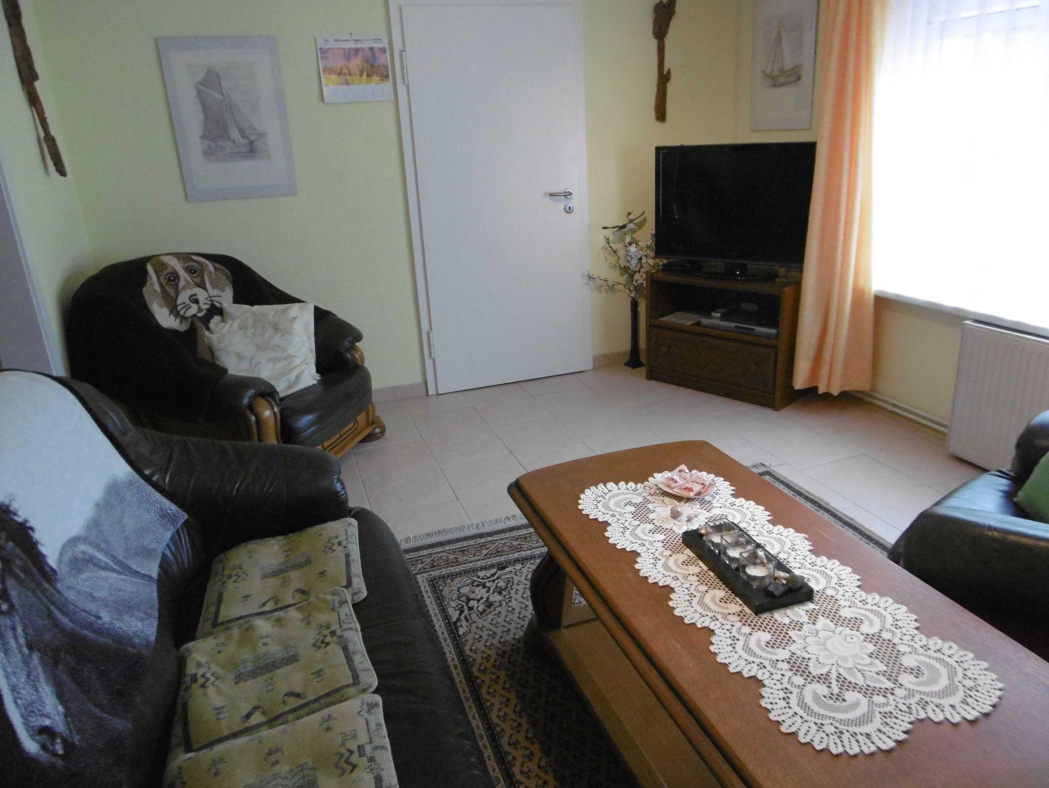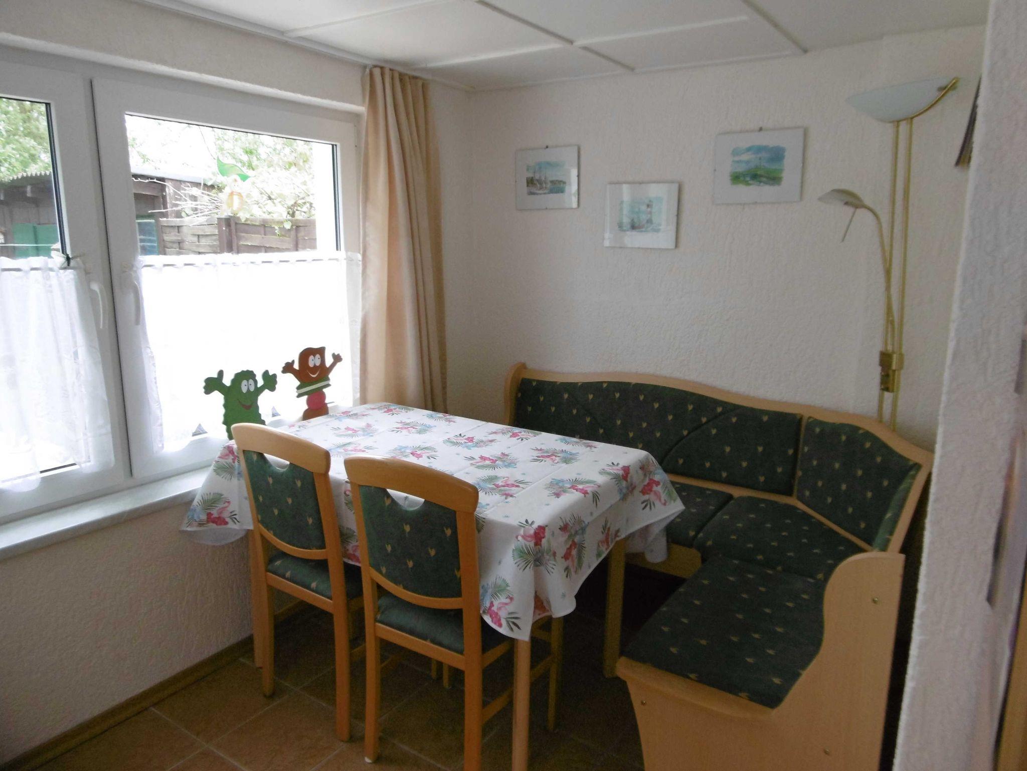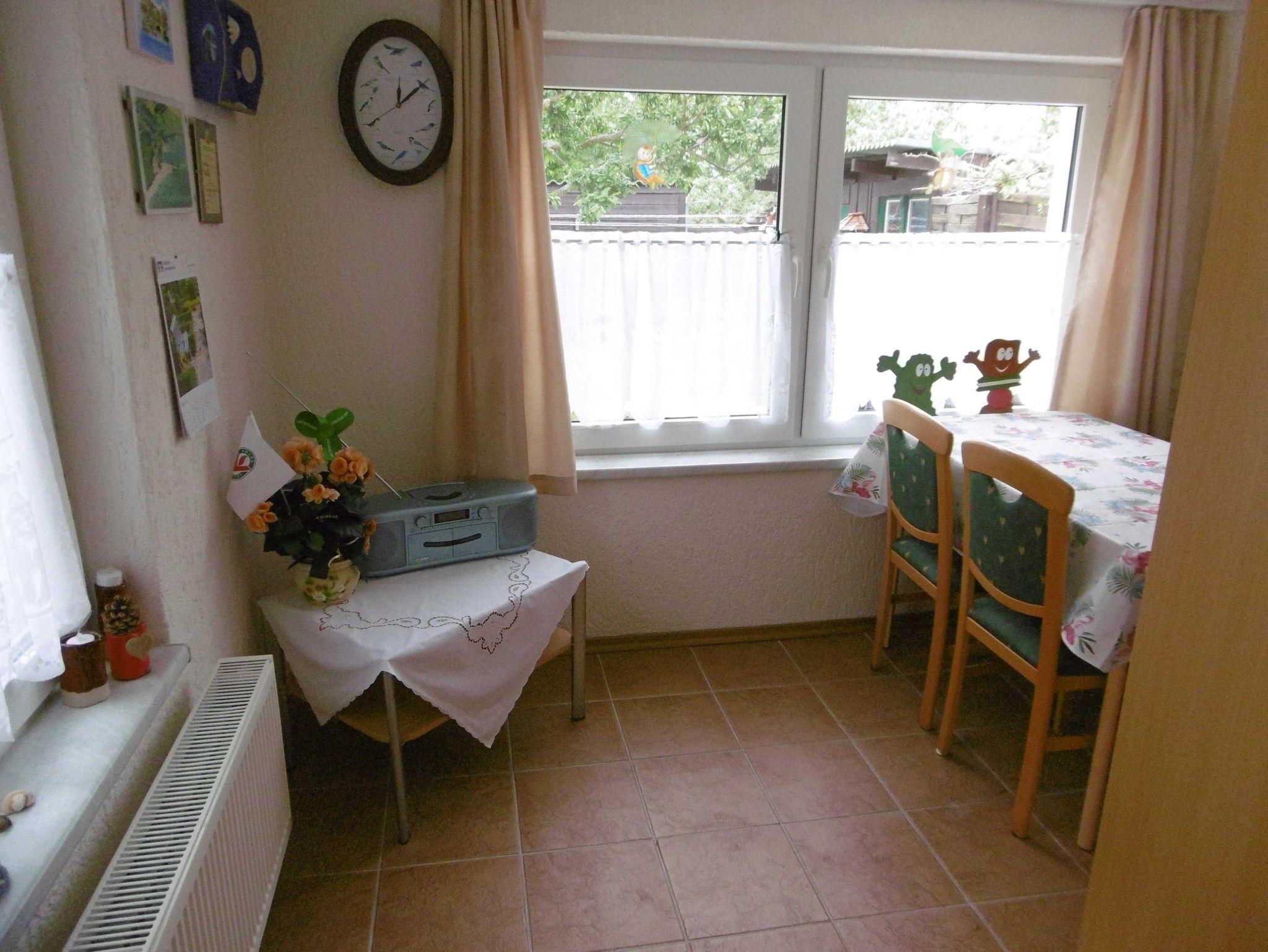 Ebenerdig gibt es eine Veranda mit einem Esstisch für 4 Personen, ein Schlafzimmer mit einem Doppelbett (1,80 X 2 m ),und ein Kinderzimmer mit zwei Einzelbetten 0,80 x1,90m, ein Bad mit DU/WC, sowie ein Wohnzimmer mit SAT - TV. Für Kinder ist viel Spielzeug und Beschäftigungsmaterial im Ferienhaus. Auch gibt es für Leseratten eine Auswahl vielfältiger Bücher.