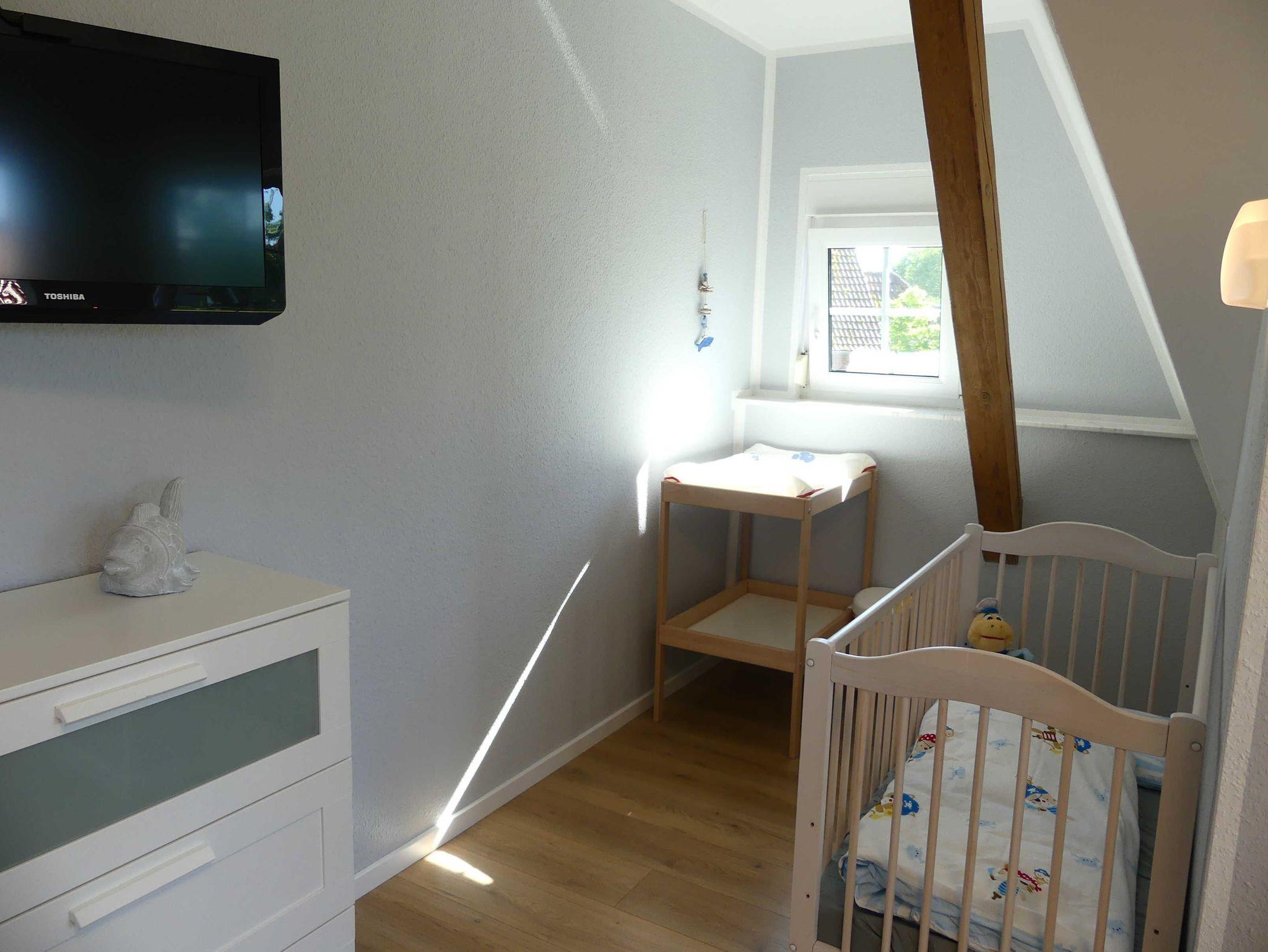• In der oberen Etage befinden sich die Schlafräume. Ein Schlafraum ist mit einem Kinderbett und Wickeltisch ausgestattet.