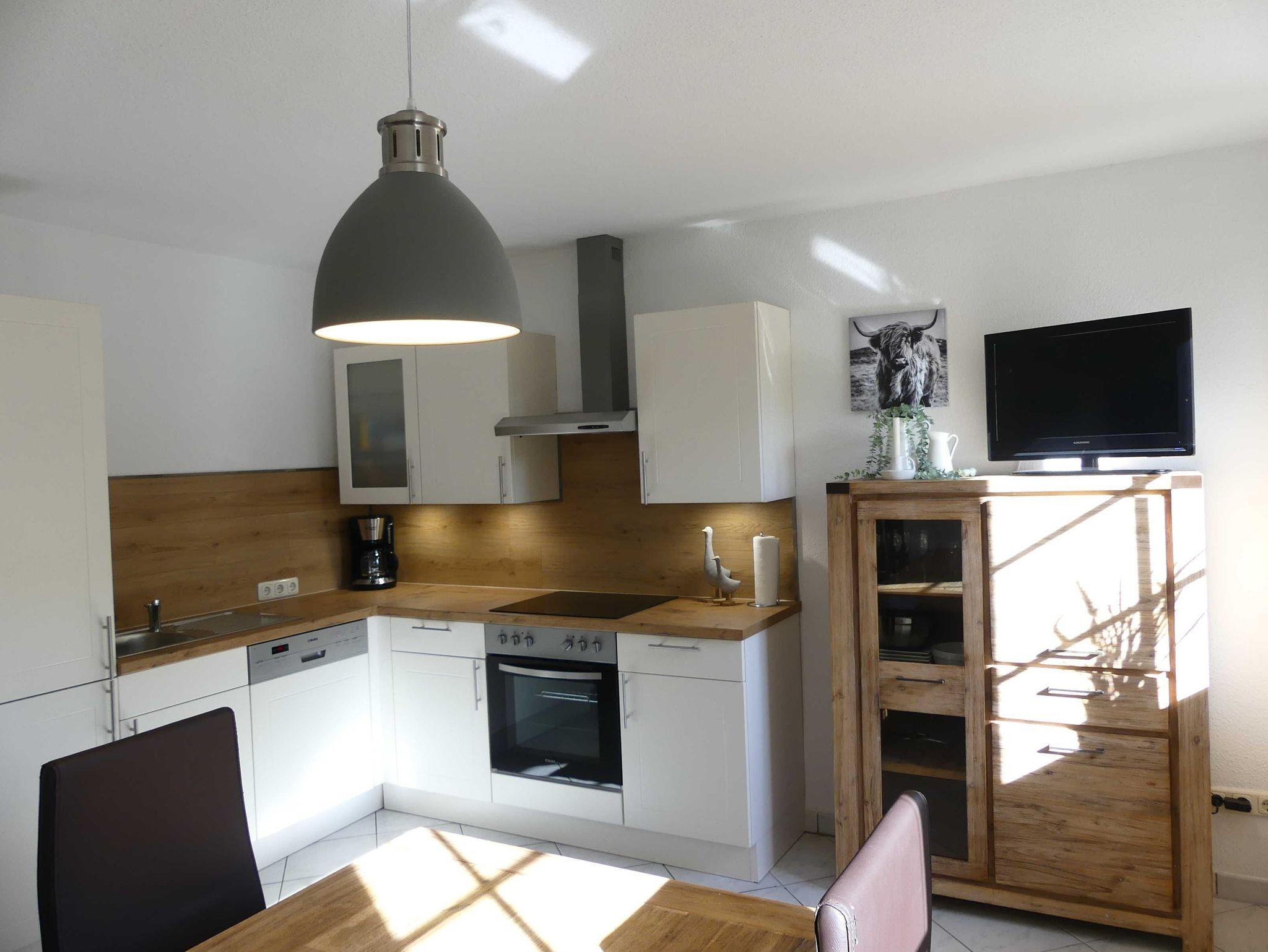 • 1 vollausgestattete Einbauküche mit Geschirrspüler, E-Herd (Cerankochfeld) inkl. Backofen, Kaffeemaschine, Wasserkocher, Kühl- und Gefrierschrank sowie ausreichend Geschirr, Besteck, Töpfe und Pfannen sowie einen Flachbild-TV und einem Esstisch für 6 Personen,