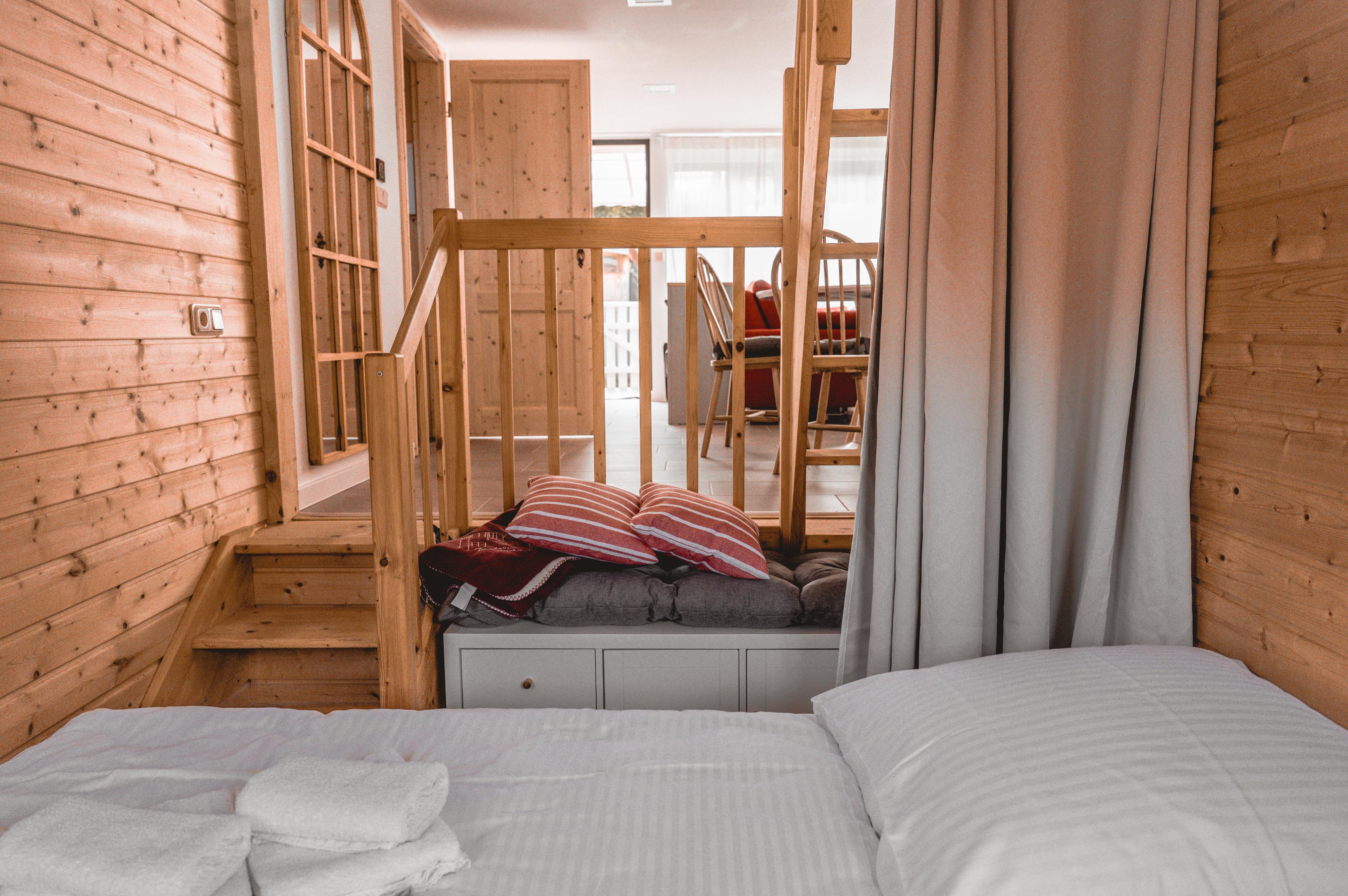 Der Bungalow bietet Platz für bis zu vier Personen und heißt auch Ihre vierbeinigen Freunde herzlich willkommen. Es stehen zwei Schlafzimmer zur Verfügung. Das Schlafzimmer im unteren Turm schafft eine ganz besondere Atmosphäre, während der obere Turm ein perfekter Ort zum Entspannen und Staunen ist - mit seiner gemütlichen Sitzgruppe und der wunderbaren Aussicht auf das Haff und die Siedlung wird es schnell zu Ihrem Lieblingsort. Das zweite separate Schlafzimmer bietet einen gemütlichen Rückzugsort mit viel Privatsphäre – ideal für erholsame Nächte nach einem Tag am Haff. Das offene Wohn- und Esszimmer mit großer Fensterfront schafft eine helle, freundliche Atmosphäre und lädt zum Entspannen ein.