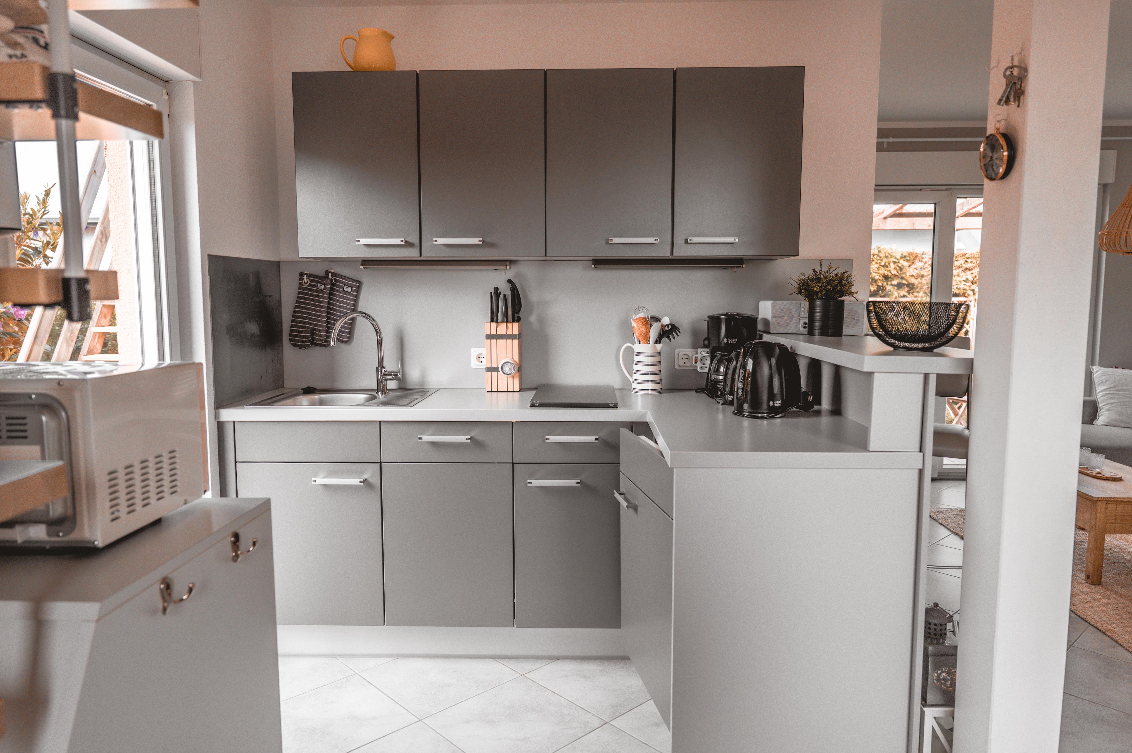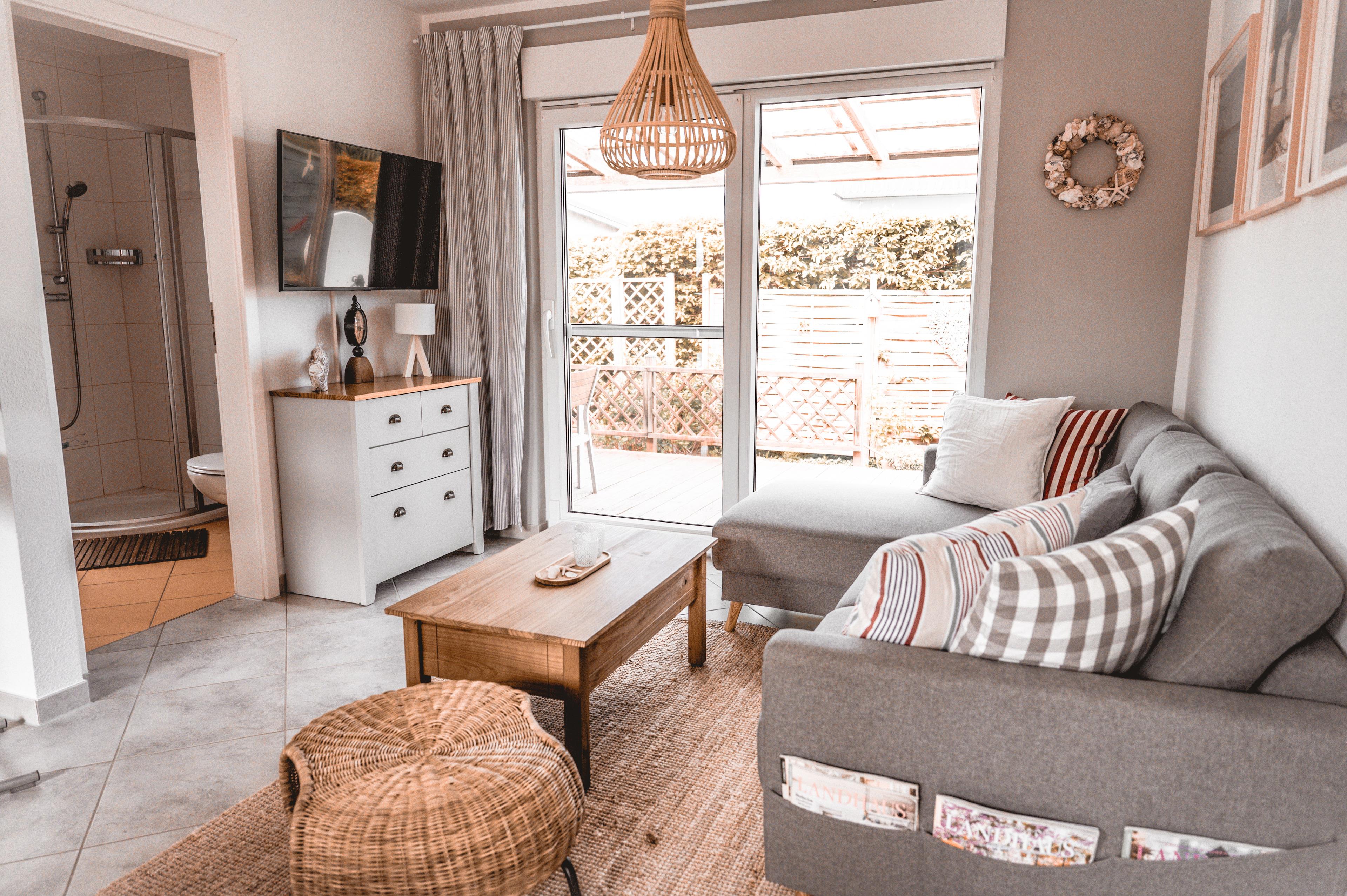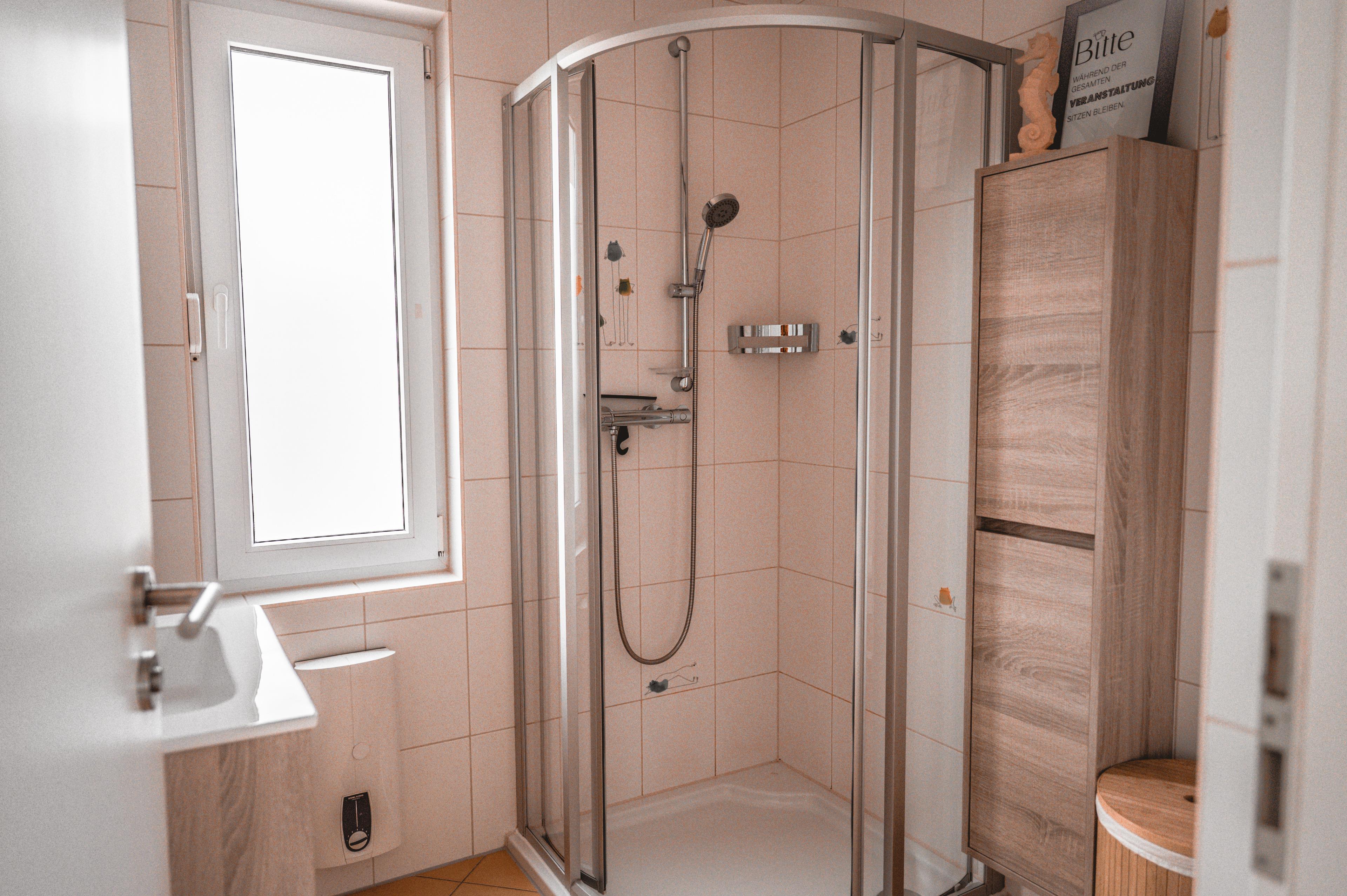 Ihre Einbauküche ist für Sie gut ausgestattet. Bestandteile sind unter anderem zwei Kochplattenfelder, Kaffeemaschine, Mikrowelle, Geschirr, ein Kühlschrank und einiges mehr. Ihr Badezimmer hält eine Duschkabine, Ablageflächen und einen Fön für Sie bereit. Ihre mitgebrachten Utensilien können Sie hier gut verstauen.