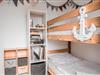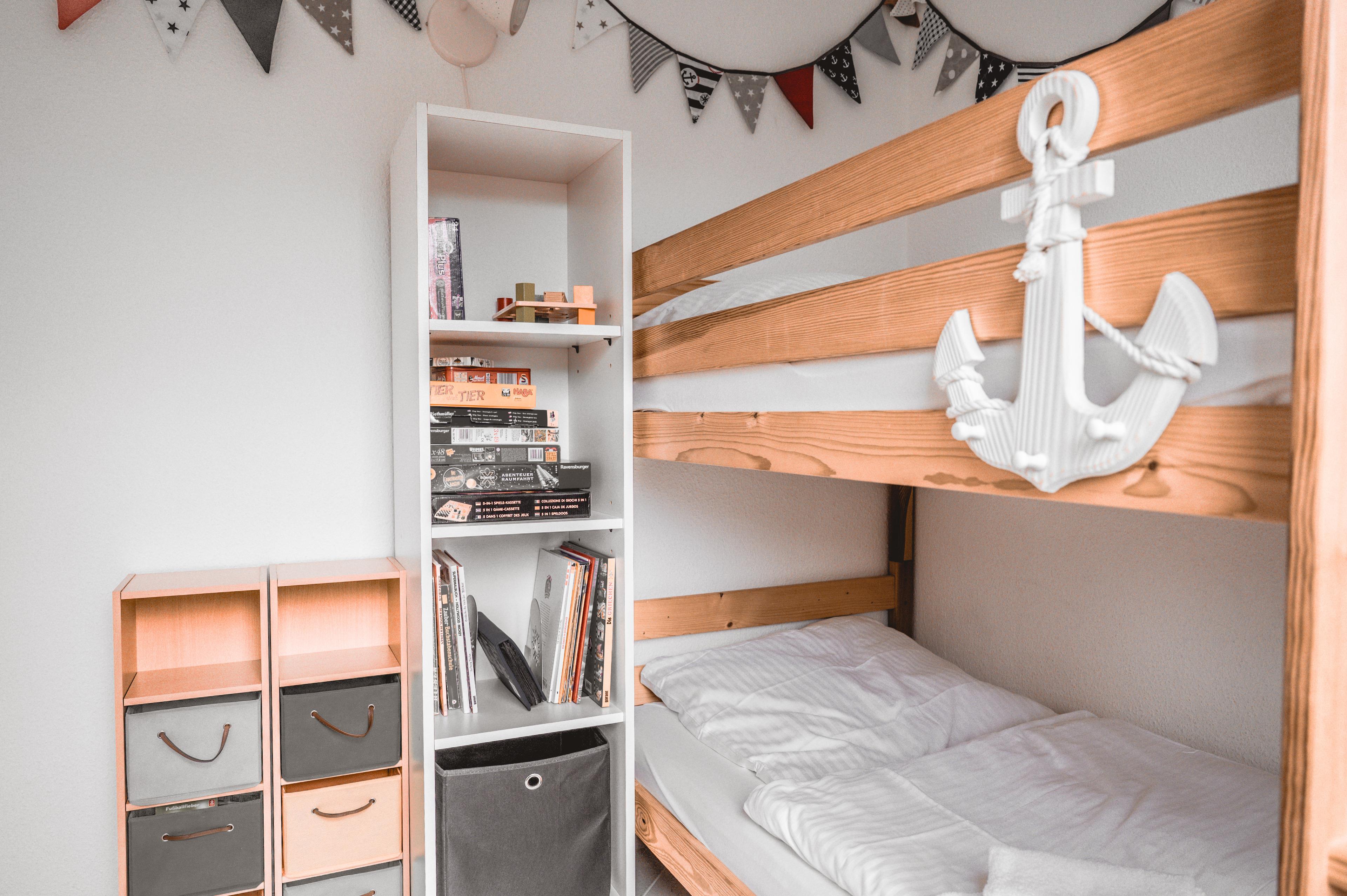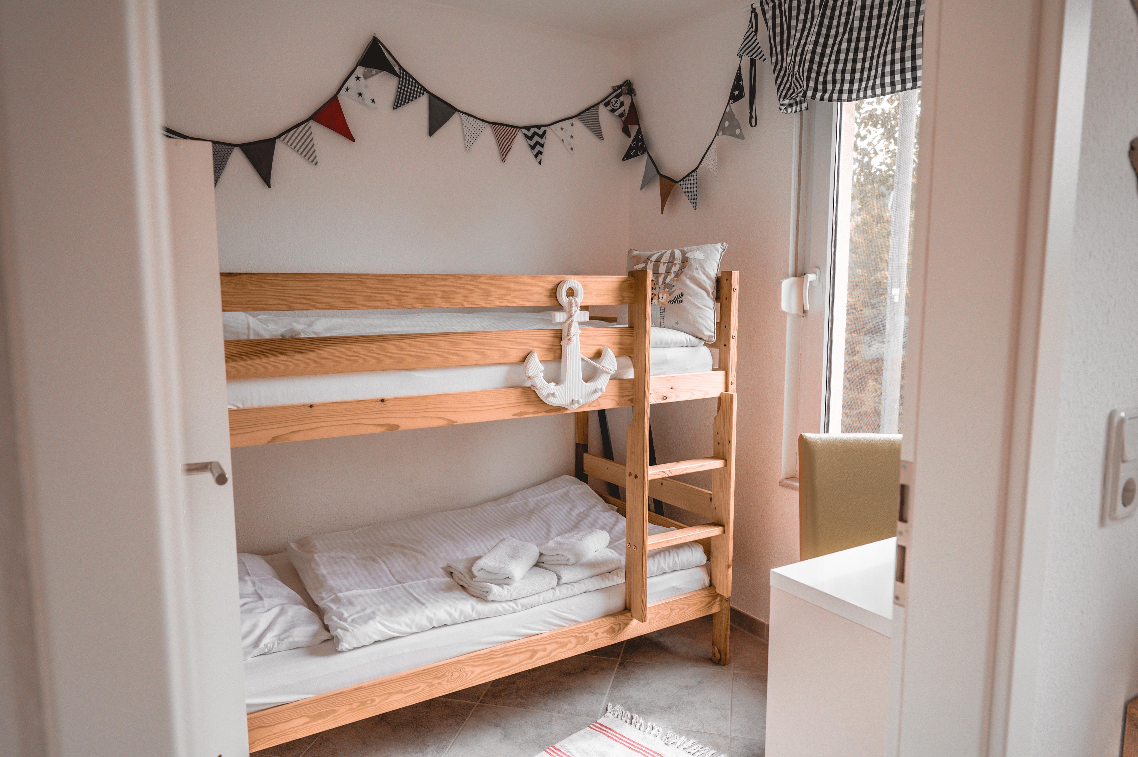 In Ihrem gemütlichen Wohnzimmer können Sie entspannen. Multimedial wartet im Wohnzimmer ein Flachbildfernseher auf Sie. Auch einige Gesellschaftsspiele dürfen im Bestand nicht fehlen. Im Schlafzimmer befindet sich ein Doppelbett. Ein Nachttisch, Leselampen und ein Kleiderschrank möchten hier von Ihnen genutzt werden. Das Kinderzimmer mit einem Etagenbett bietet Ihnen hier zwei weitere Schlafplätze. Der obere Raum, der mit zwei Einzelbetten ausgestattet ist, kann von Ihnen vielfältig genutzt werden. Alle Schlafräume sind mit Fliegengittern für Sie ausgestattet, damit Ihrer erholsamen Nachtruhe nichts im Wege steht. Auch eine Verdunklung ist in allen Schlafräumen möglich. Ein Babybett und ein Kinderhochstuhl sind für Sie kostenfrei verfügbar.