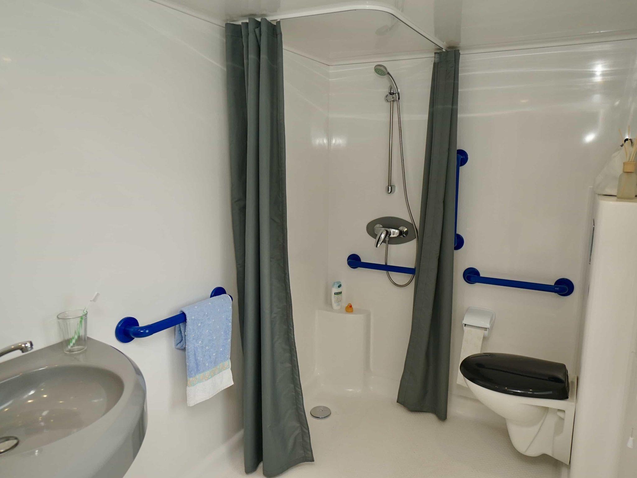 Das 30 qm große Mobilheim ist komplett barrierefrei und eignet sich für vier Personen. Die Unterkunft verfügt über zwei Schlafzimmer (Elternzimmer mit Doppelbett 160 x 200 cm und Kinderzimmer mit Einzelbett 90 x 190 cm und Hochbett 70 x 190 cm). Die Unterkunft bietet einen freundlich eingerichteten Wohnraum mit offener Küche, gemütlicher Sitzecke und TV-Gerät. Außerdem gibt es ein barrierefreies Badezimmer mit Dusche und WC. Im Außenbereich ist eine überdachte Terrasse mit Rollstuhl- Rampe und Gartenmöbeln.