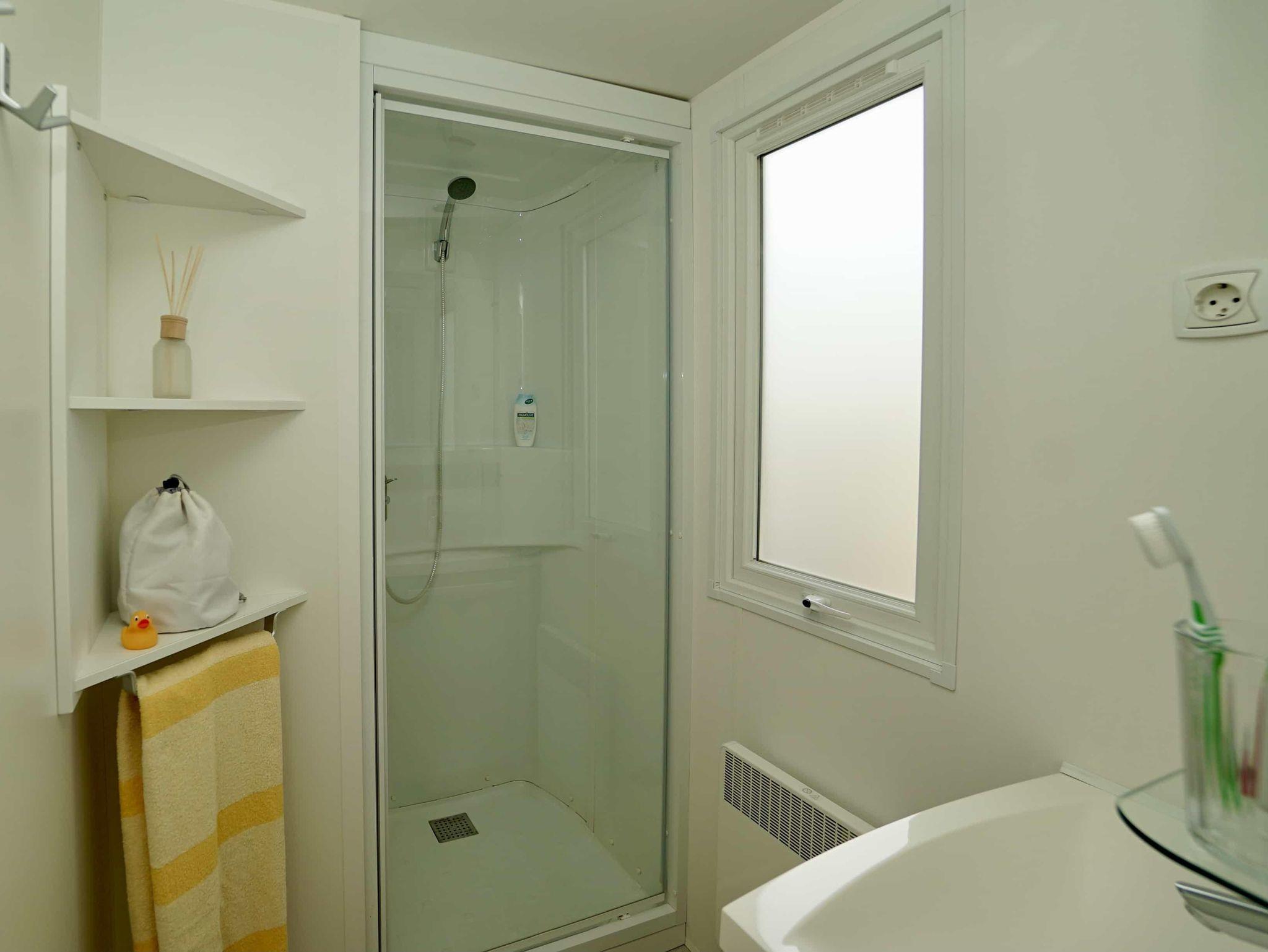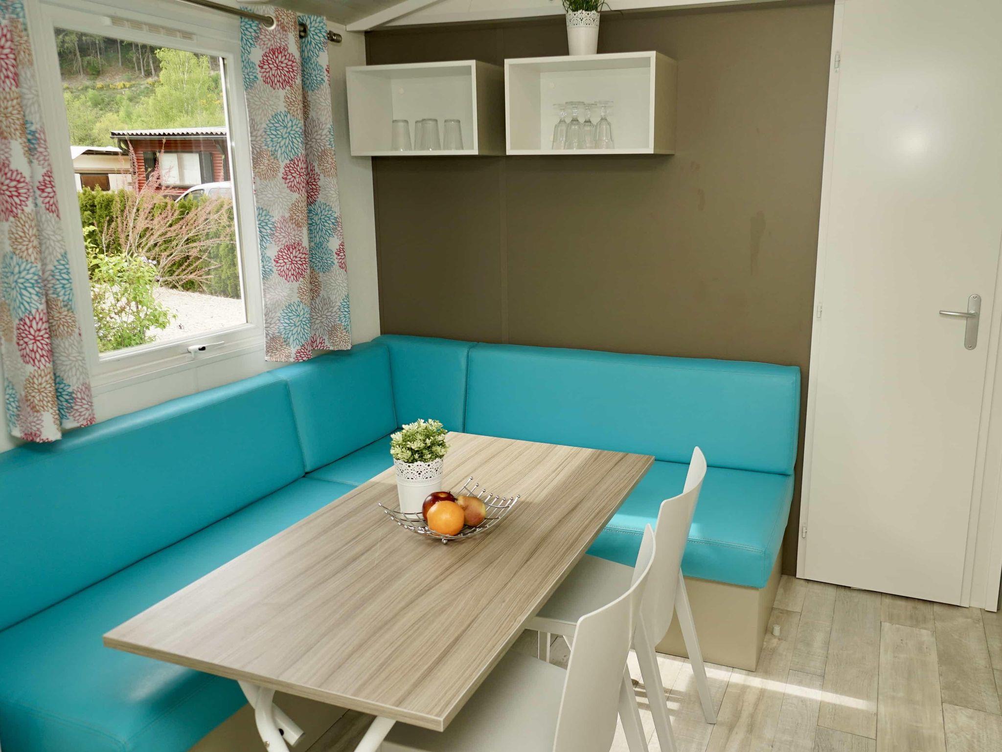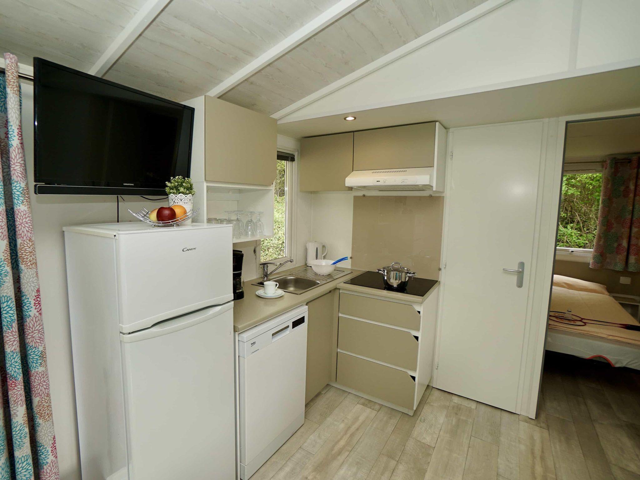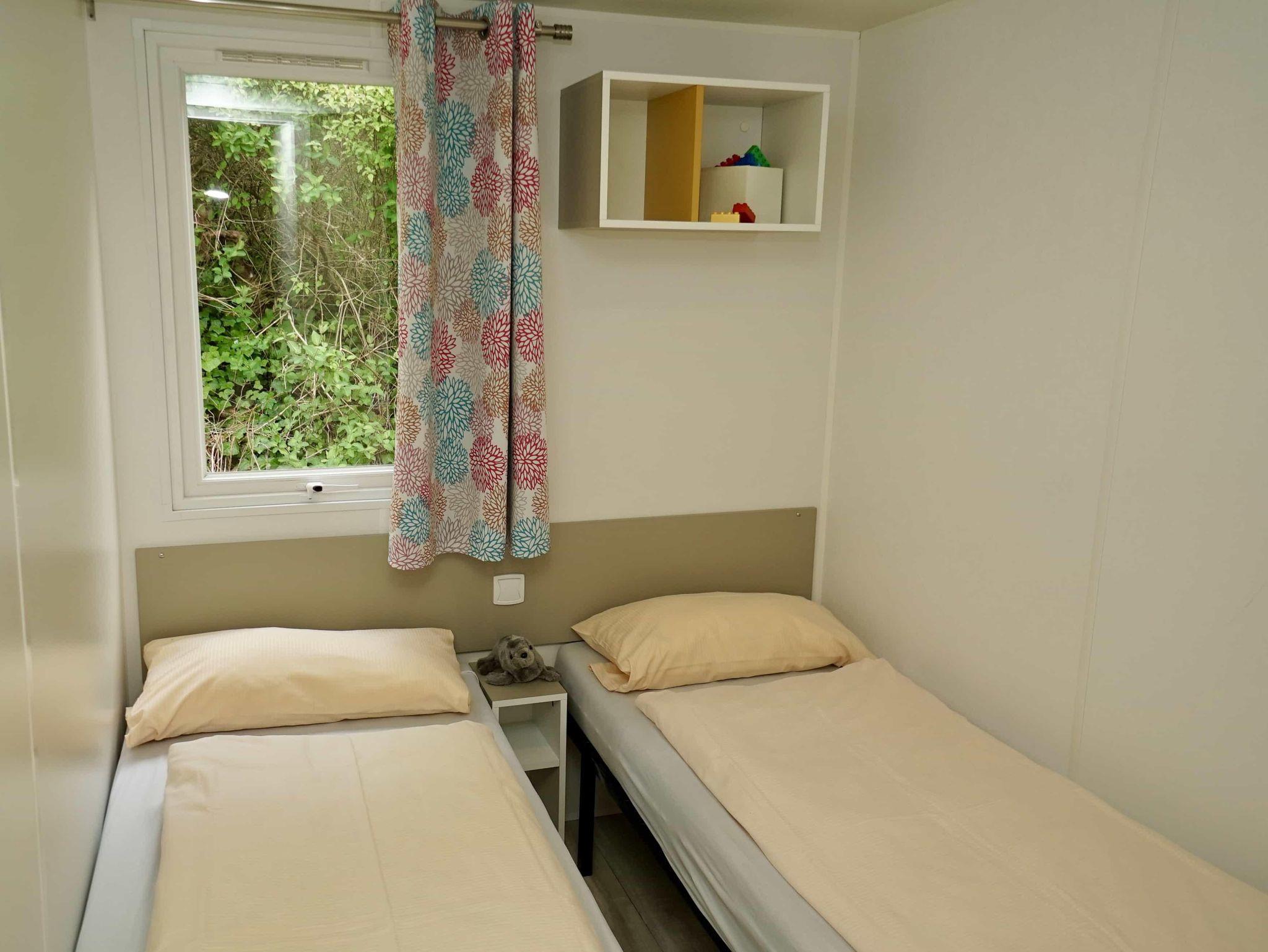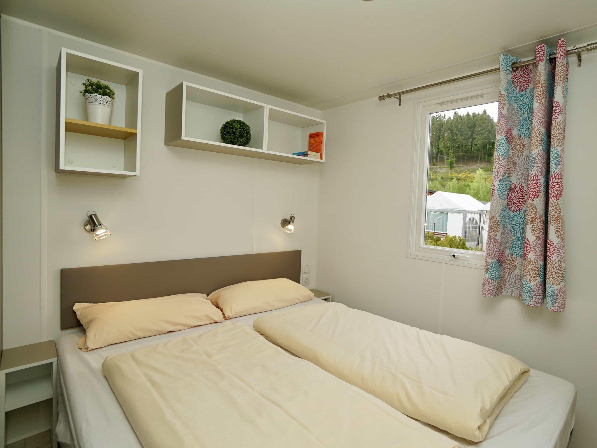 Das 28 qm große Mobilheim für sechs Personen verfügt über drei Schlafzimmer (Elternzimmer mit Doppelbett 160 x 200 cm und zwei Kinderzimmer mit Einzelbetten 80 x 190 cm). Die Unterkunft bietet einen freundlich eingerichteten Wohnraum mit gemütlicher Sitzecke und TV-Gerät. Im Wohnbereich befindet sich die voll ausgestattete Küche. Außerdem gibt es ein Badezimmer mit Dusche und ein separates WC. Im Außenbereich ist eine überdachte Terrasse mit Gartenmöbeln.