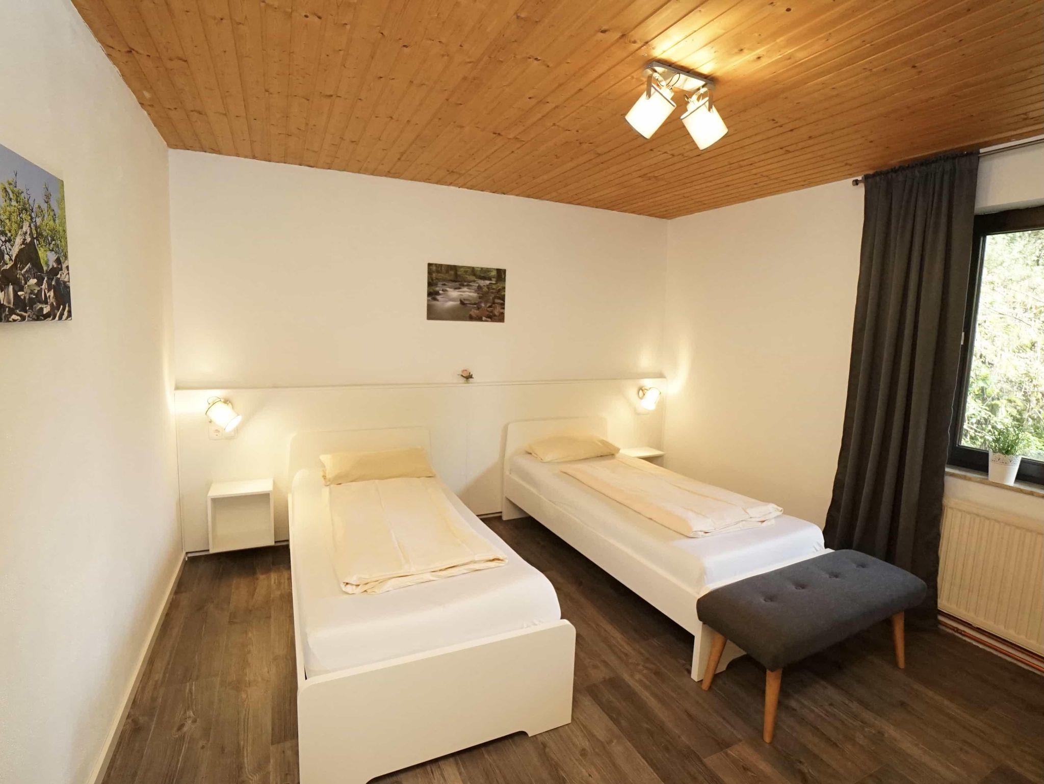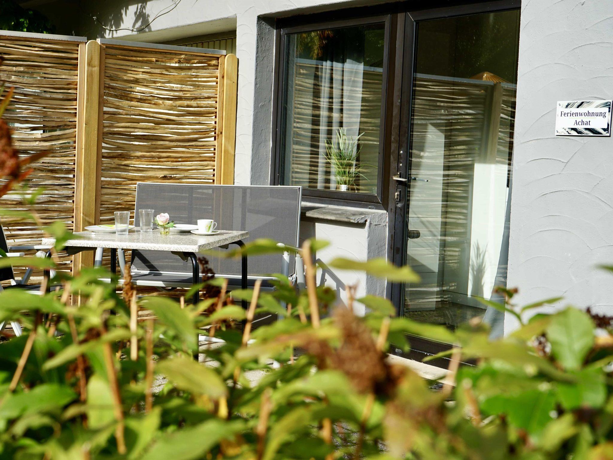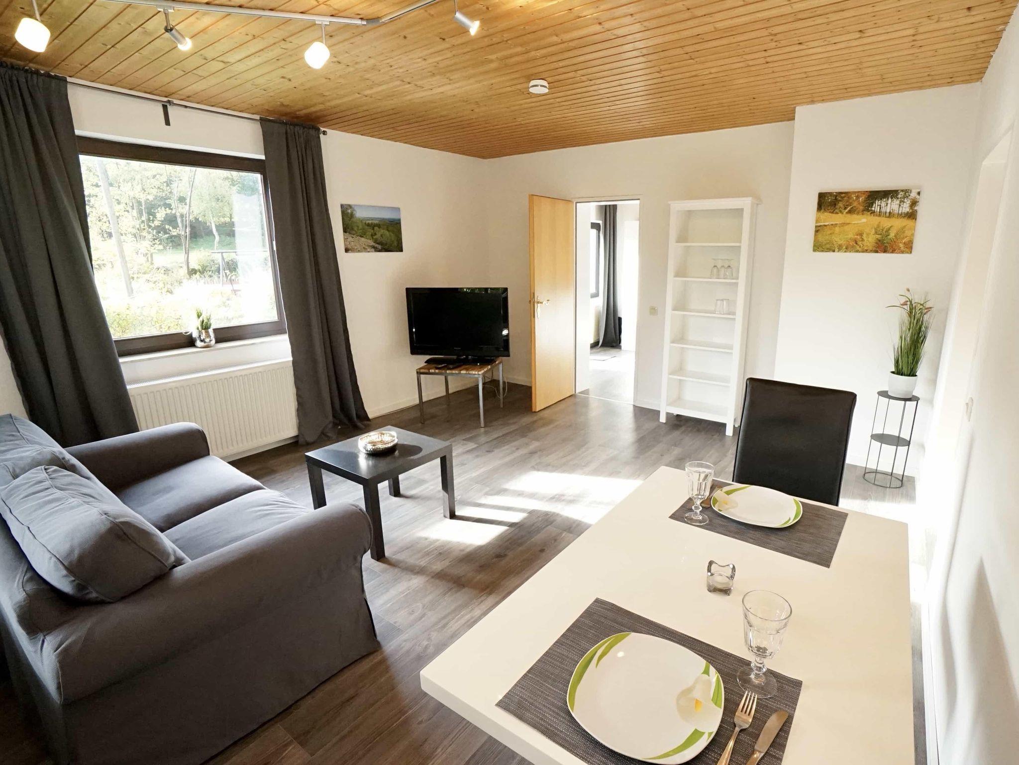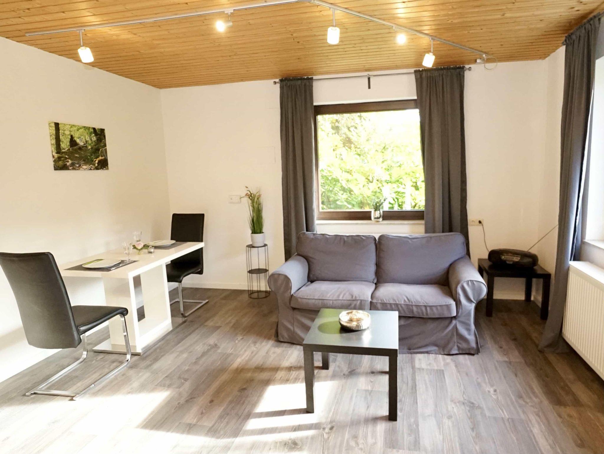 Die 50 qm große Ferienwohnung für zwei Personen verfügt über ein Schlafzimmer mit zwei Einzelbetten 90 x 200 cm. Die Unterkunft bietet einen freundlich eingerichteten Wohnraum mit gemütlicher Couch, Esstisch und TV-Gerät. Im Eingangsbereich befindet sich die voll ausgestattete Küche mit Kühlschrank, Induktionsherd und Backofen. Außerdem gibt es ein Badezimmer mit Dusche und WC. Im Außenbereich Terrasse mit Sonnen-Markise und Gartenmöbeln.