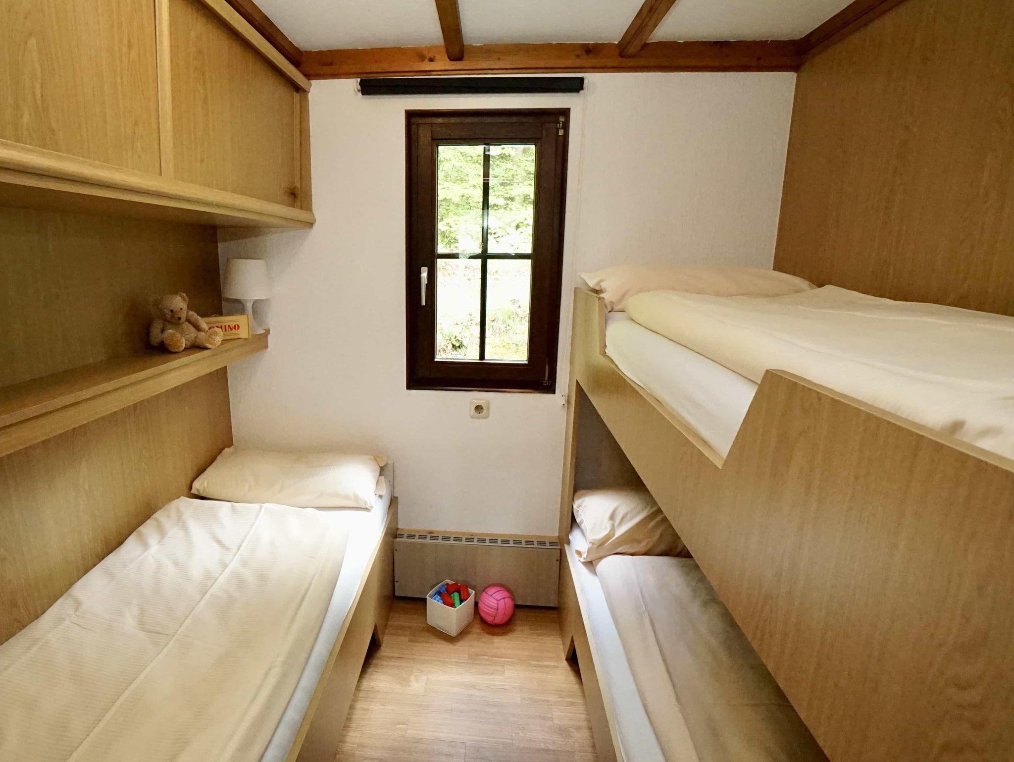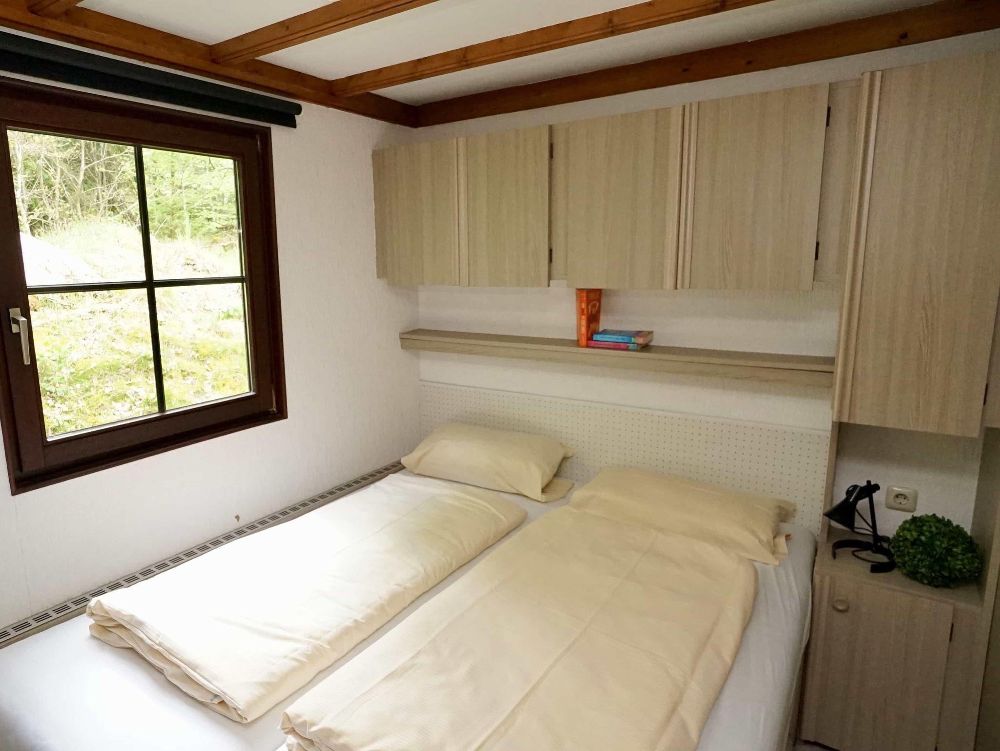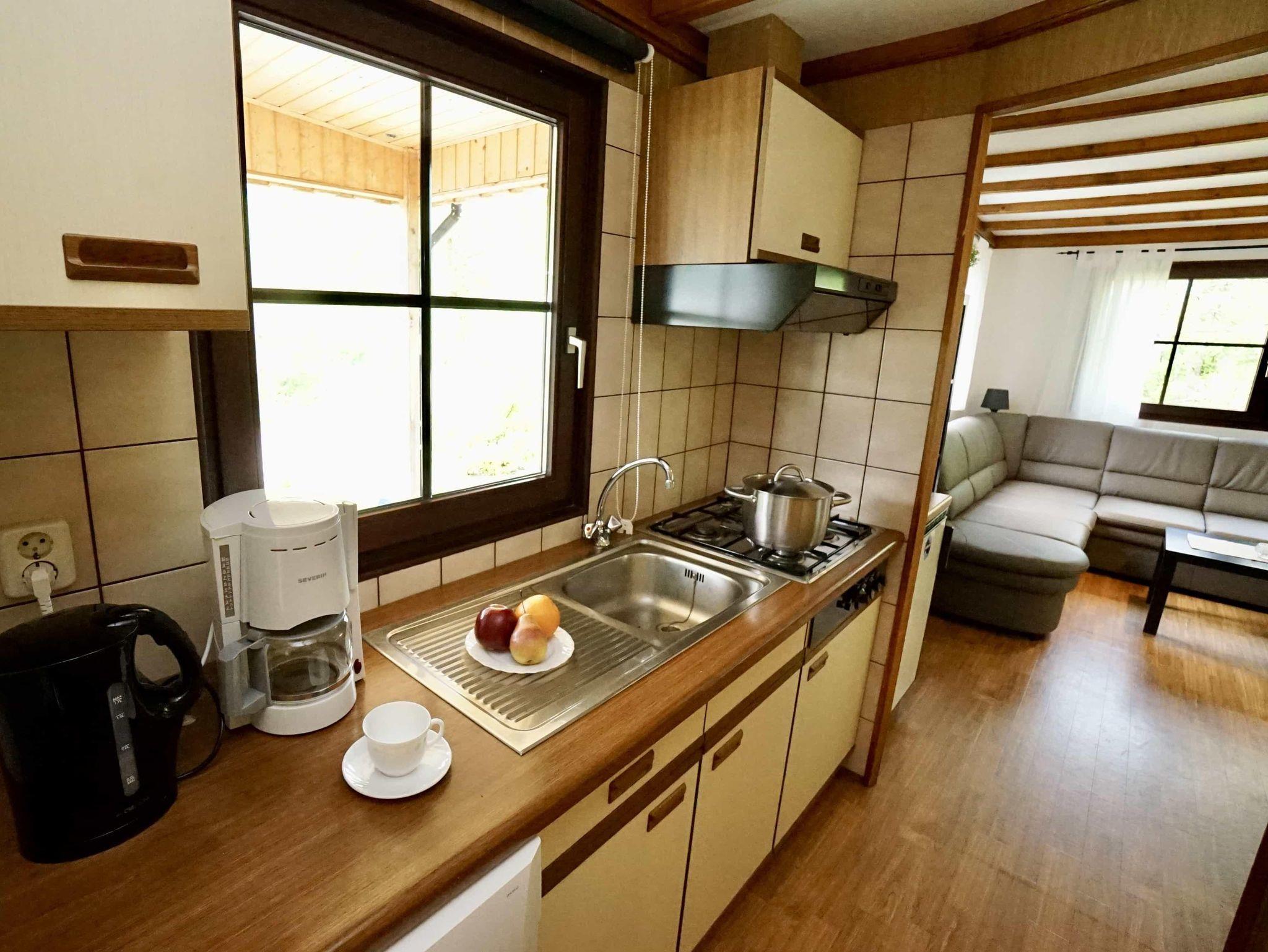 Das 33 qm große Chalet für fünf Personen verfügt über zwei Schlafzimmer (Elternzimmer mit Doppelbett 160 x 200 cm und Kinderzimmer mit Etagenbett 70 x 190 cm und Einzelbett 70 x 190 cm). Die Unterkunft bietet einen freundlich eingerichteten Wohnraum mit gemütlicher Couch, Esstisch und TV- Gerät. Im Flur befindet sich die voll ausgestattete Küche. Außerdem gibt es ein Badezimmer mit Dusche und WC. Im Außenbereich ist eine überdachte Terrasse mit Gartenmöbeln.