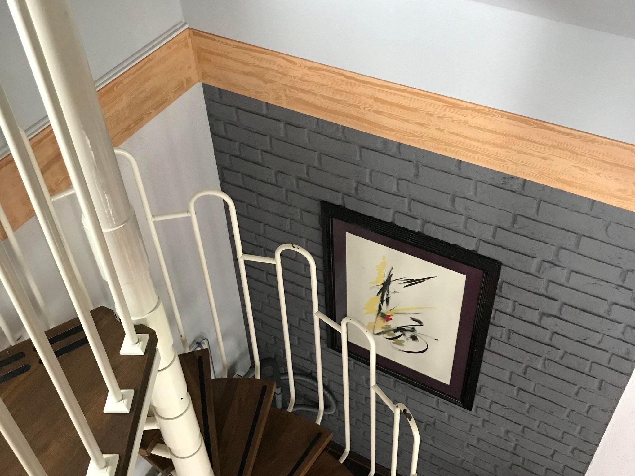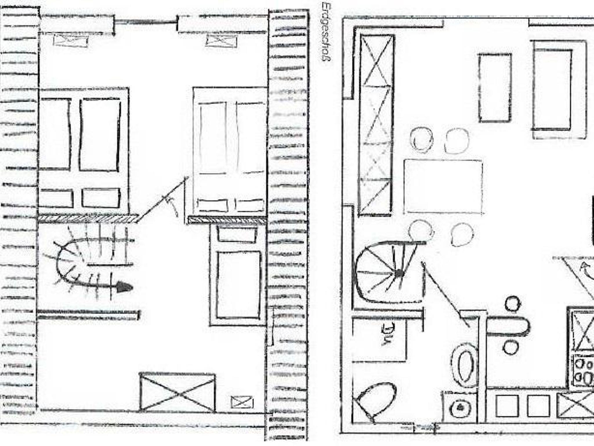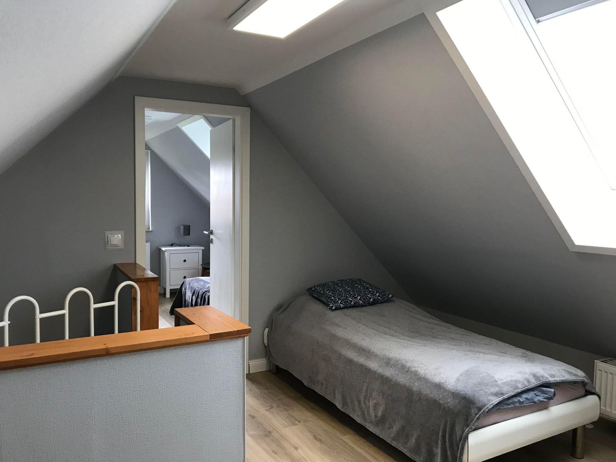 Ferienhaus auf zwei Ebenen. Schlafbereich oben über Wendeltreppe erreichbar: zwei Betten á 140 cm im Schlafzimmer und ein Bett im nach unten offenen Flur.