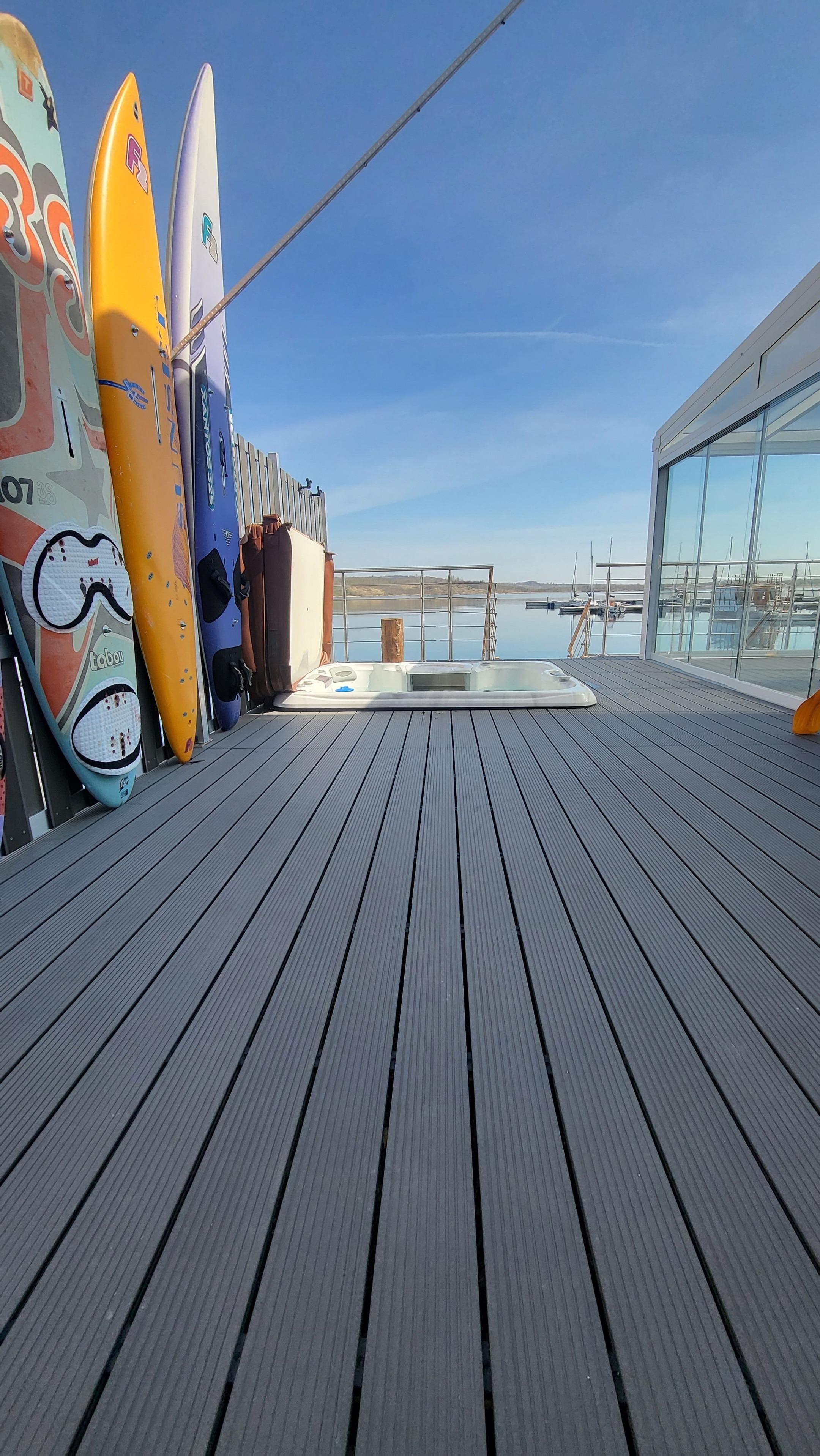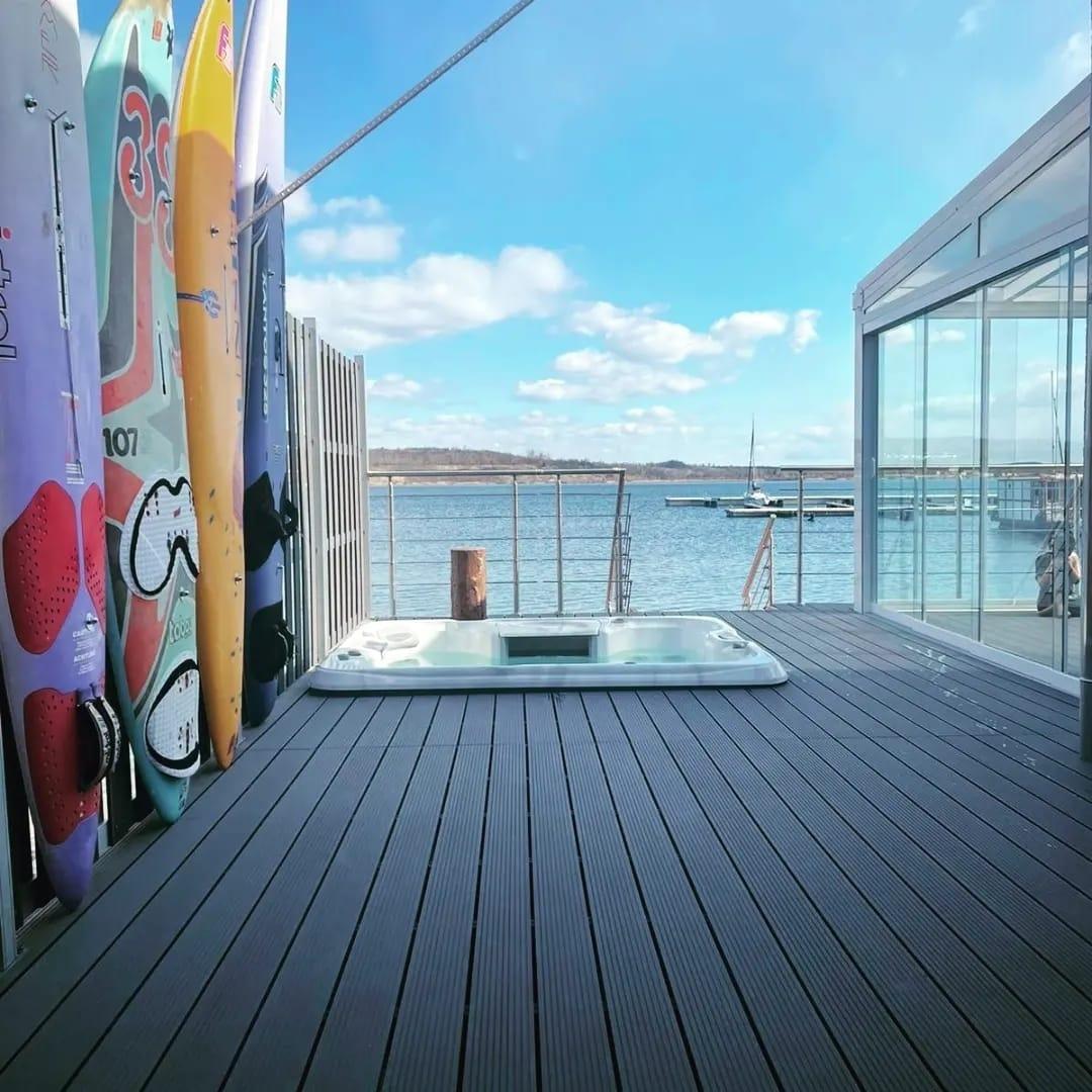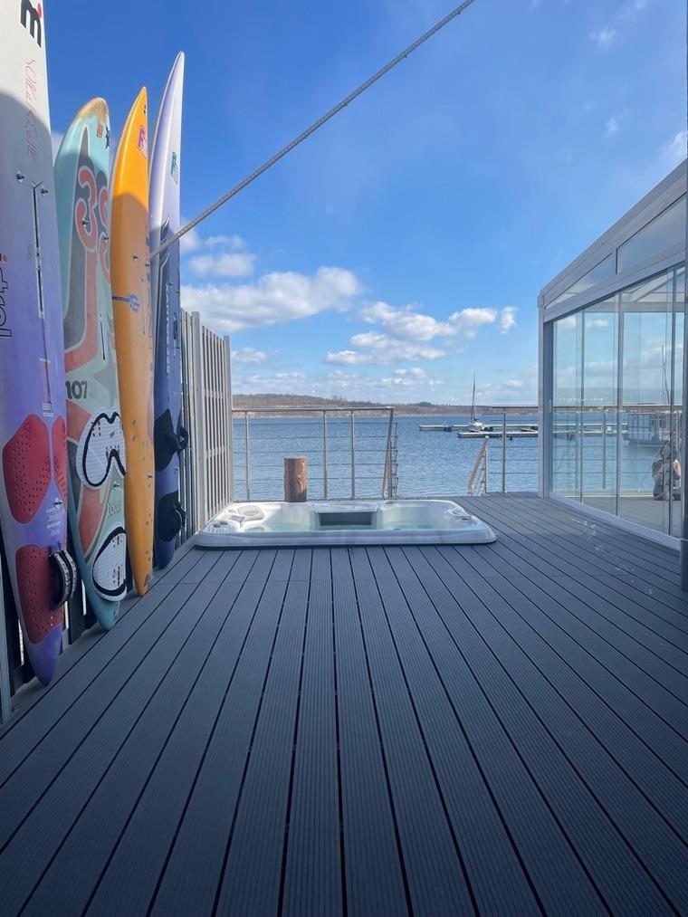 Auf einer Wohlfühlfläche von über 90 qm² genießen Sie einen großzügigen Wohn- und Essbereich mit offener Küche, drei klimatisierte Schlafzimmer und 2 stilvoll eingerichtete Bäder. Das gesamte Ferienhaus ist gemütlich und geschmackvoll eingerichtet und bietet Ihnen bis hin zum Saunahaus mit eigener Dusche und WC eine angenehm, wohlige Fußbodenheizung. Aus diesem heraus genießen Sie einen tollen, ungestörten Blick auf den See und auch im davor eingelassenen Whirlpool können Sie „fünf gerade sein“ und die Seele baumeln lassen. Die beiden, über den Wohn- und Essbereich zugänglichen Terrassen sind nach Osten ausgerichtet und bieten mit über 70 qm² ausreichend Platz, um dort gemütlich und entspannt zu frühstücken, sich zu sonnen, zu lesen; eben alles, wonach Ihnen der Sinn steht.