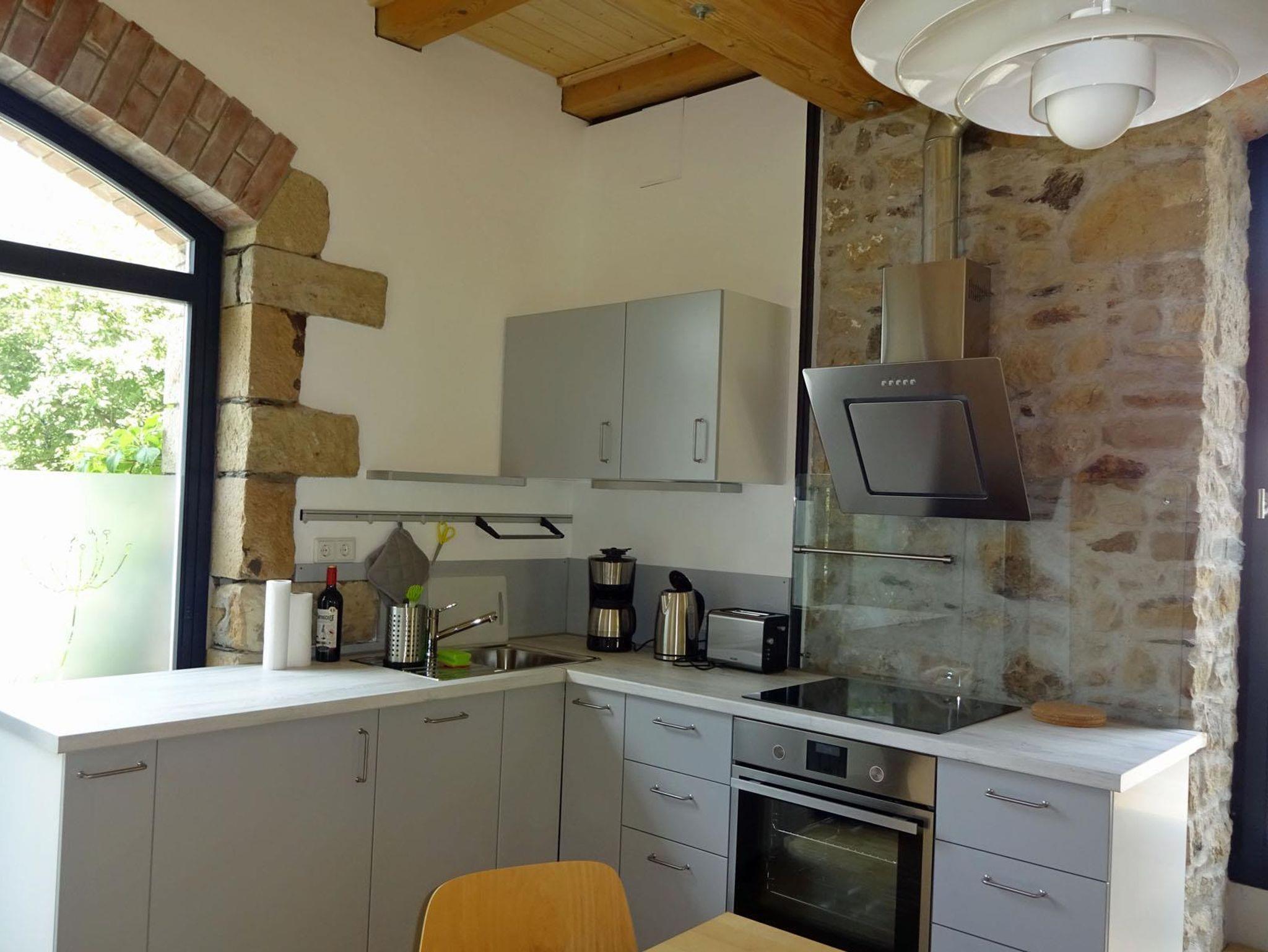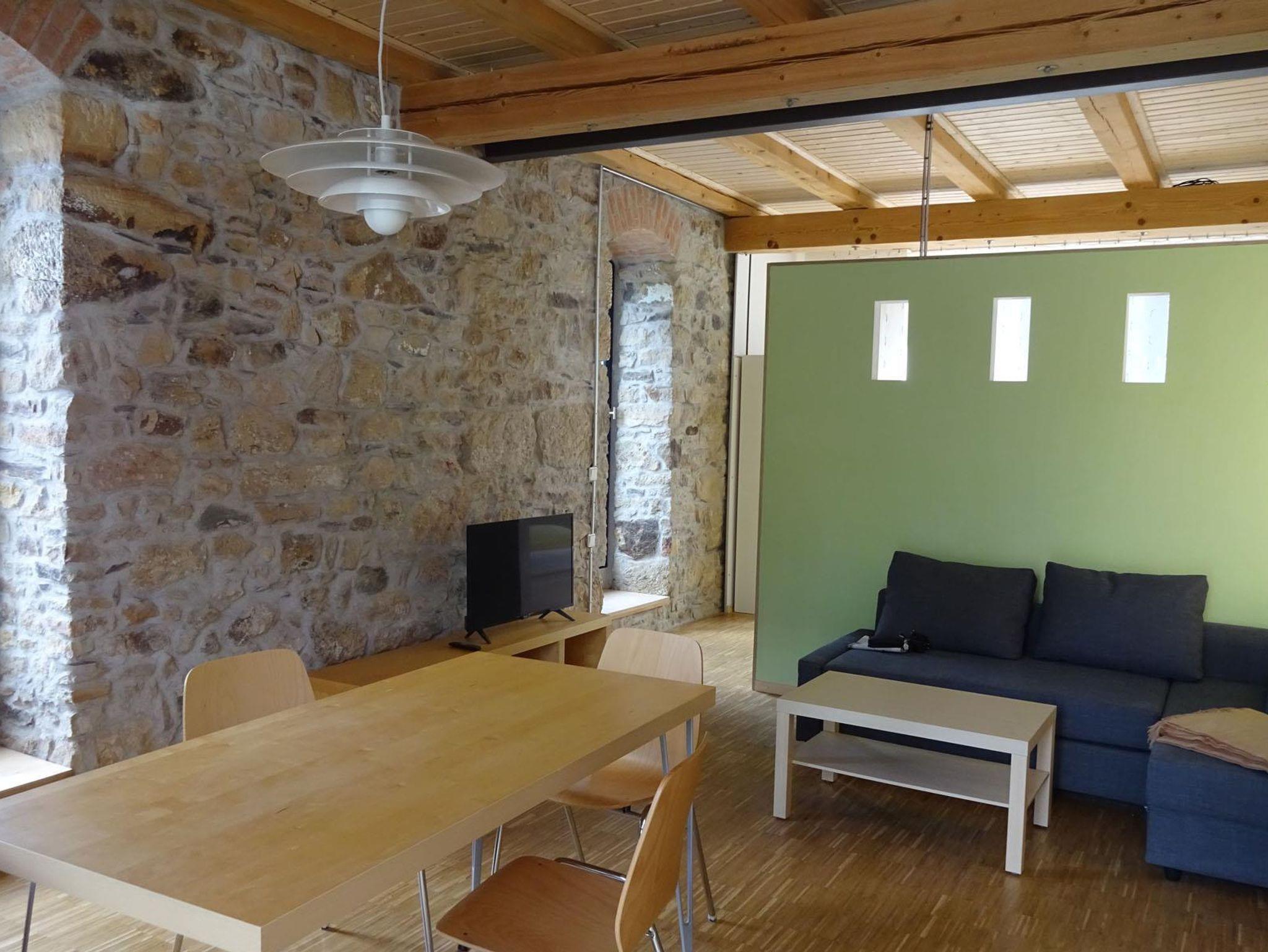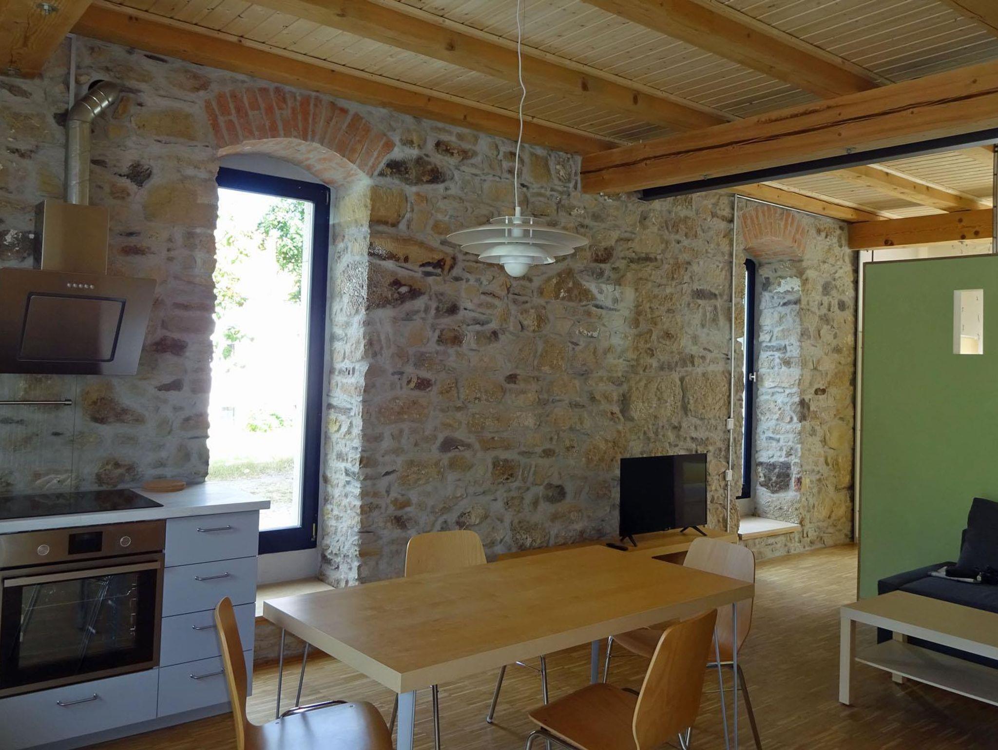 Die Ferienwohnung befindet sich in einem ehemaligen Schafstall. Alte Bauelemente, wie die gesetzten Sandsteinwände, die alten Balken und neue Details, wie die durchbrochene Trennwand zwischen Schlaf- und Wohnbereich verbinden sich hier zu einer Einheit. Die Wohnung ist neu und modern mit TV und Radio ausgestattet und Rollstuhl gerecht eingerichtet. Das Bad ist großzügig mit befahrbarer Dusche, einem Waschbecken, dass sich absenken lässt und Haltegriffen an der Toilette, die sich auch entfernen lassen. Die Küche besteht aus einer komfortablen Einbauküche mit kompletter Küchenausstattung und Spülmaschine. Zwei große Fenster am Giebel geben den Blick frei auf eine kleine Terrasse mit Gartenmöbeln und auf den Garten. Sie gehen nach Osten. Im Schlafbereich ist ein Doppelbett (180x200cm). Dort kann eine Aufbettung dazu gestellt werden oder ein Babybett. Oder Erwachsene und größere Kinder können im Wohnbereich auf der Schlafcouch (140x200 cm) schlafen. Das große Fenster im Schlafraum geht nach Süden und in den Garten.