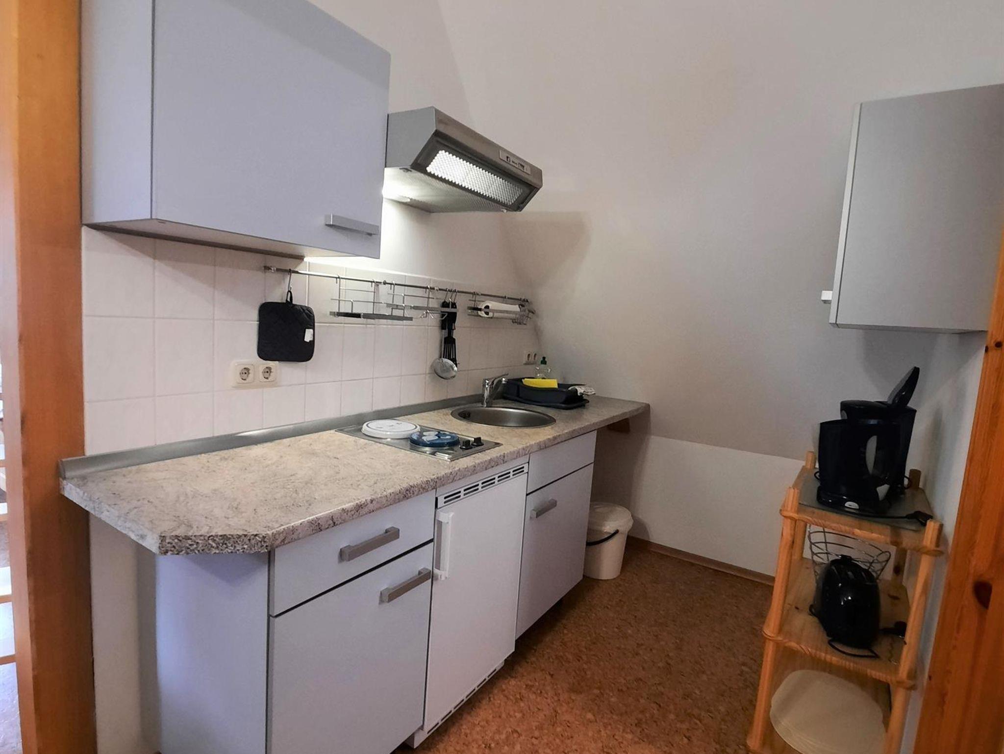 Die 40 m² große Wohnung befindet sich im Nebenhaus (Angerschänke). Sie verfügt über einen Wohn-/ Schlafraum mit Doppelbett, eine komplett ausgestattete Küche, Dusche/ WC. Vom Wohnraum aus gelangt man über eine Treppe auf den Schlafboden, wo nochmals zwei weitere Betten (Aufbettung auf Anfrage) zur Verfügung stehen.