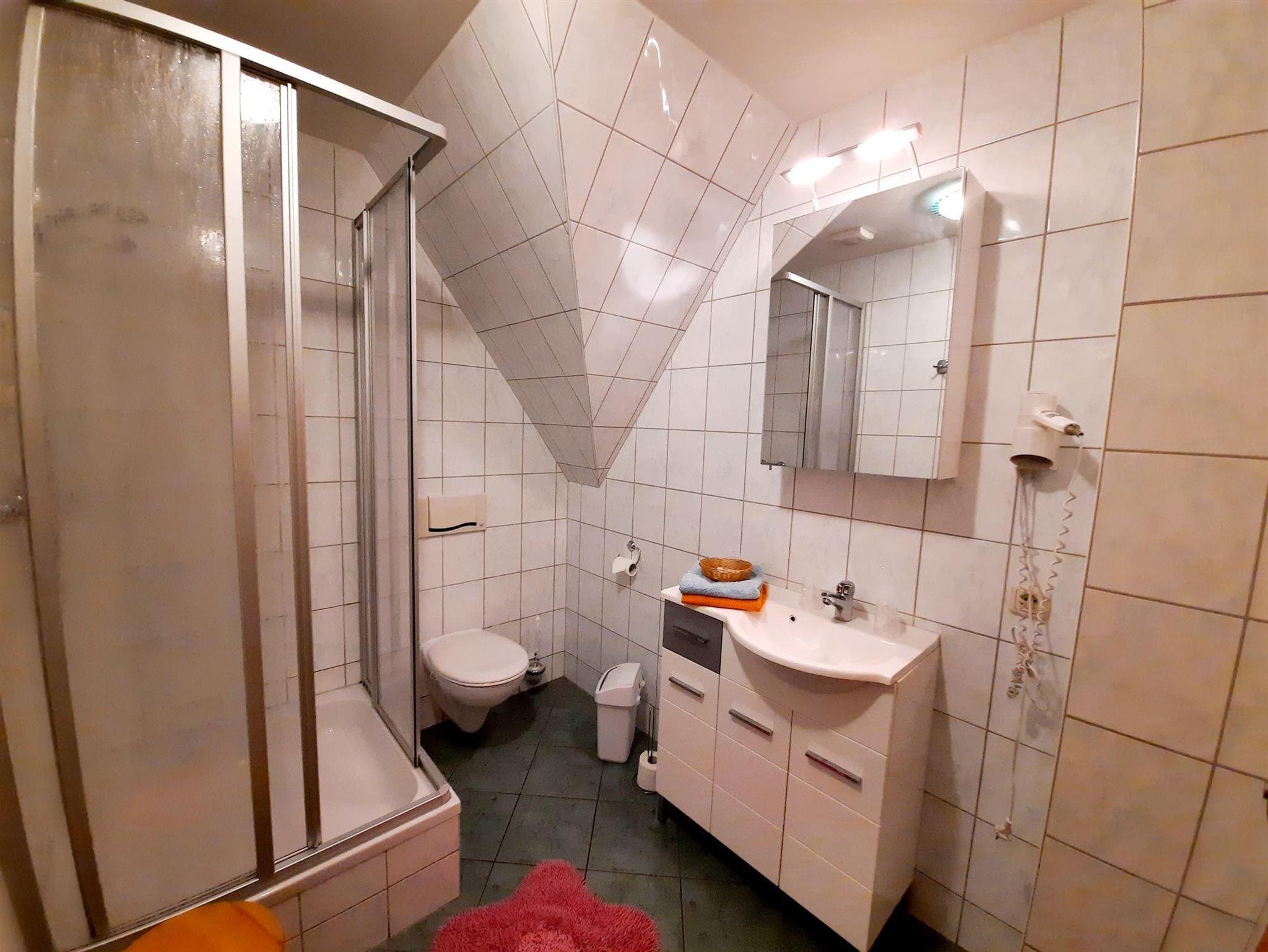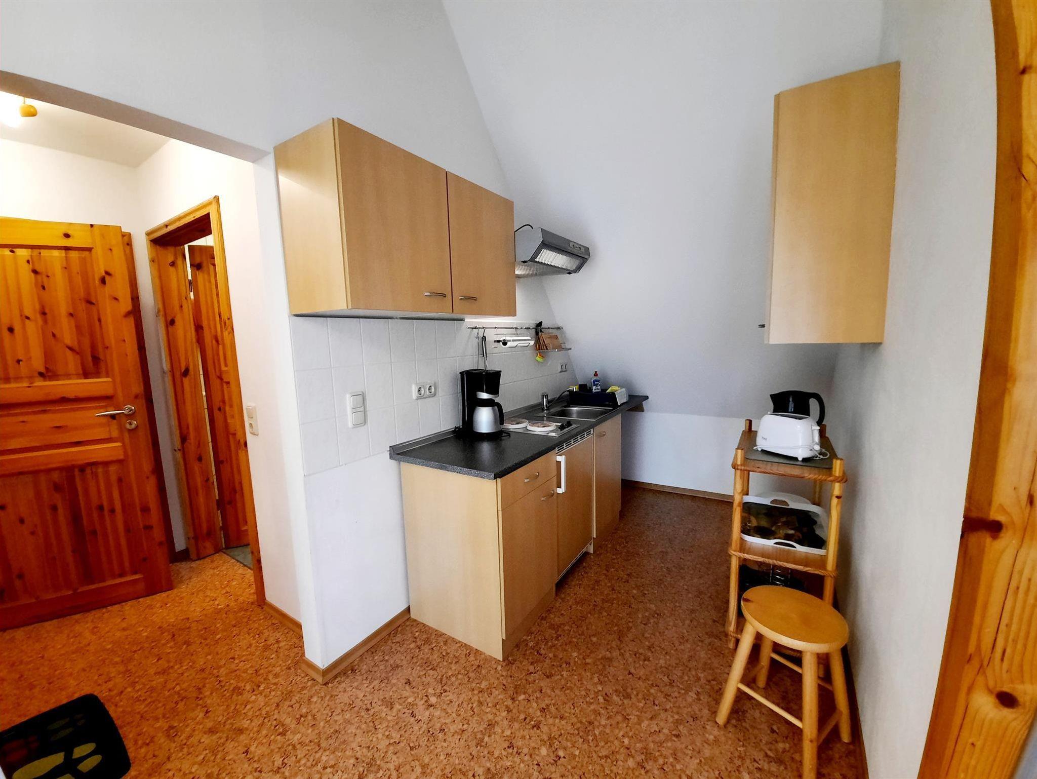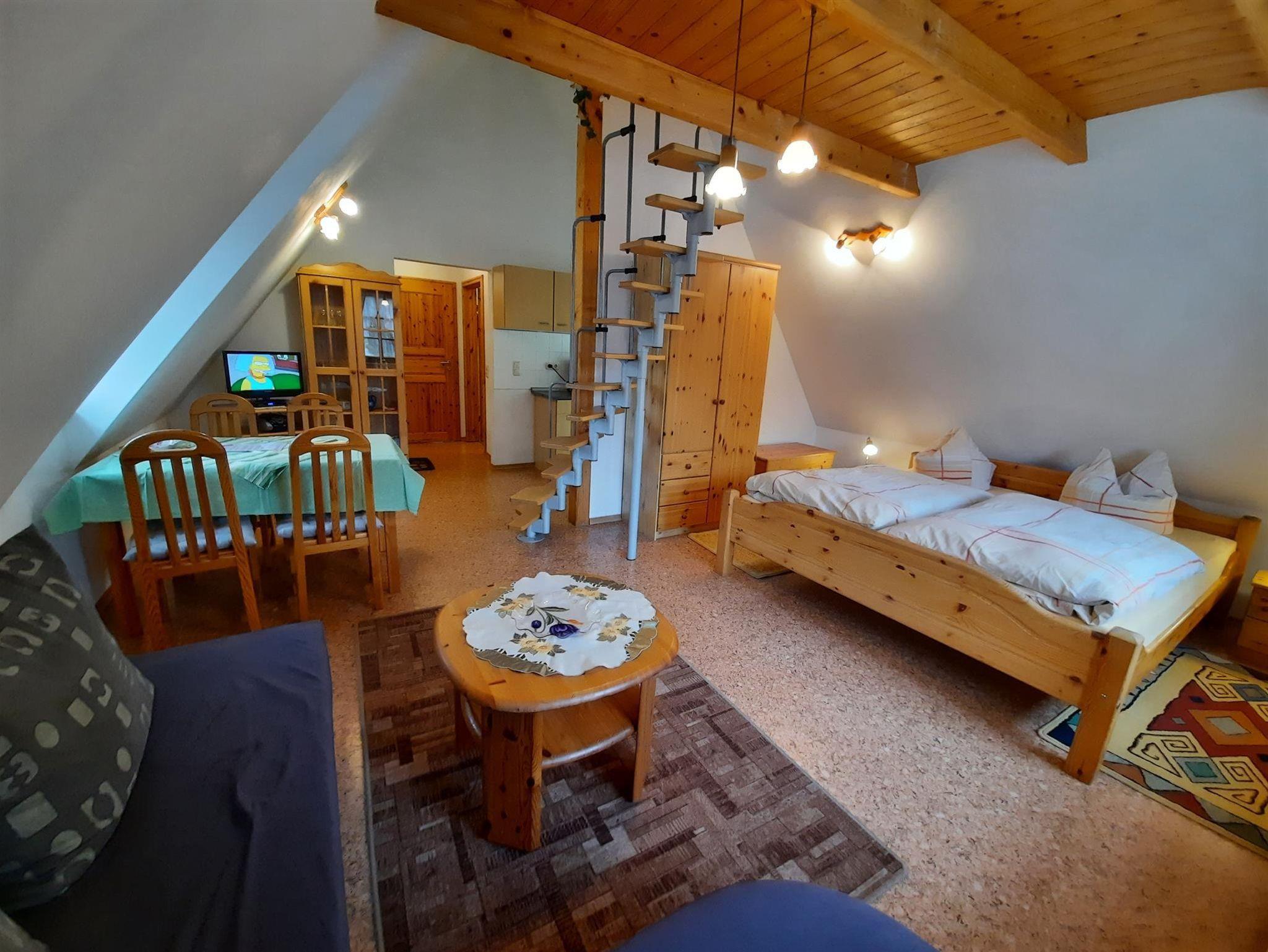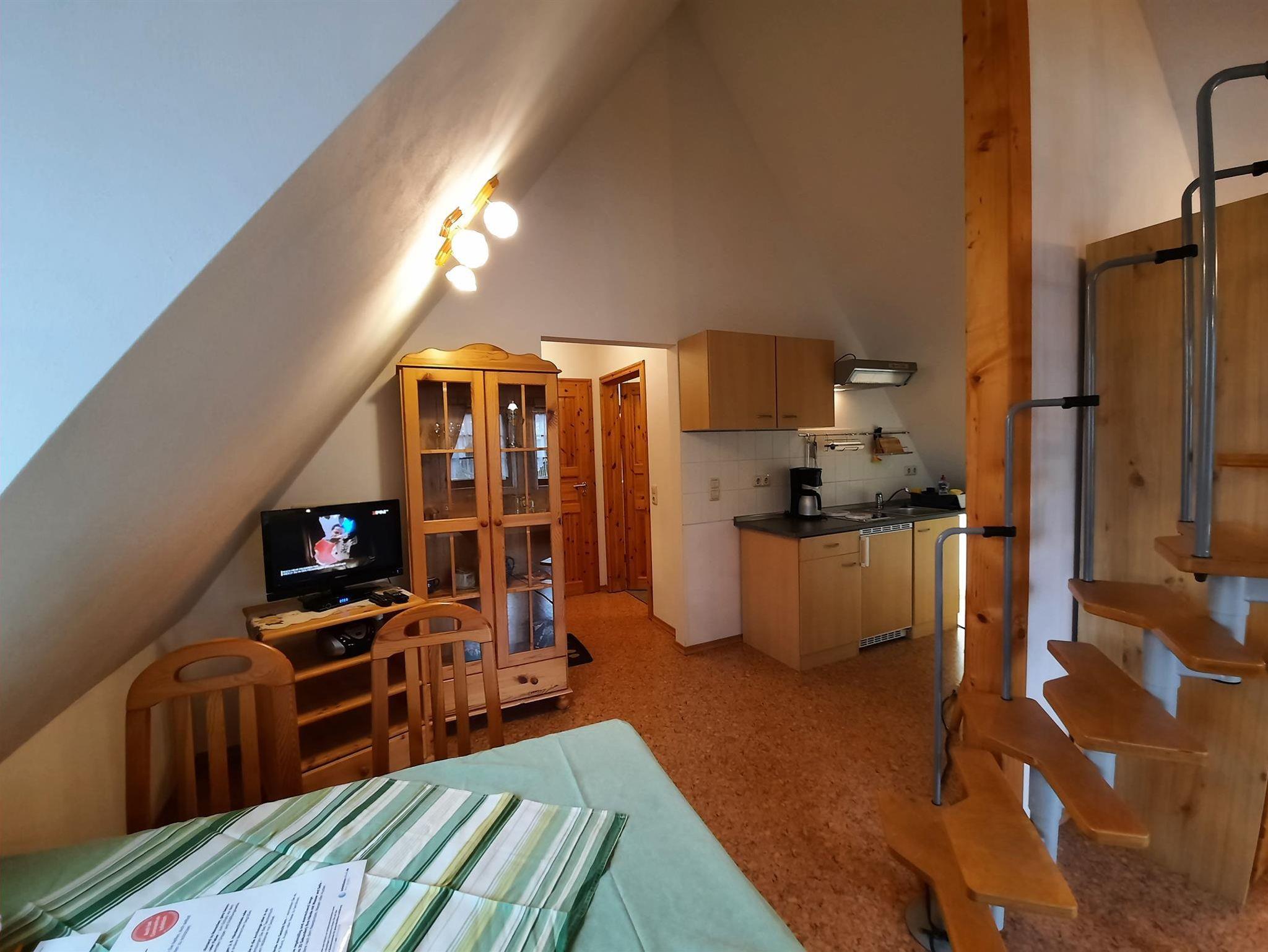 Die 45 m² große Wohnung befindet sich im Nebenhaus (Angerschänke). Sie verfügt über einen Wohn-/ Schlafraum mit Doppelbett, eine komplett ausgestattete Küche, Dusche/ WC. Vom Wohnraum aus gelangt man über eine Treppe auf den Schlafboden, wo nochmals zwei weitere Betten (Aufbettung) zur Verfügung stehen.