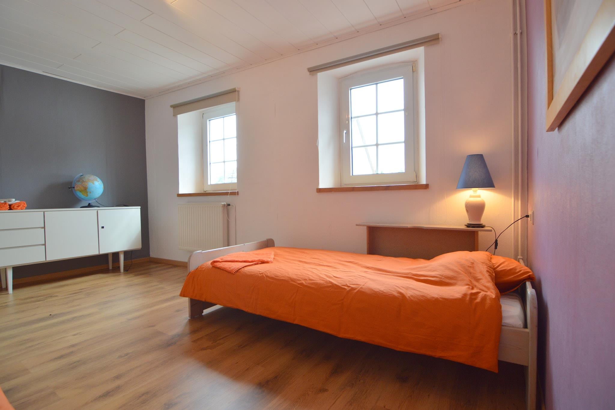 Dette rummelige feriehus i Mürlenbach tilbyder en charmerende blanding af arv og komfort for familier og venner. Beliggende i det restaurerede Veltenhaus fra 1850, ligger det ved foden af fæstningen Bertradaburg, gennemsyret af karolingisk legende og middelalderlig arkitektur. Boligen har et hyggeligt spisekøkken med brændeovn, et stort soveværelse i stueetagen, tre soveværelser ovenpå og to badeværelser - perfekt til gruppeophold. En generøs have og parkeringsplads på tværs af gaden bidrager til dens praktiske funktion. Omgivet af det naturskønne Gerolsteiner Land, kan gæsterne nyde skovvandringer, mountainbike og besøge nærliggende slotte som Manderscheid og Daun. Naturelskere vil sætte pris på højdepunkter, såsom Gerolsteiner Dolomitterne og Nerother Kopf, mens Kyll-floden byder på fredelige fiskesteder og kajaksejlads. Til spisning omfatter lokale favoritter Tiemo Wolff i Kopp for regionale specialiteter, Balkan Grill i Gerolstein til middelhavsretter og Pizzeria Costa Verde for italienske klassikere nær Löwenburg-ruinerne. Uanset om du udforsker vulkanske søer eller slapper af ved bålet, er Veltenhaus en mindeværdig base i hjertet af Eifel.