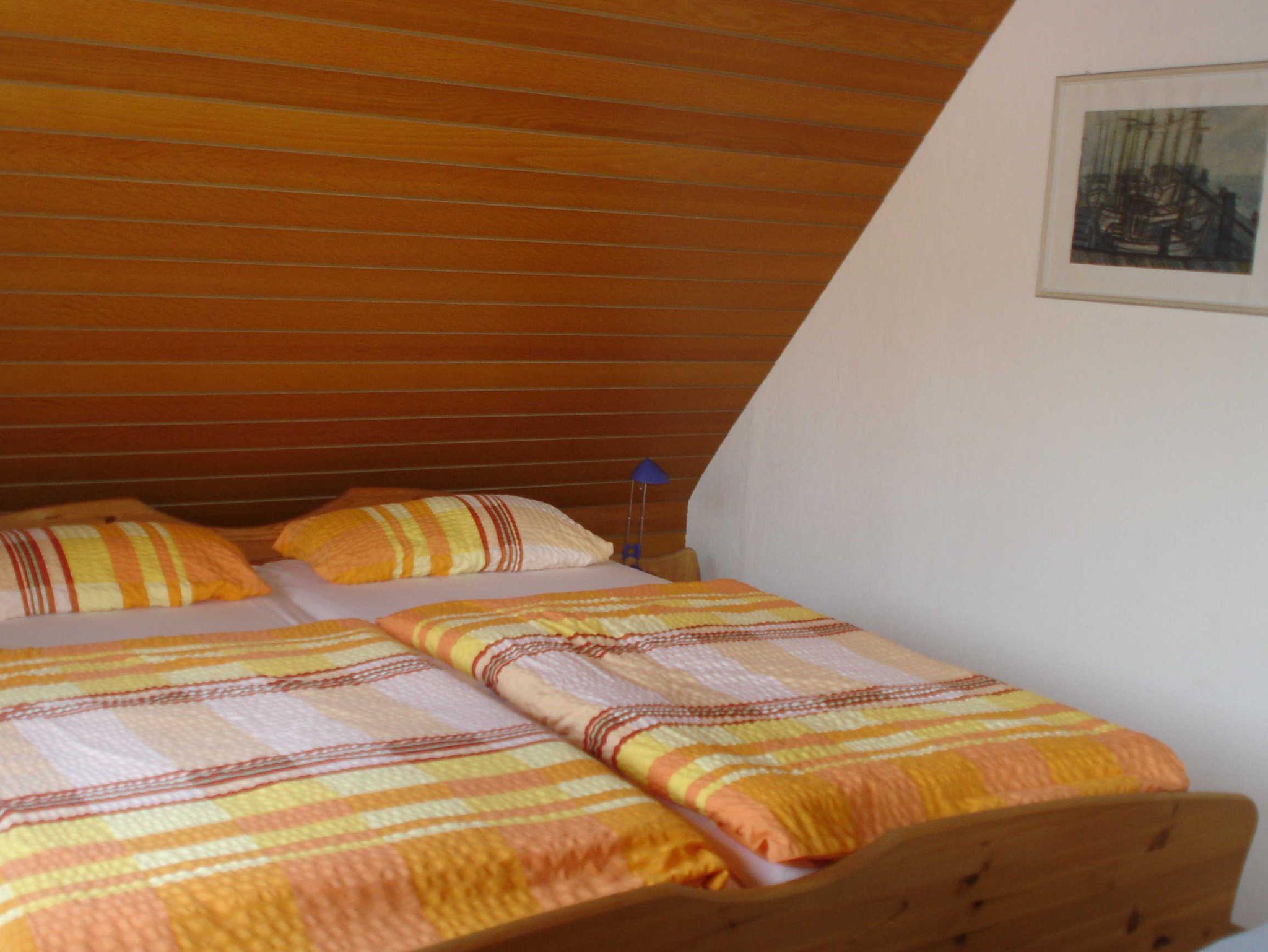 Die Treppe die zur Ferienwohnung führt ist mit Teppichwahre ausgelegt. Im Schlafraum befindet sich ein großes Doppelbett mit 2 geteilten Matratzen 0,90 x 2,00 Meter.