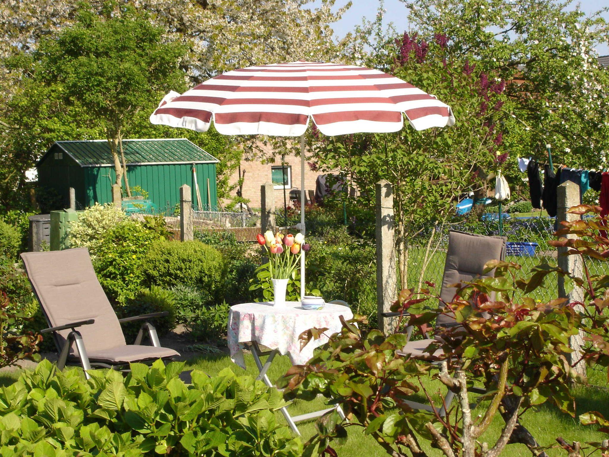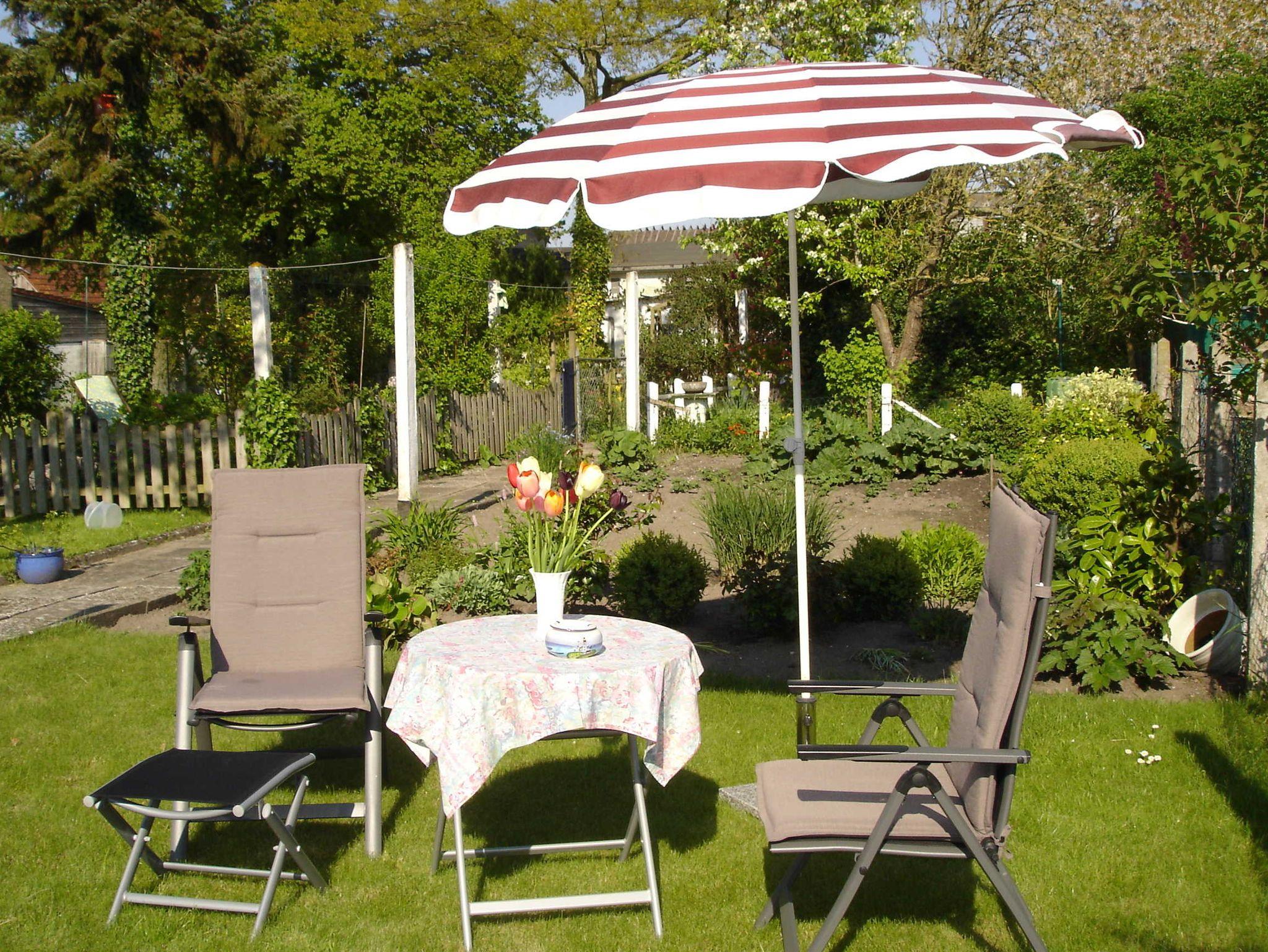 Balkon oder Terrasse ist nicht vorhanden. Eine Rasenfläche im Garten ist mit Tisch und Stühlen sowie einem Sonnenschirm zum Verweilen bereitgestellt.