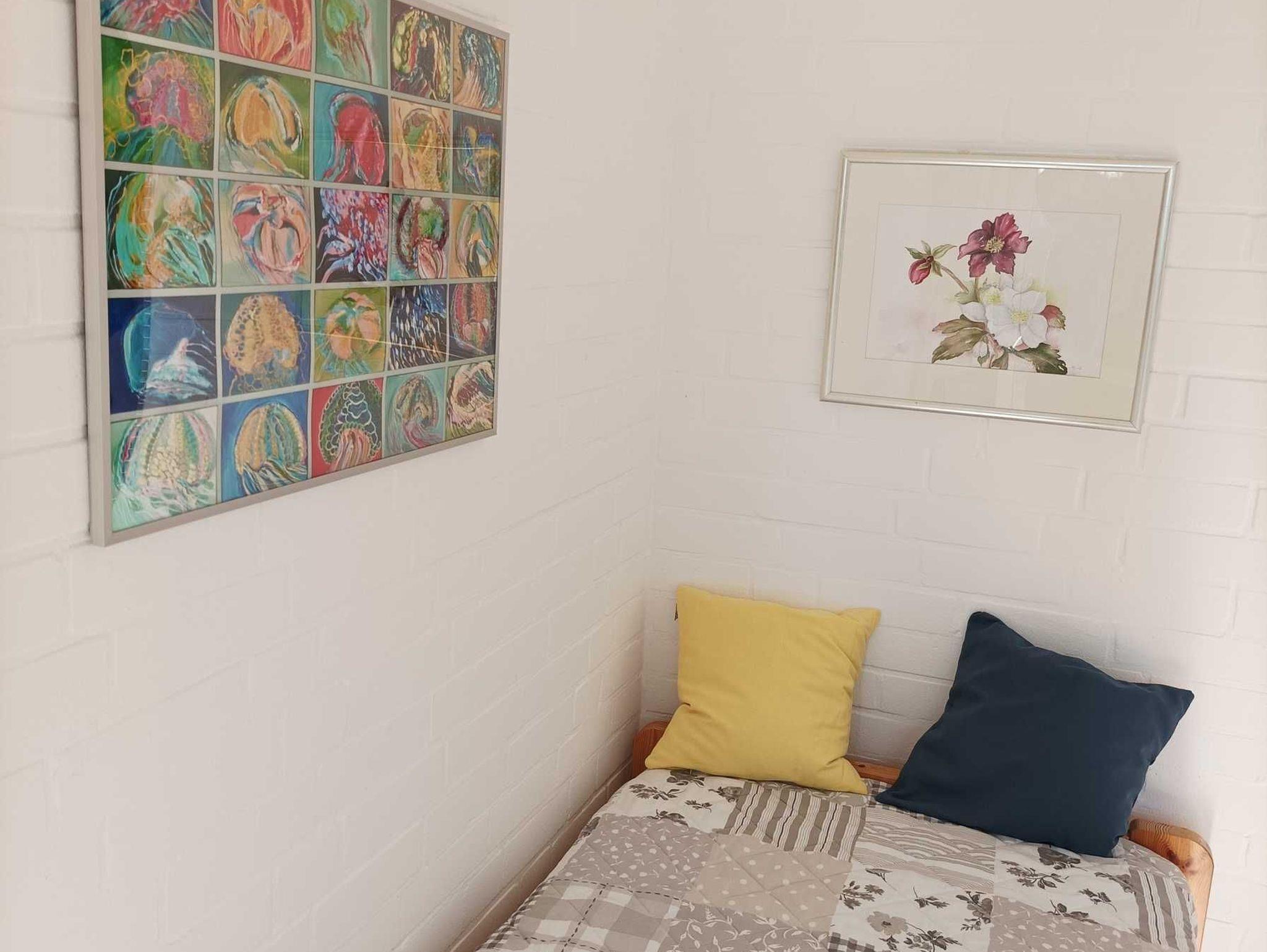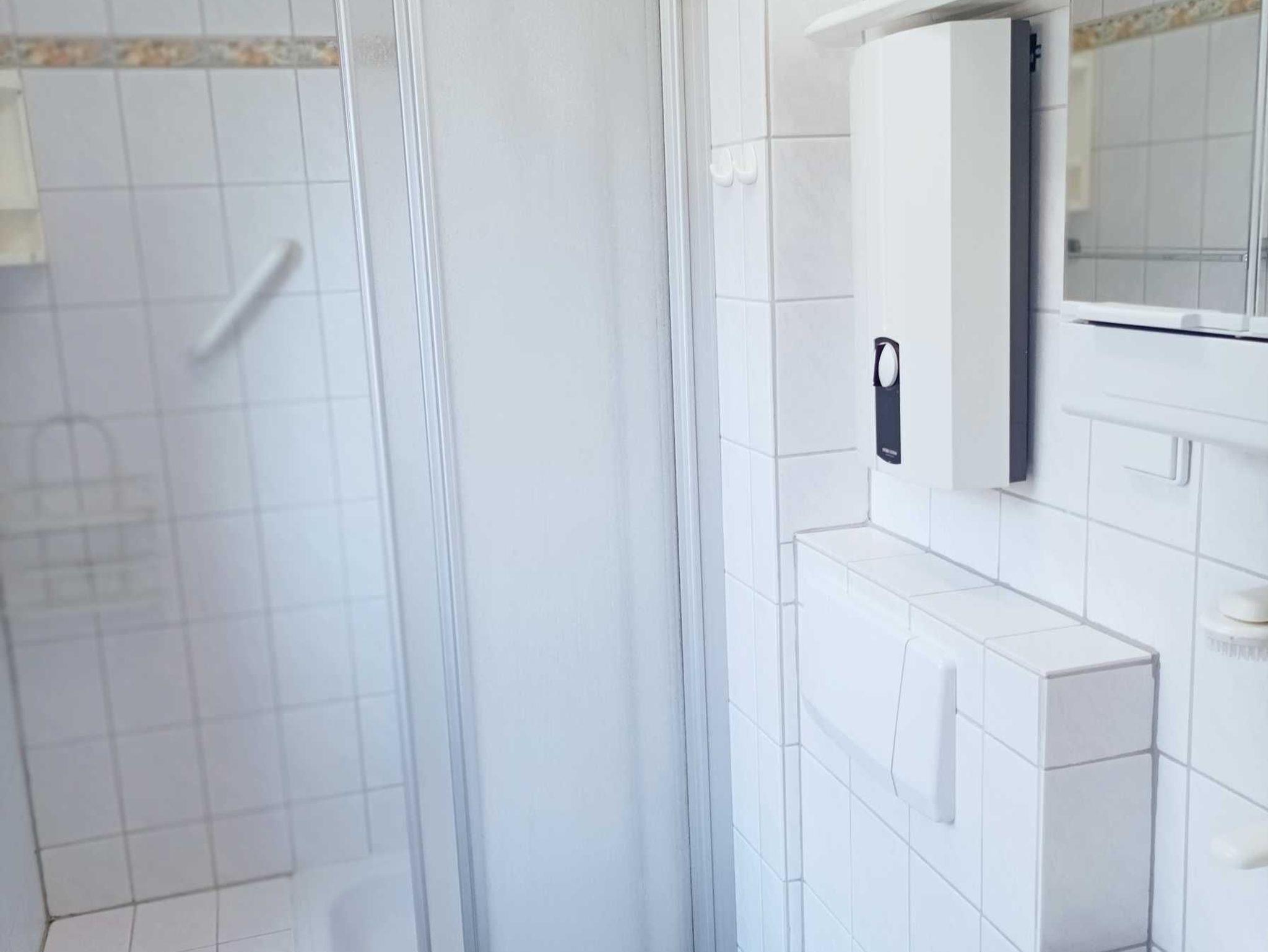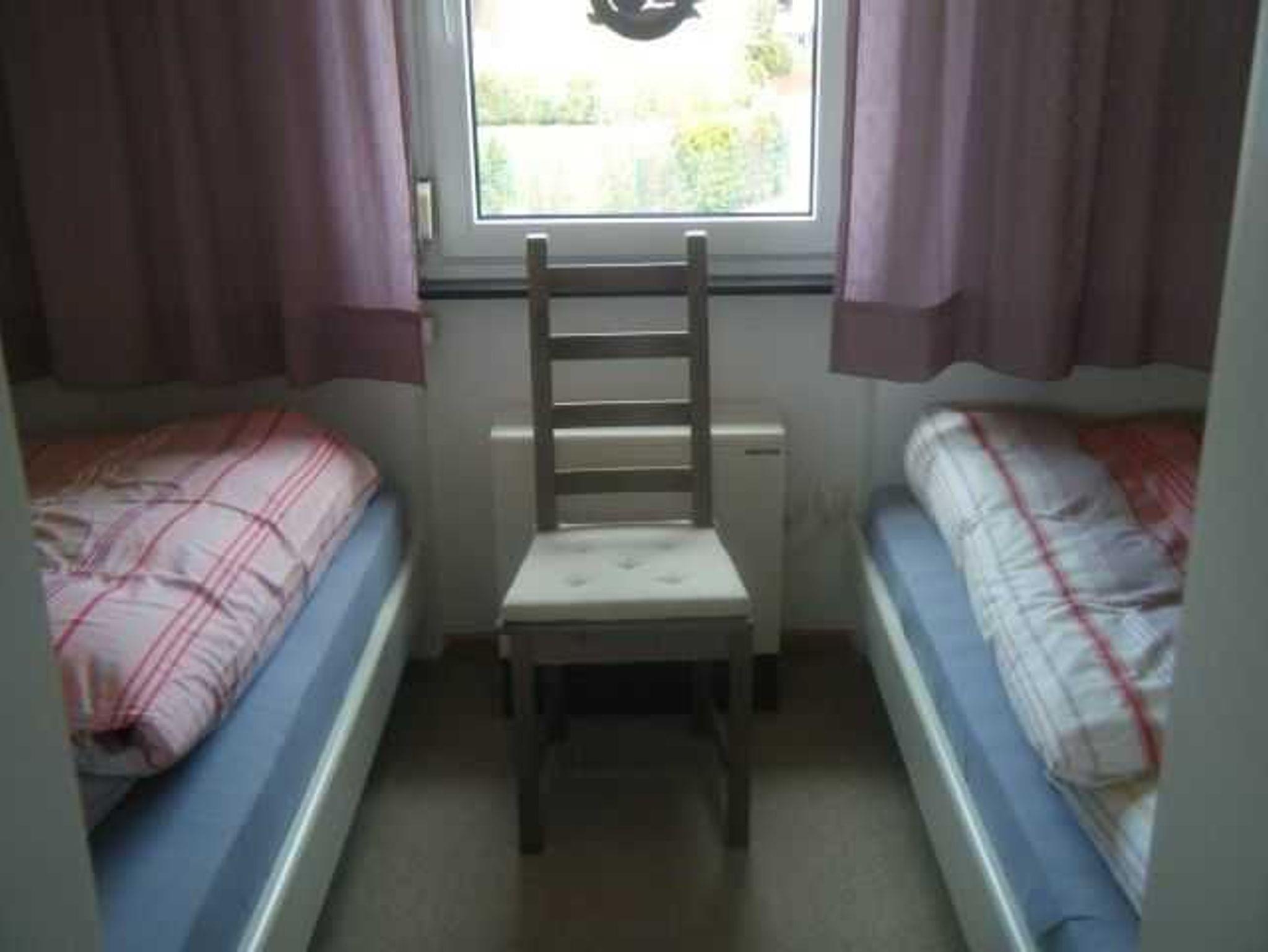 Im Ferienhaus Haus Noorblick befindet sich ebenerdig ein Schlafzimmer mit 2 Betten und der Zugang zur Terrasse und dem Garten, sowie ein Gästebad und ein Hauswirtschaftsraum mit Wach- und Trockenmaschine, sowie einer Tiefkühltruhe.