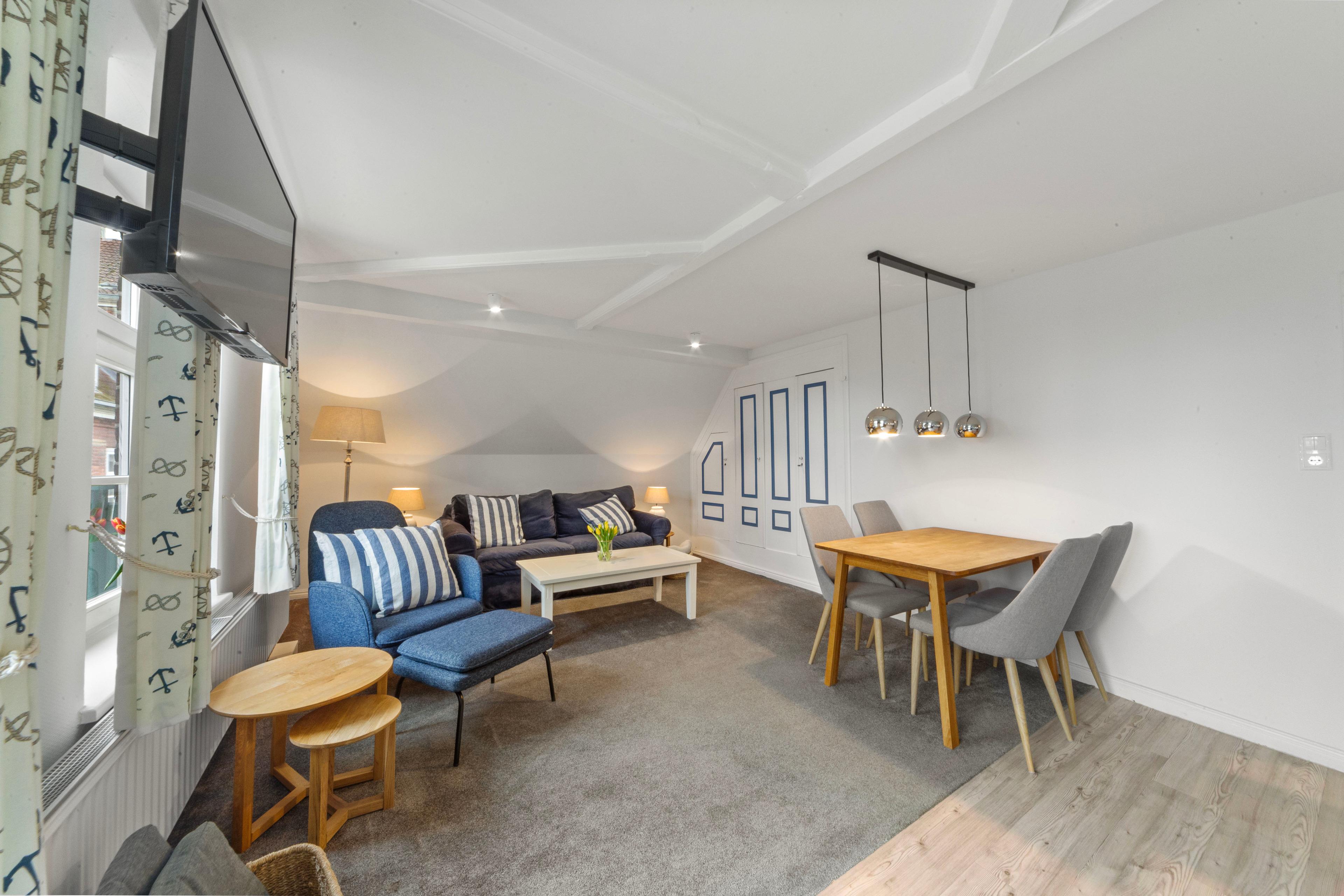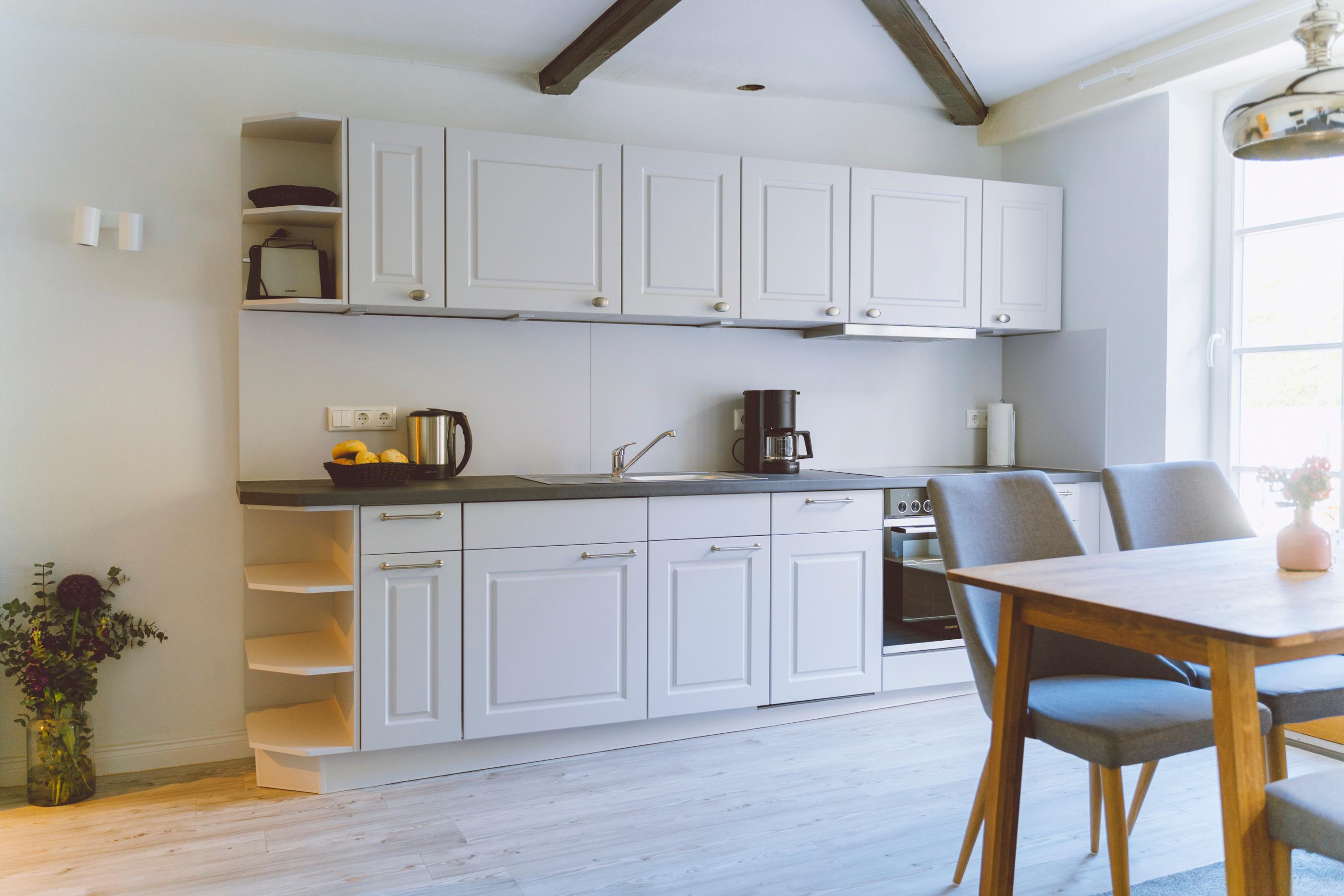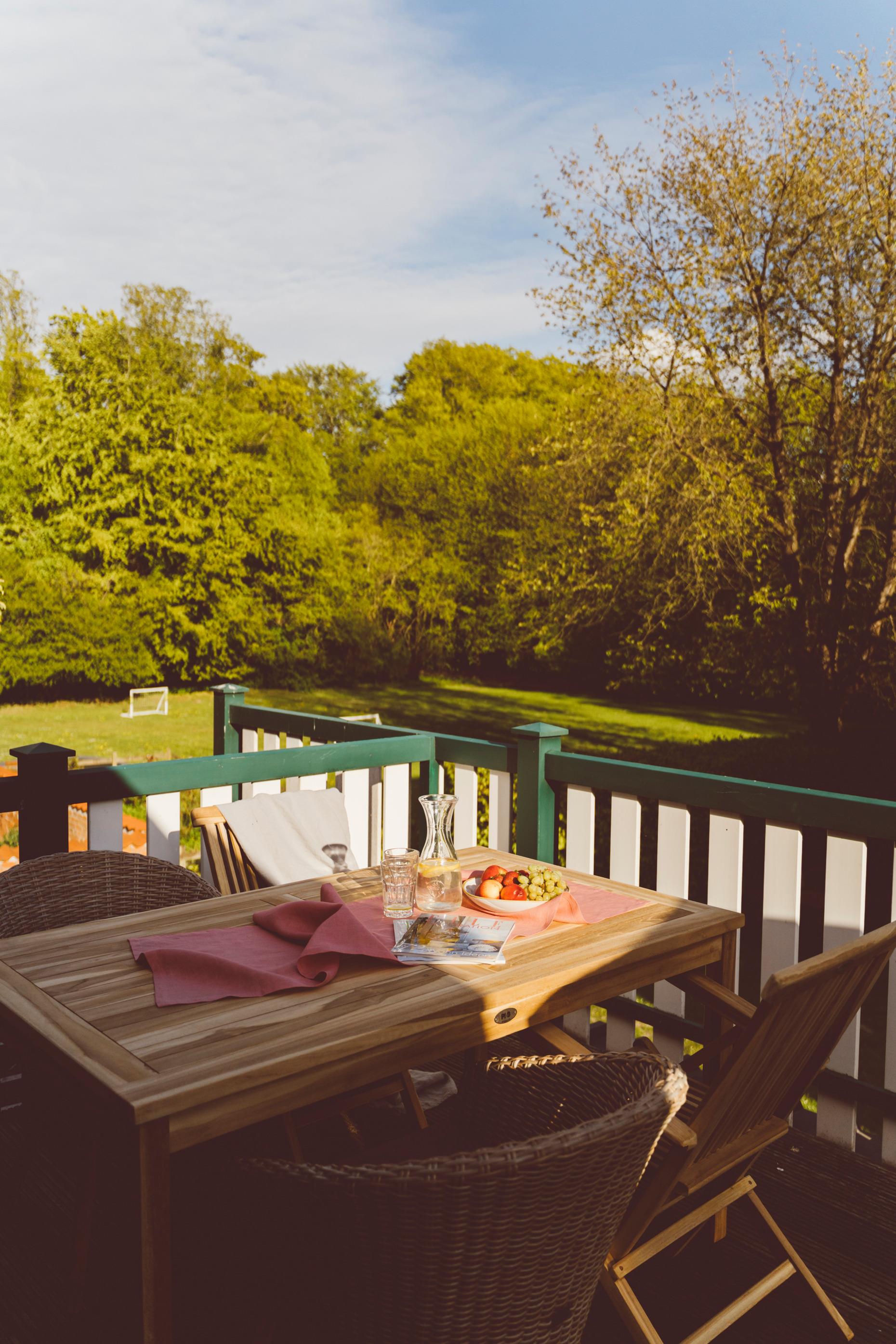 Stilecht für Ihren Urlaub: Ein eigener Strandkorb auf dem Balkon, um zu zweit darin zu sonnen oder zu lesen. Die Möblierung lädt an schönen Tagen auch zum Frühstück oder Mittagessen nach draußen ein. Mit Süd-Blick auf den Gutspark. Oder machen Sie es sich im Wohn- und Essbereich heimisch.