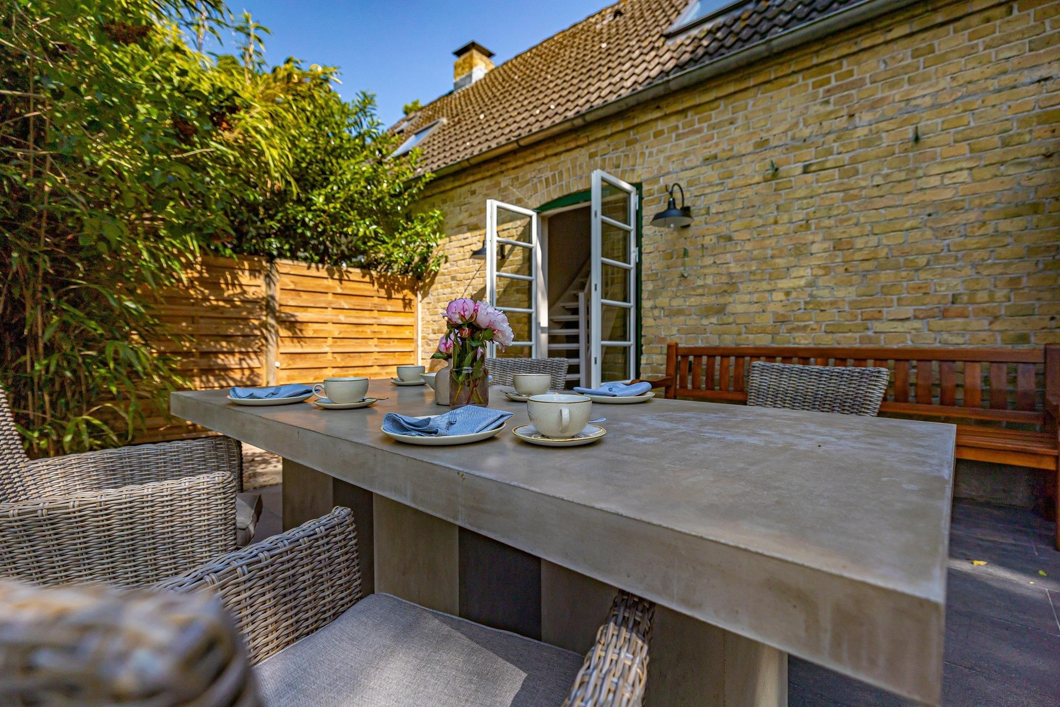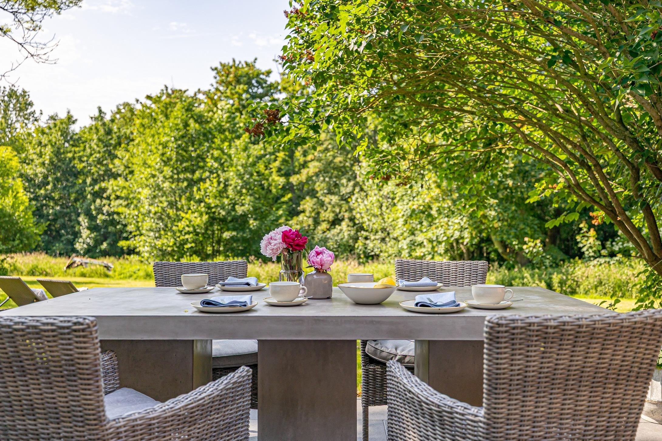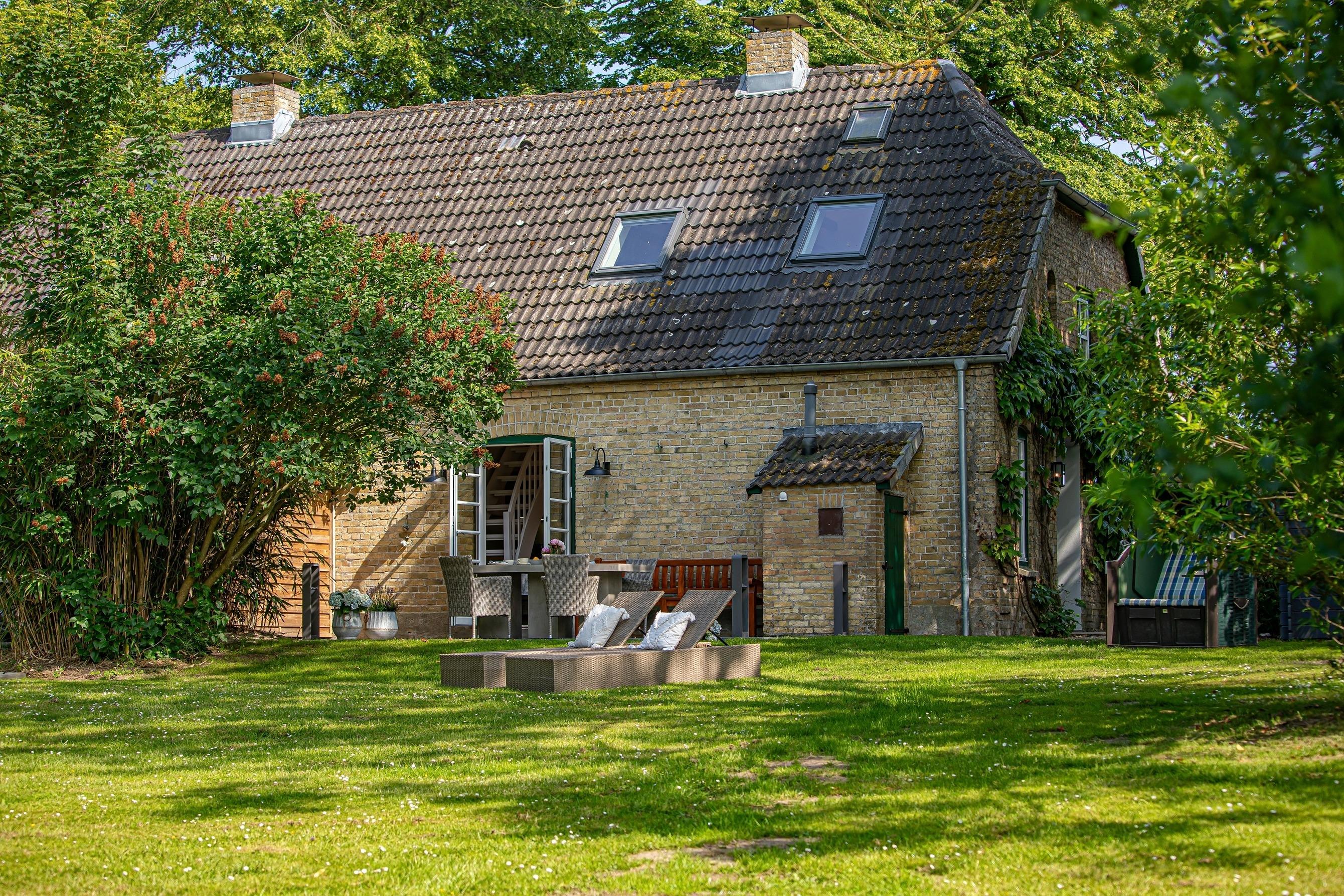 Strandnahe, wunderschöne neue und komfortable Ferienwohnung im ehemaligen Gutsgebäude des Gut Oehe bei Maasholm mit Süd-West-Terrasse, freiem Blick ins Grüne, gehobener Ausstattung und viel Rasen zum Toben und Spielen.
