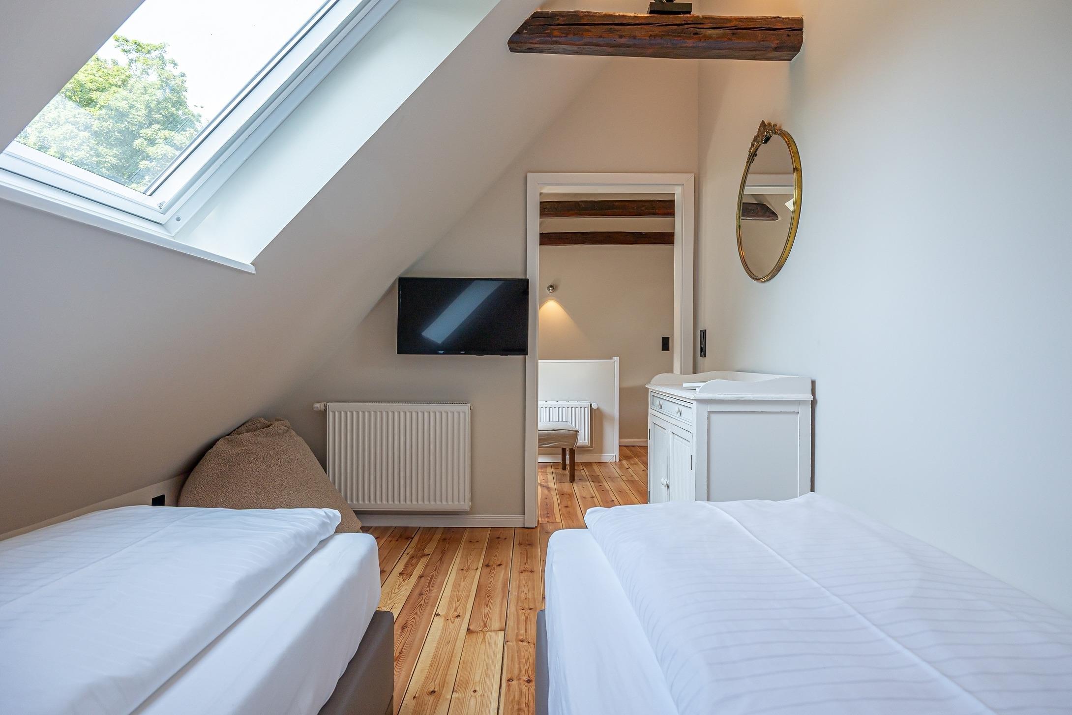 - 2 Schlafzimmer im Obergeschoss (1x Doppelbett (180 x 200 cm) und TV / 2x Einzelbetten (je 90 x 200 cm) und TV)