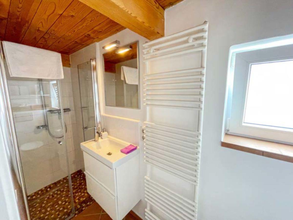 Das moderne Badezimmer mit ebenerdiger Dusche grenzt direkt an den Wohnbereich.