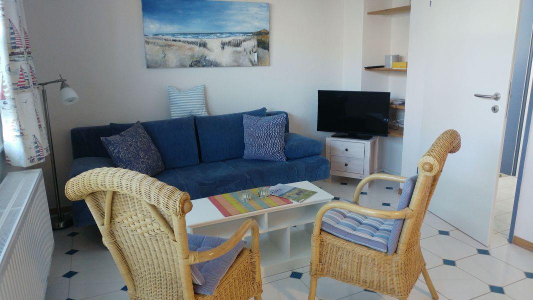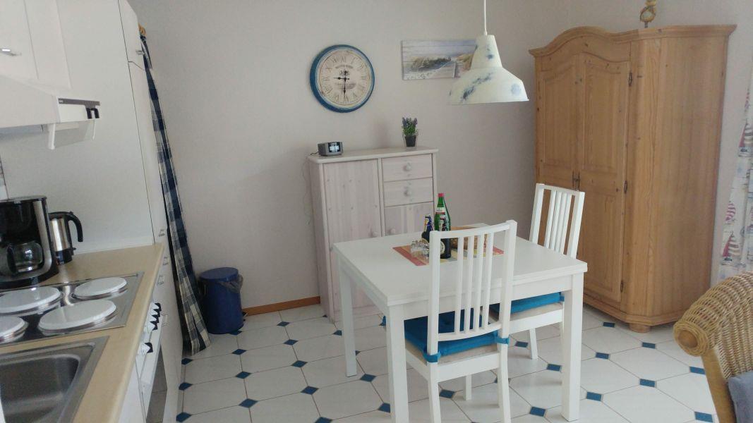 Das Wohn-und Esszimmer mit integrierter, voll ausgestatteter Küchenzeile ist funktional und doch gemütlich eingerichtet und verfügt über einen Ausgang zur wohnungseigenen großen Südwest-Terrasse mit kleiner Pforte in den vollständig eingezäunten,mit der Nachbarwohnung gemeinschaftlich genutzten Garten, sodass sich unsere Gäste mit Hund entspannt zurücklehnen können und nicht befürchten müssen, dass sich Ihr Vierbeiner eigenständig in der Nachbarschaft umschaut.