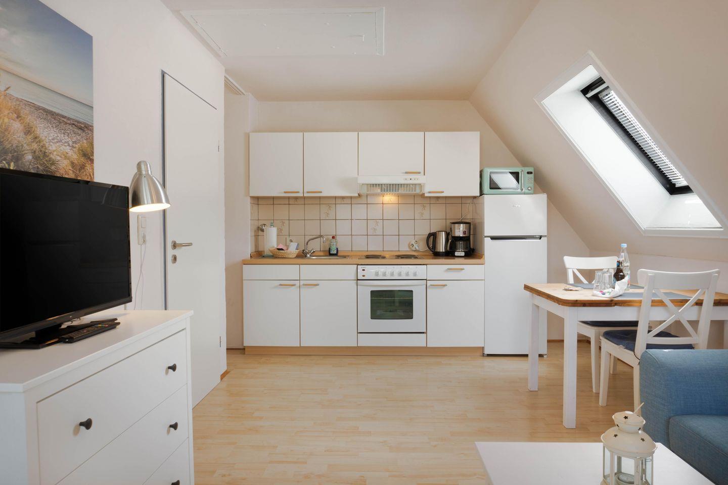 Das Wohn-und Esszimmer mit integrierter Küchenzeile ist funktional und doch gemütlich eingerichtet und verfügt über einen Ausgang zum wohnungseigenen Balkon.