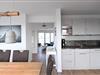 Sommerhusets opholds-/spisestue er oversvømmet med lys og har panoramavindue fra gulv til loft, der fører til de tilstødende terrasser på begge sider. Fantastisk udsigt åbner op på terrassen ved siden af ??spisepladsen med udsigt over sejl- og lystbådshavnen