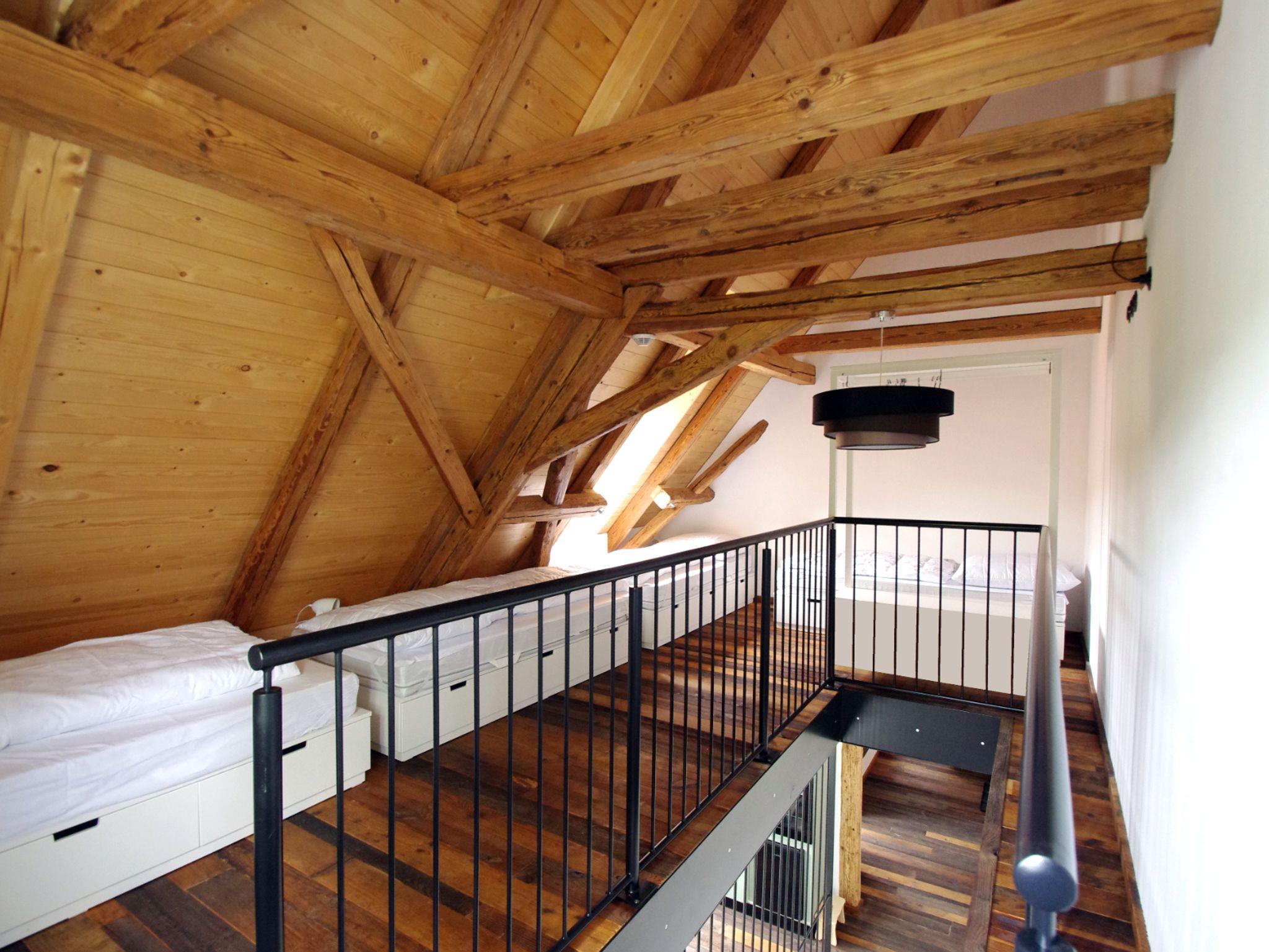 Unsere Ferienwohnung mit rund 70 Quadratmetern bietet Platz für jeweils sechs Personen. Sie verfügt über ein separates Schlafzimmer für zwei Personen sowie vier Betten im ausgebauten offenen Dachboden. Zur Ausstattung gehören eine Küchenzeile mit Essbereich, ein Wohnbereich mit Fernseher, Internetanschluss und ein Bad.