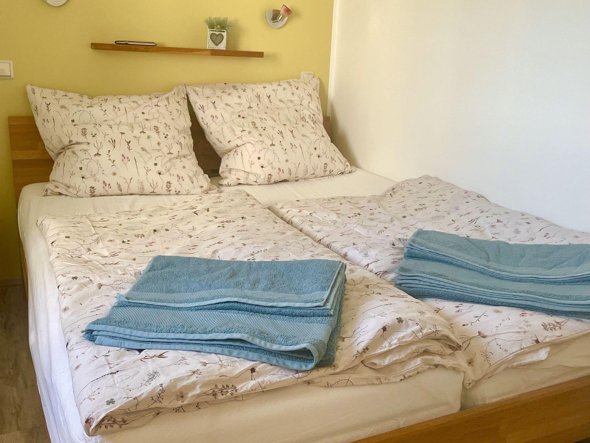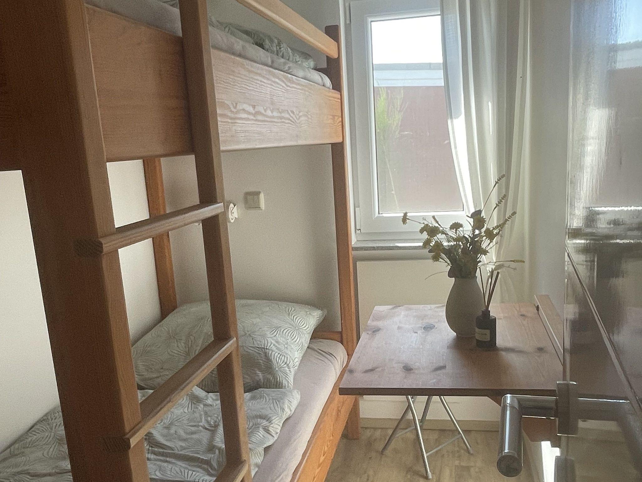 Vom Wohnbereich gelangen Sie in die Schlafzimmer: Das Hauptschlafzimmer verfügt über ein komfortables Doppelbett und Blick auf die Terrasse, ein kleiner Kleiderschrank sorgt für Ordnung. Das zweite Schlafzimmer ist ideal für Kinder oder weitere Gäste und bietet ein Etagenbett, einen klappbaren Tisch sowie einen Kleiderschrank mit Blick in den Garten. Beide Schlafzimmer sind mit pflegeleichtem Vinylboden ausgestattet.