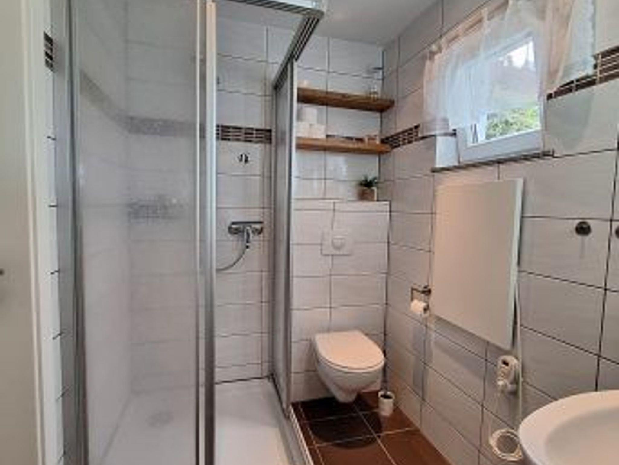 Das Badezimmer ist kompakt, modern und funktional eingerichtet, mit Dusche, WC und Fenster, das für Helligkeit sorgt. Angrenzend befindet sich ein praktischer Abstellraum, komplett gefliest und mit Schrank, von dem aus Sie direkt in den Garten gelangen.