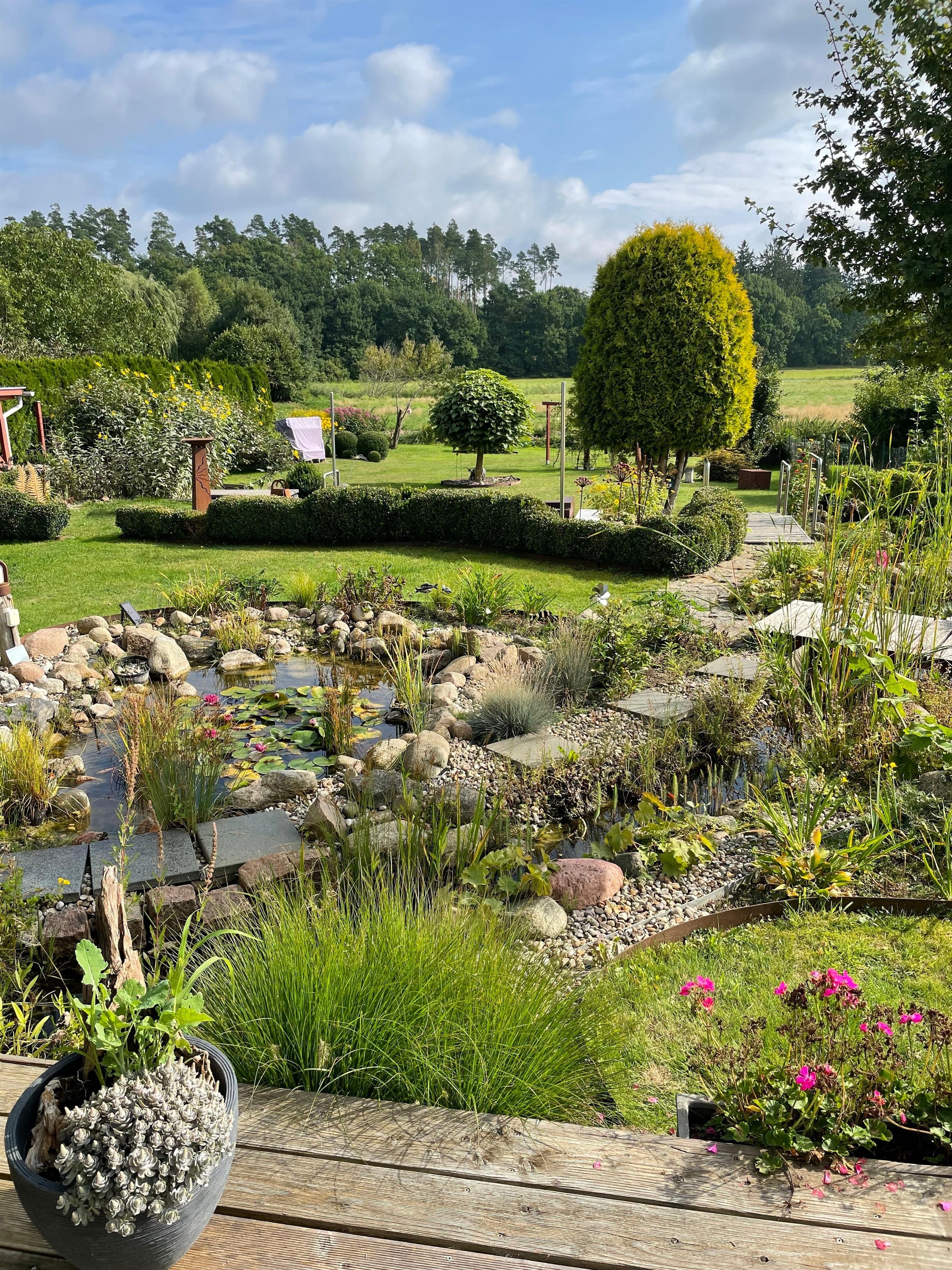 Die 20 m² große, zur Südwest- und Vorderseite ausgerichtete Terrasse ist mit einer einladenden Sitzgruppe und einem privaten Strandkorb ausgestattet. Sie bietet den idealen Rahmen, um den Tag bei einem Glas Wein in der Abendsonne ausklingen zu lassen. Im weitläufigen Garten mit Blick auf Wiesen und Wälder stehen Ihnen zudem bequeme Liegestühle und eine stilvolle Lounge-Terrasse zur freien Nutzung bereit – perfekte Orte, um die Seele baumeln zu lassen.