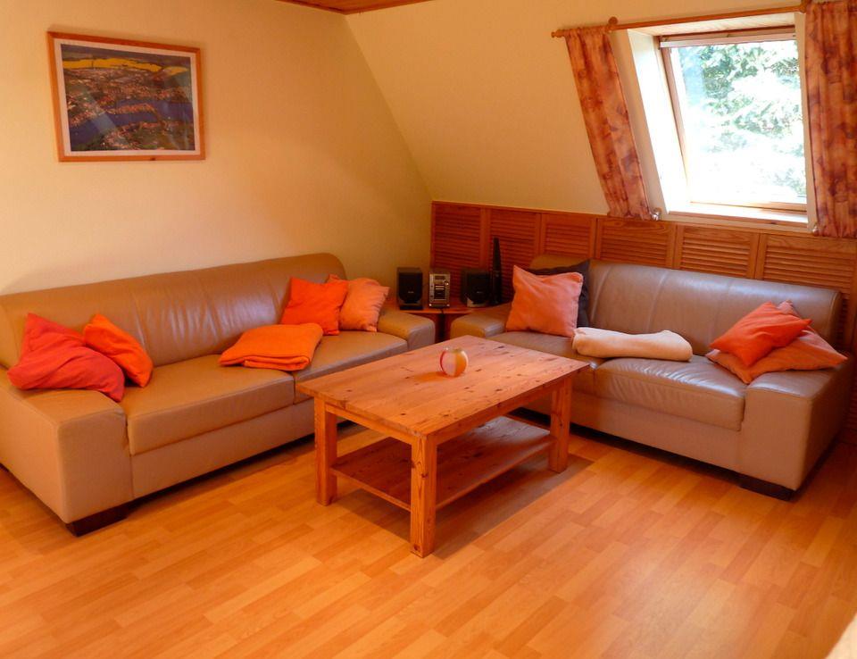 Das Wohnzimmer hat eine offene Küche, die mit einem Backofen und 4 Kochplatten, einer Mikrowelle, einem Geschirrspüler, einem Kühlschrank mit Tiefkühlfach, einer Kaffeemaschine, einem Wasserkocher, einem Toaster und einer Waschmaschine ausgestattet ist. Ein Tresen als Esstisch grenzt die Küche vom Wohnbereich ab. Das Wohnzimmer ist eingerichtet mit zwei Couchen, einem kleinen Tisch und dem Fernseher.